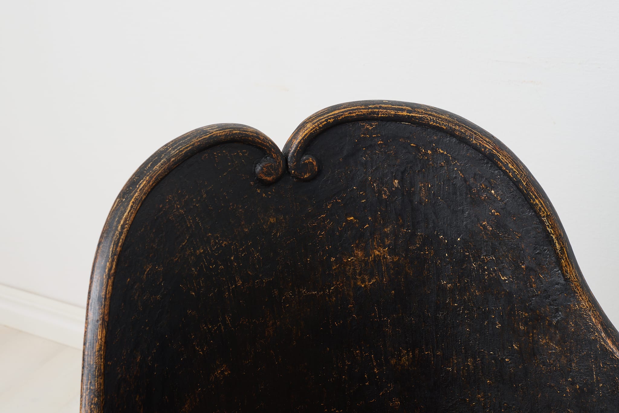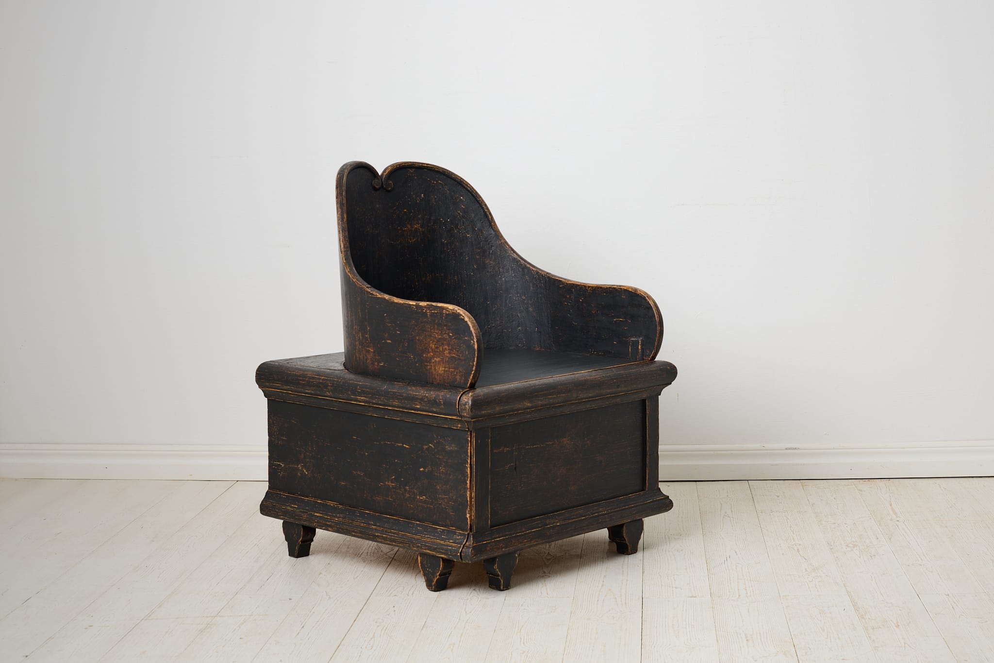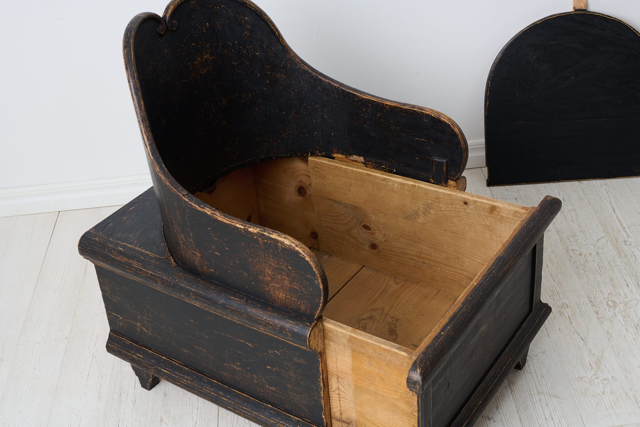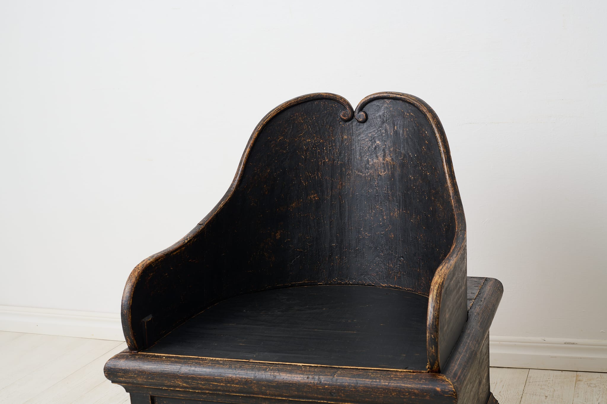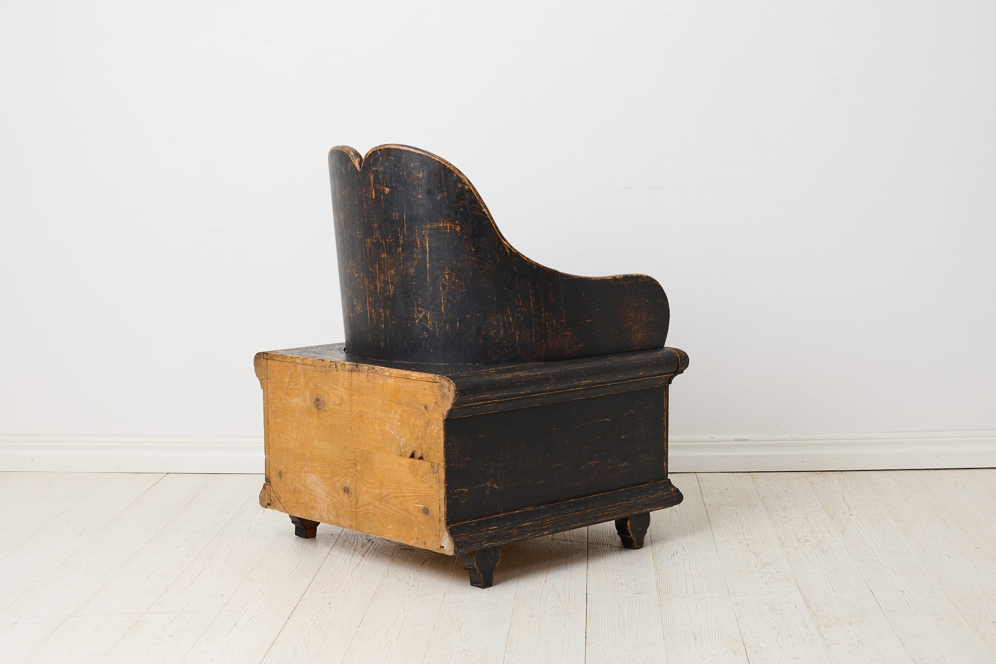 19th century unusual chair in folk art from northern Sweden. This is antique chair is made by hand in solid pine around 1850. Unique model with a curved back and storage underneath the seat. Later paint with distress and patina. Healthy and solid frame.