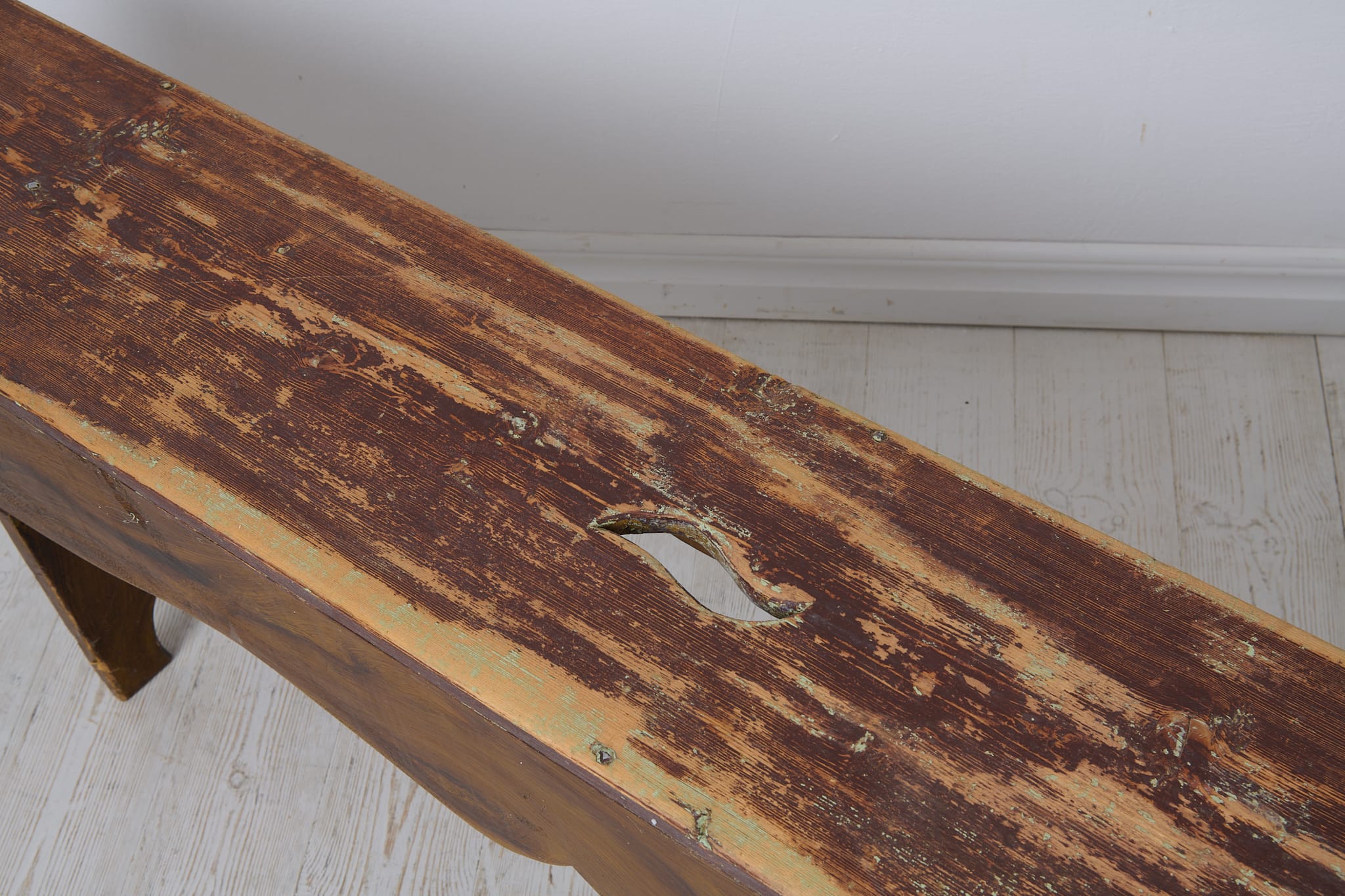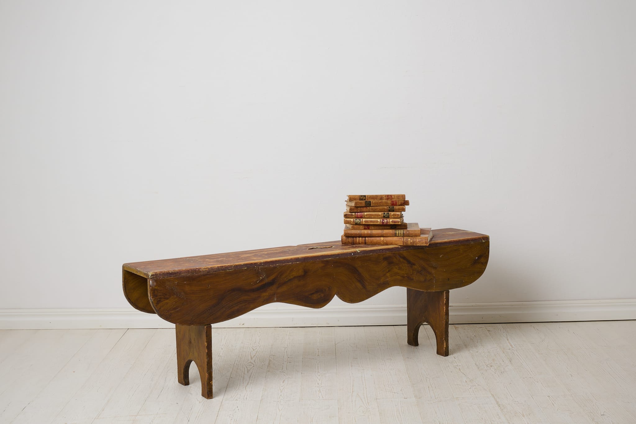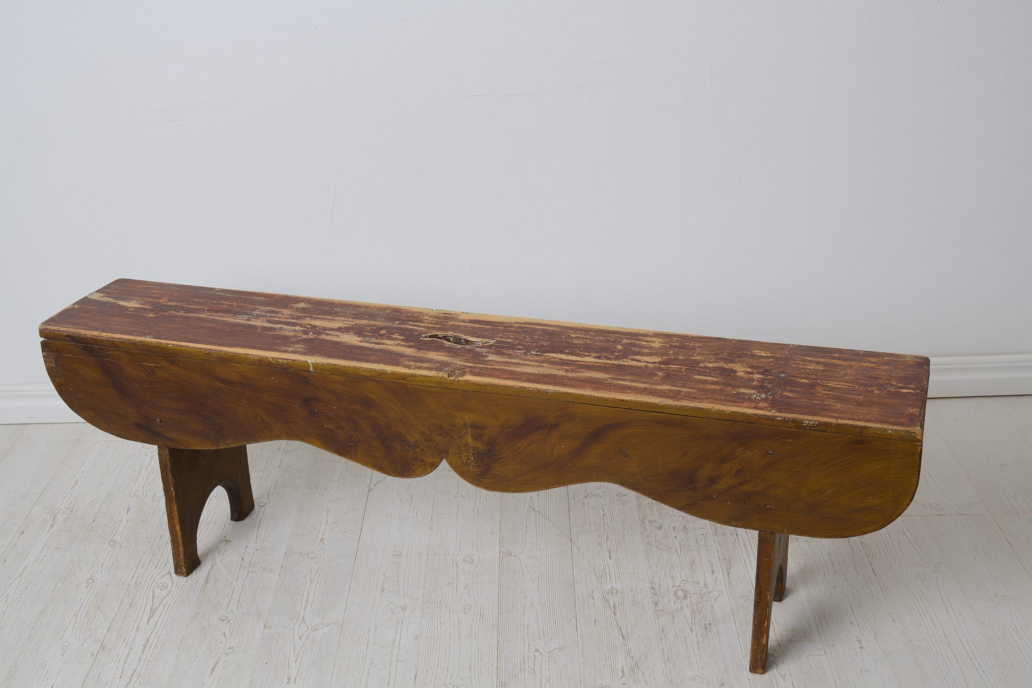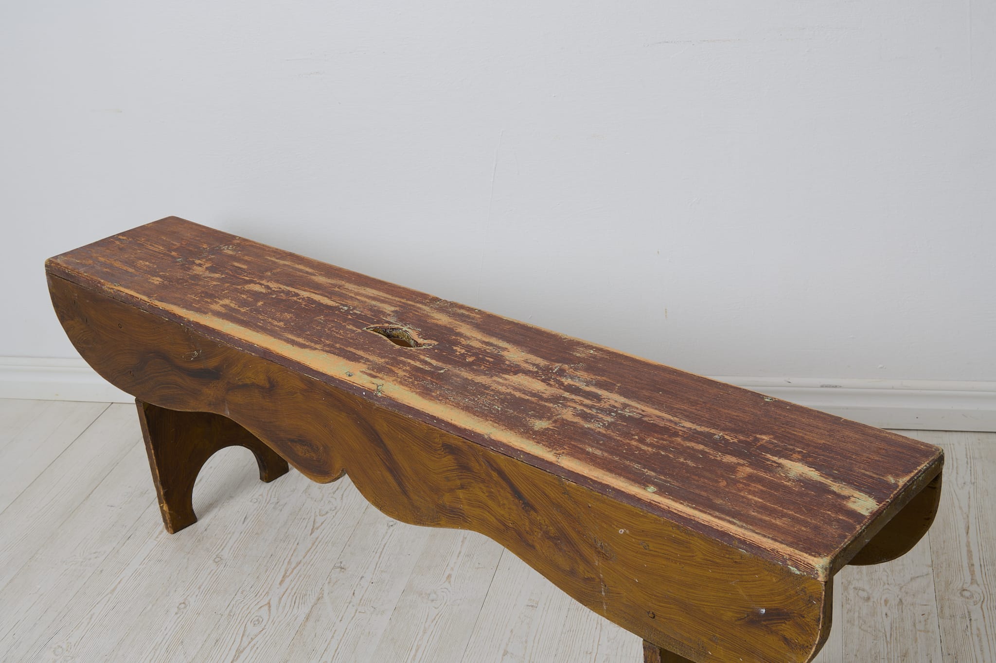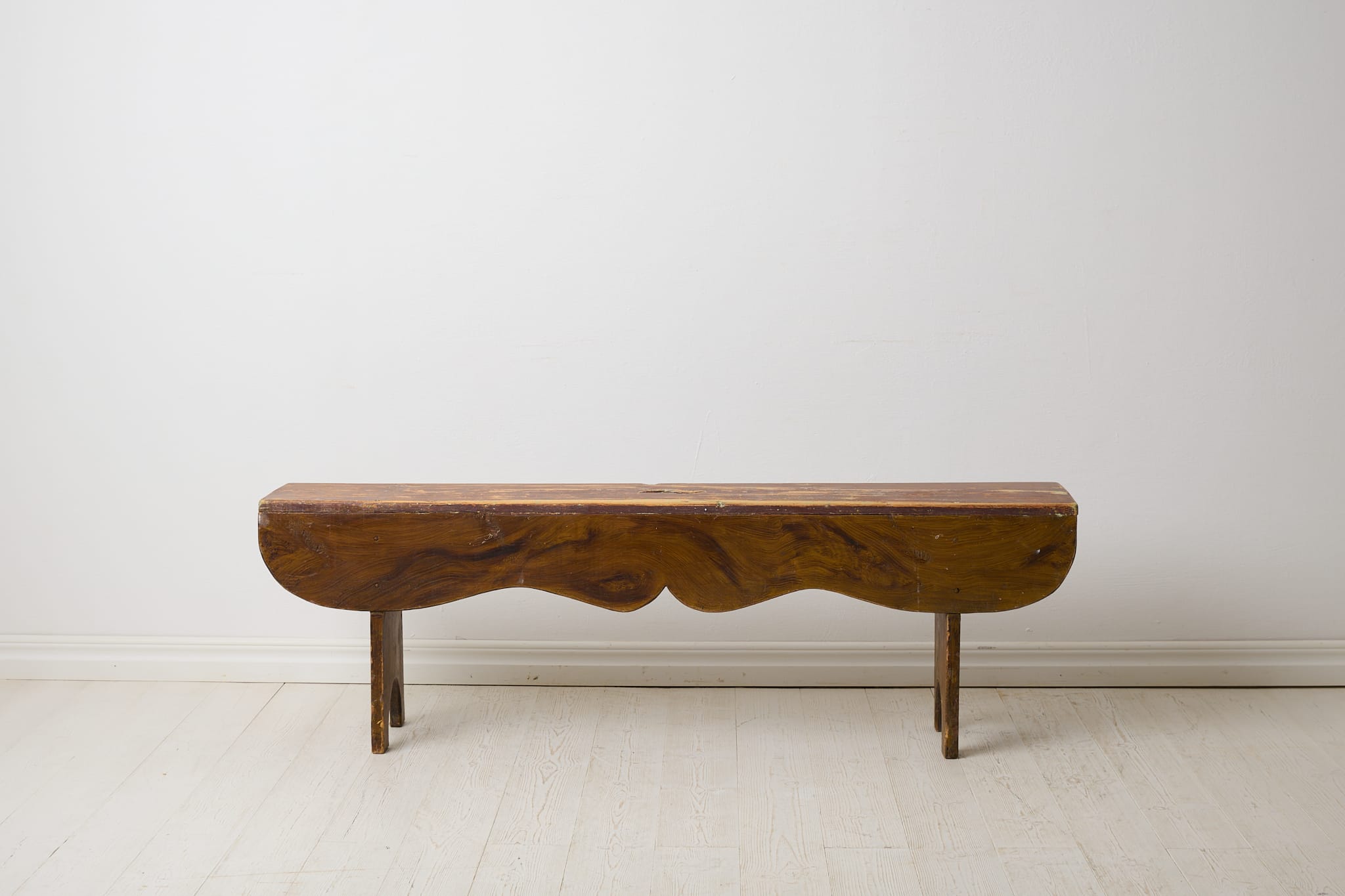 Antique country house bench from northern Sweden made around 1880. Unique and made by hand in solid pine. Original faux paint which is an imitation of walnut. The paint on the seat is especially distressed. Healthy and stable, fully functional.
