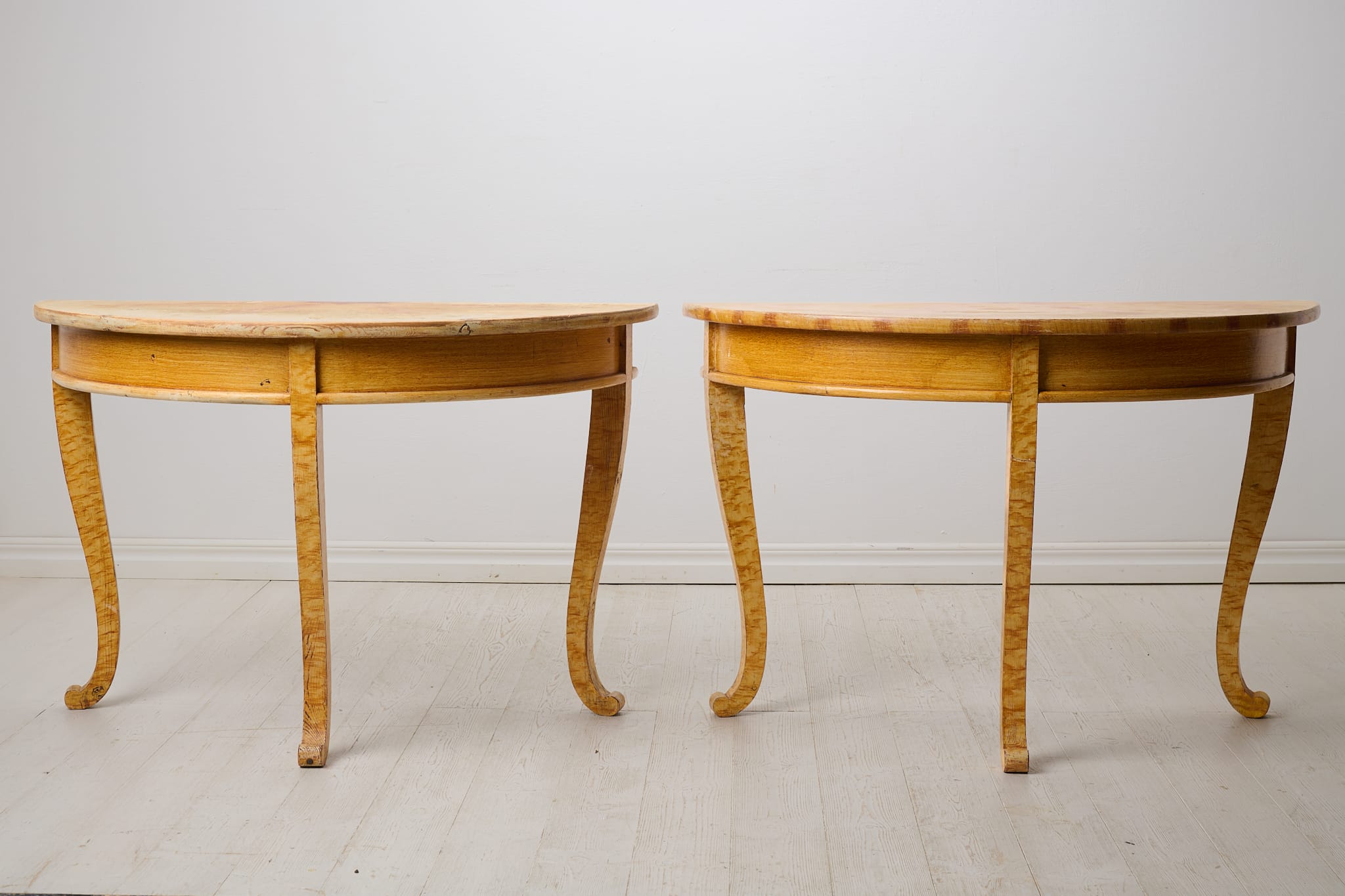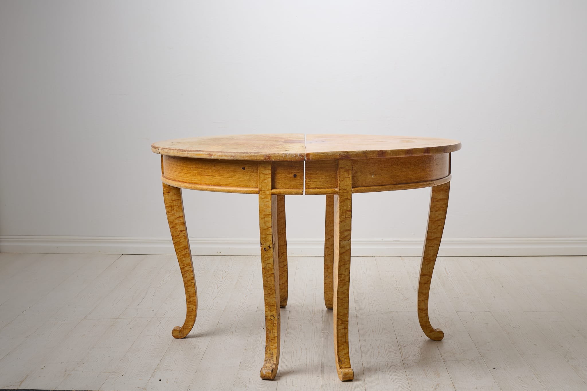Antique demi-lune table from Sweden. The table consists of two half-circles, or demi-lunes, made by hand in solid pine in northern Sweden around 1840. Unusual curved legs in baroque style. The table is untouched and has its original first layer of naive faux paint – imitating birch. One half has more distress to the paint of the table top than the other, see pictures. The tables are freestanding and can be used both separately, as console tables, or together as for example a dining table. Healthy and solid frame. Untouched original condition means that there are some historical marks and traces of use. The diameter is 111 cm which means one demi-lune measures 111 by 55 cm.