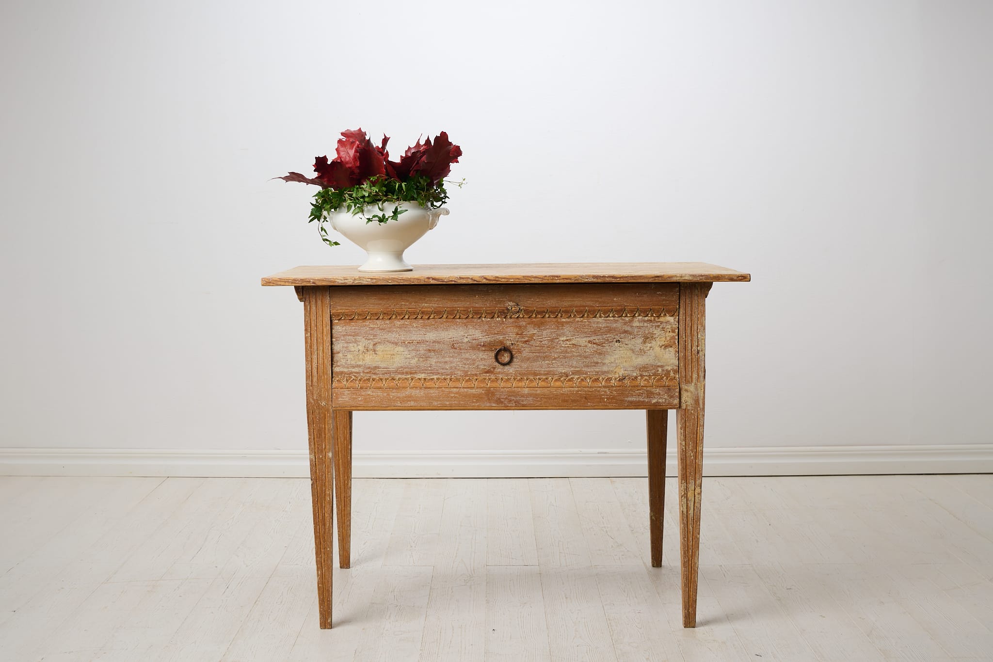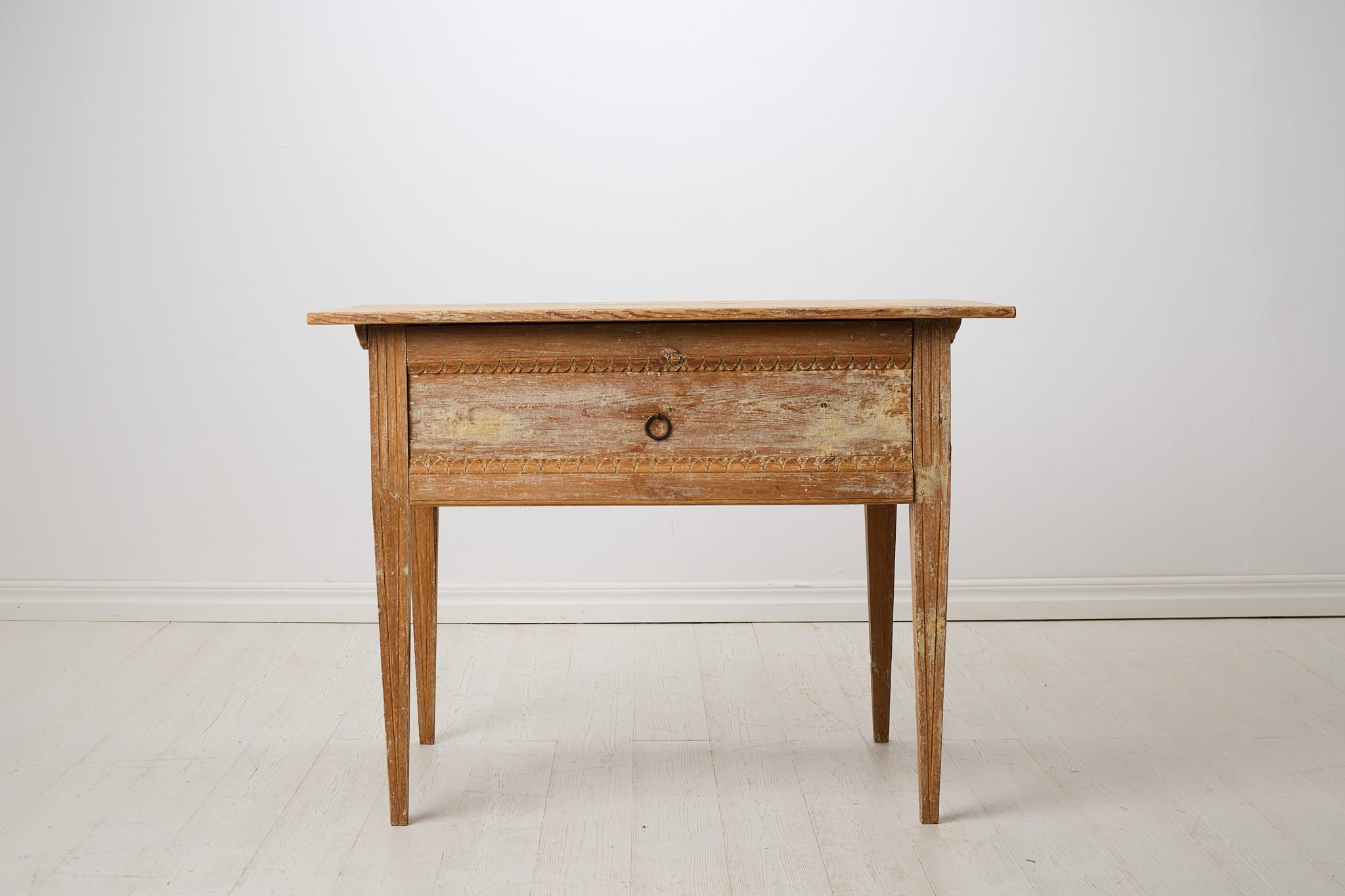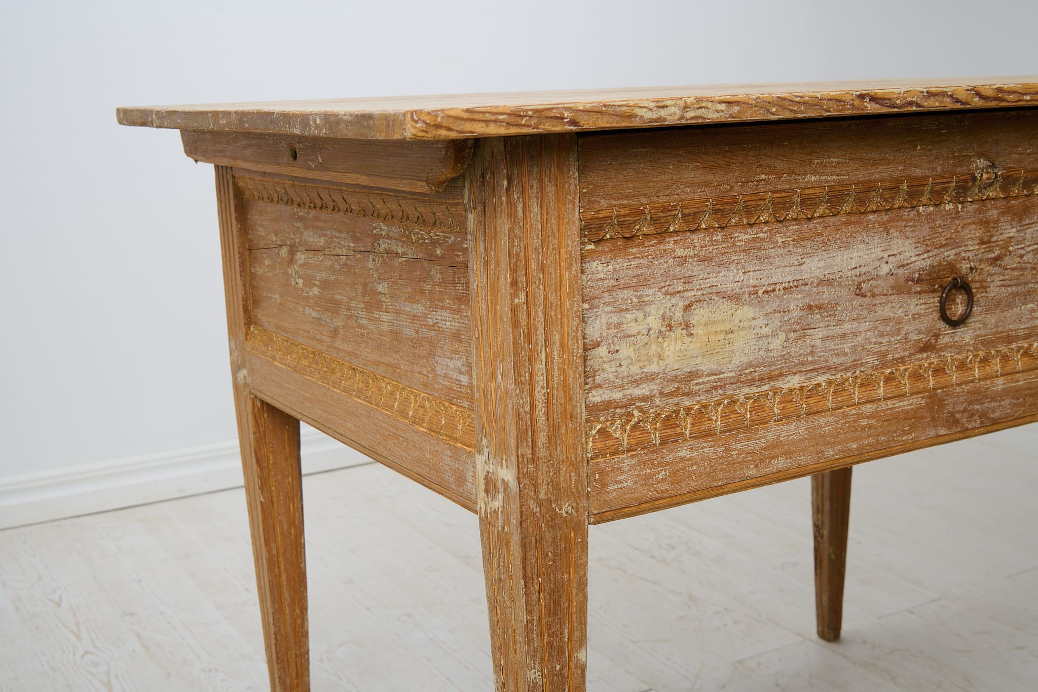 Antique genuine gustavian table made around 1820 to 1830 in Hälsingland in northern Sweden. This country house furniture has a classic straight gustavian shape with straight tapered legs with flutes as well as carved decor in the apron. Large extendable drawer. The surface is rustic with traces of the original first layer of paint and the raw pine underneath shines through where the paint is more worn. Healthy and stable frame. Height to the apron is 49.5 cm.