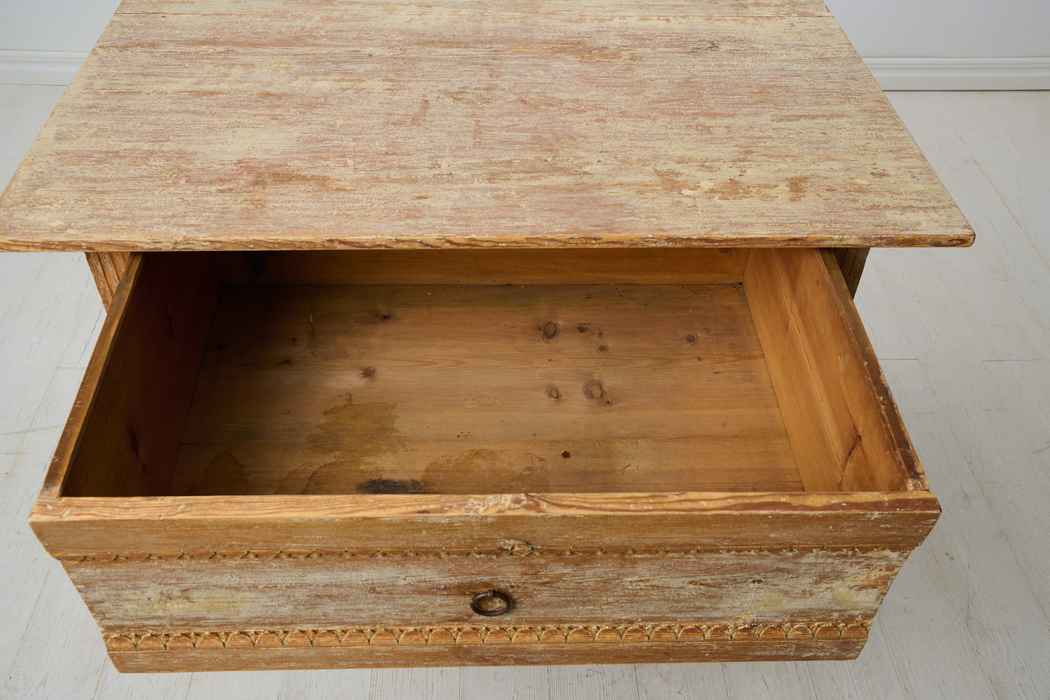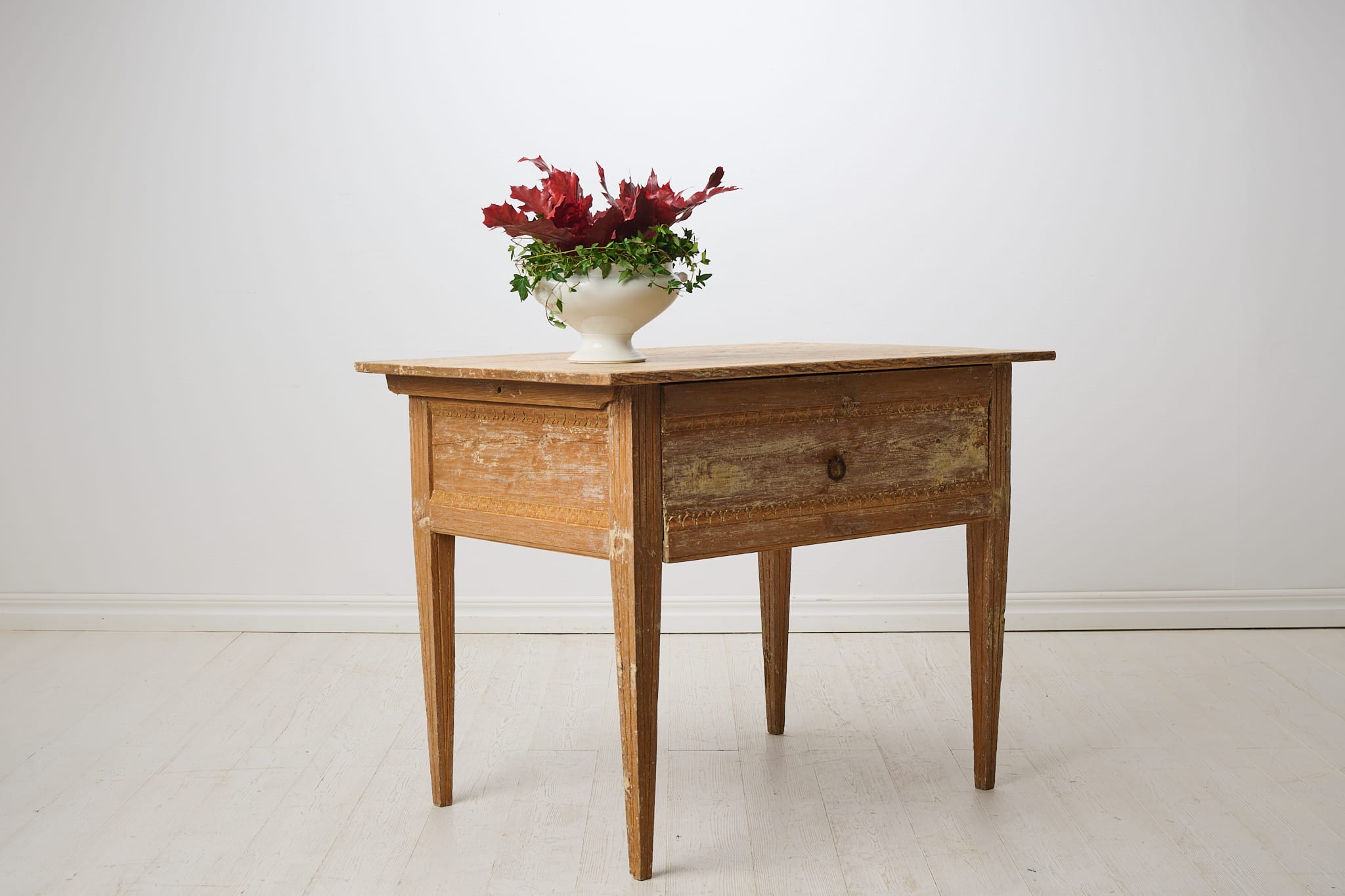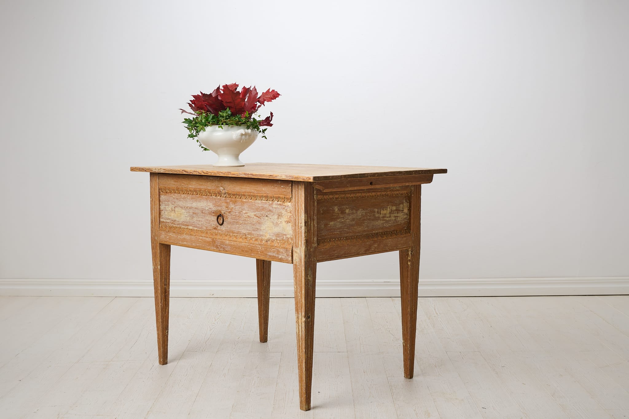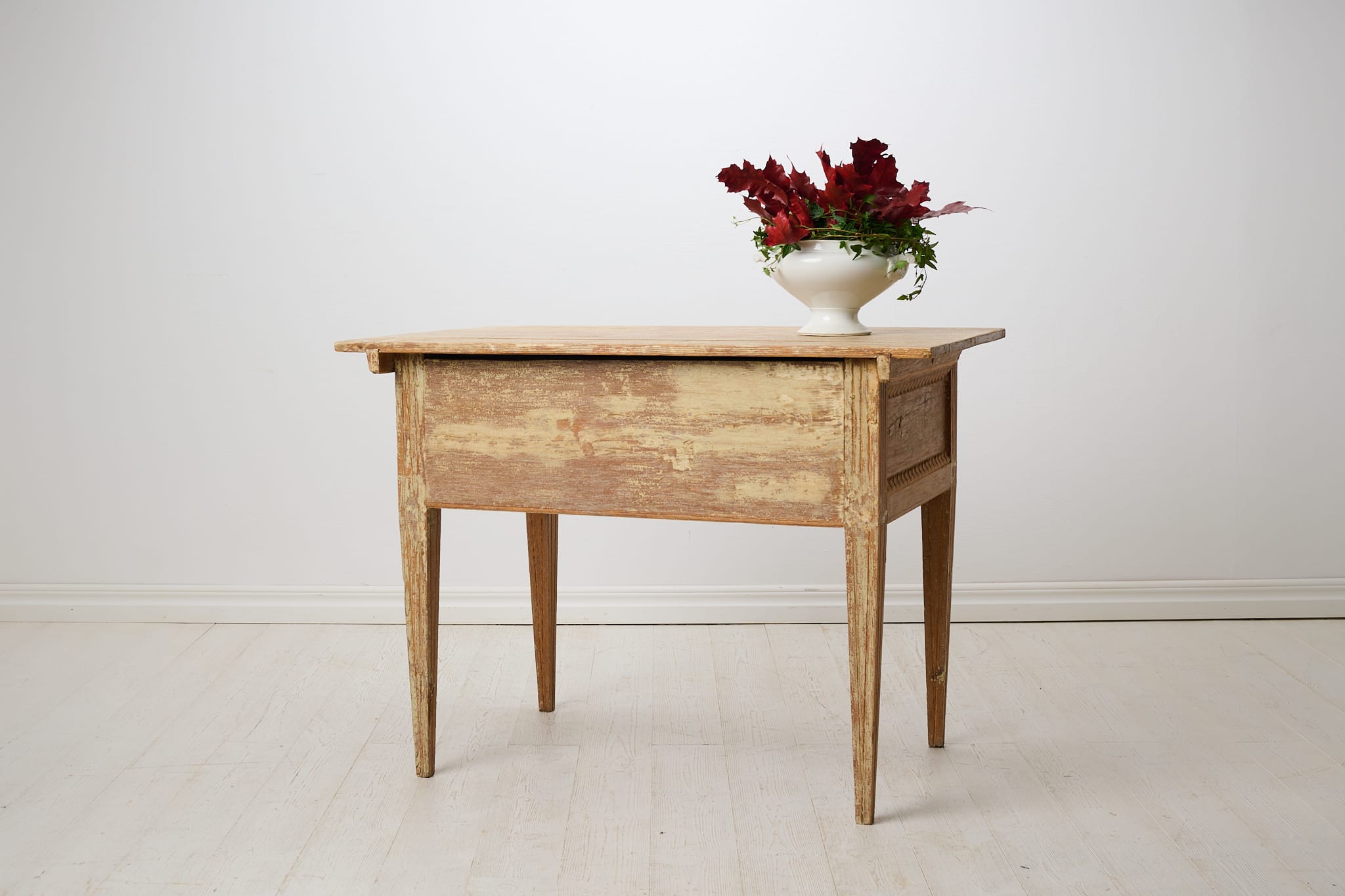 Antique genuine gustavian table made around 1820 to 1830 in Hälsingland in northern Sweden. This country house furniture has a classic straight gustavian shape with straight tapered legs with flutes as well as carved decor in the apron. Large extendable drawer. The surface is rustic with traces of the original first layer of paint and the raw pine underneath shines through where the paint is more worn. Healthy and stable frame. Height to the apron is 49.5 cm.