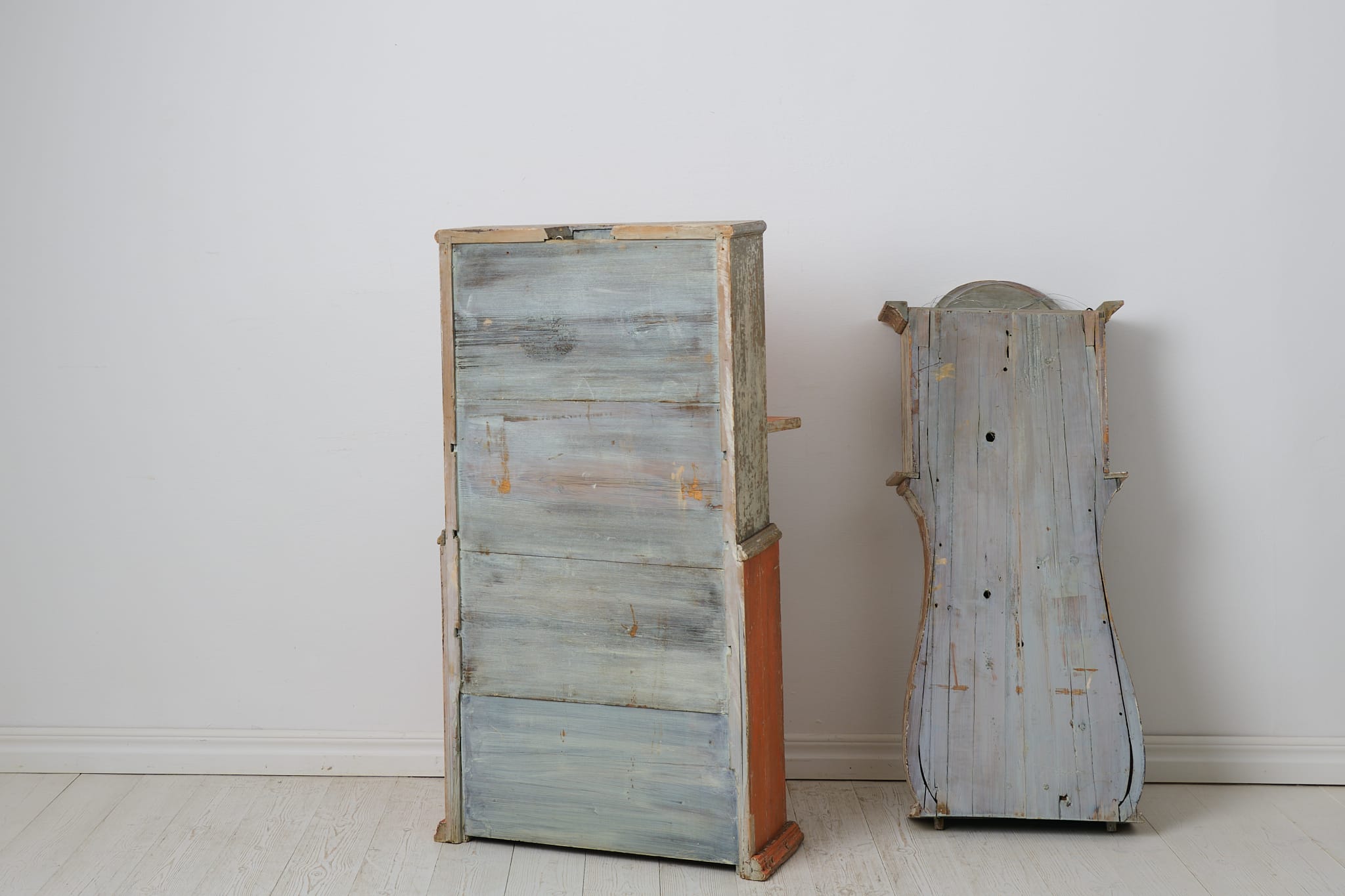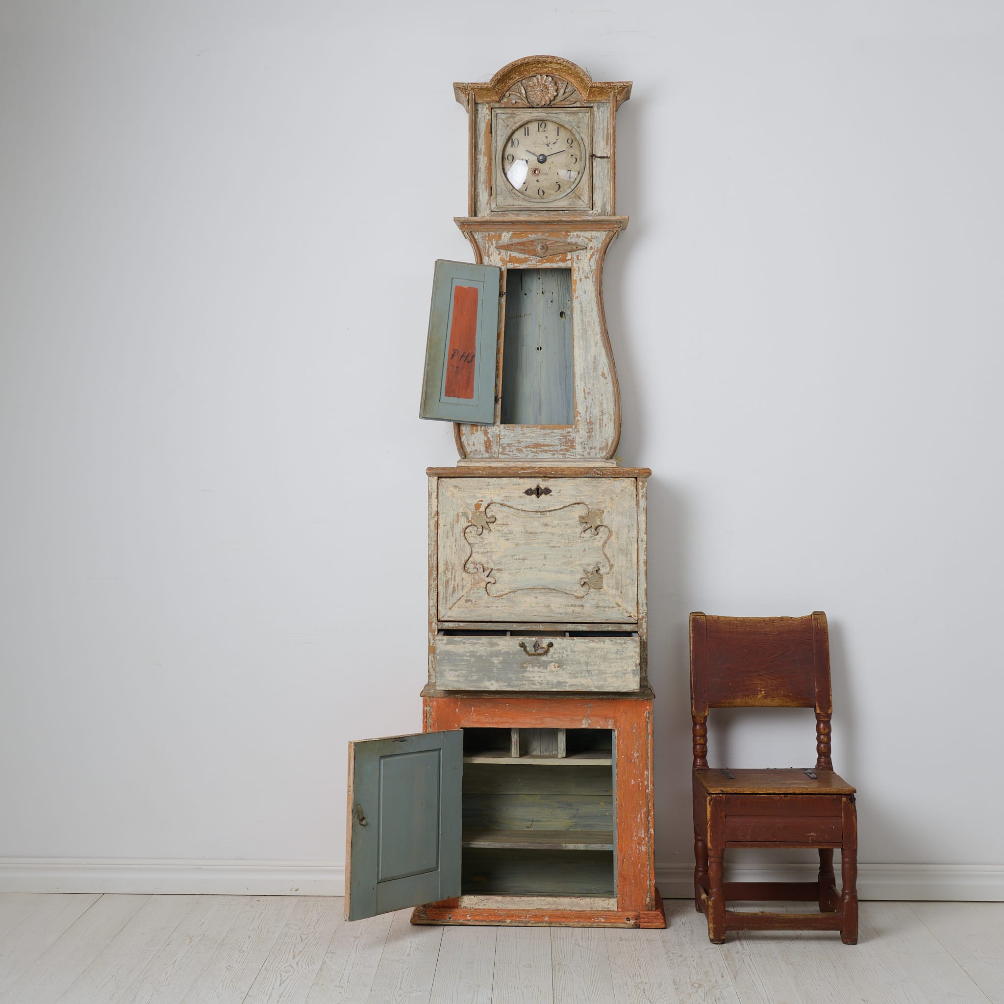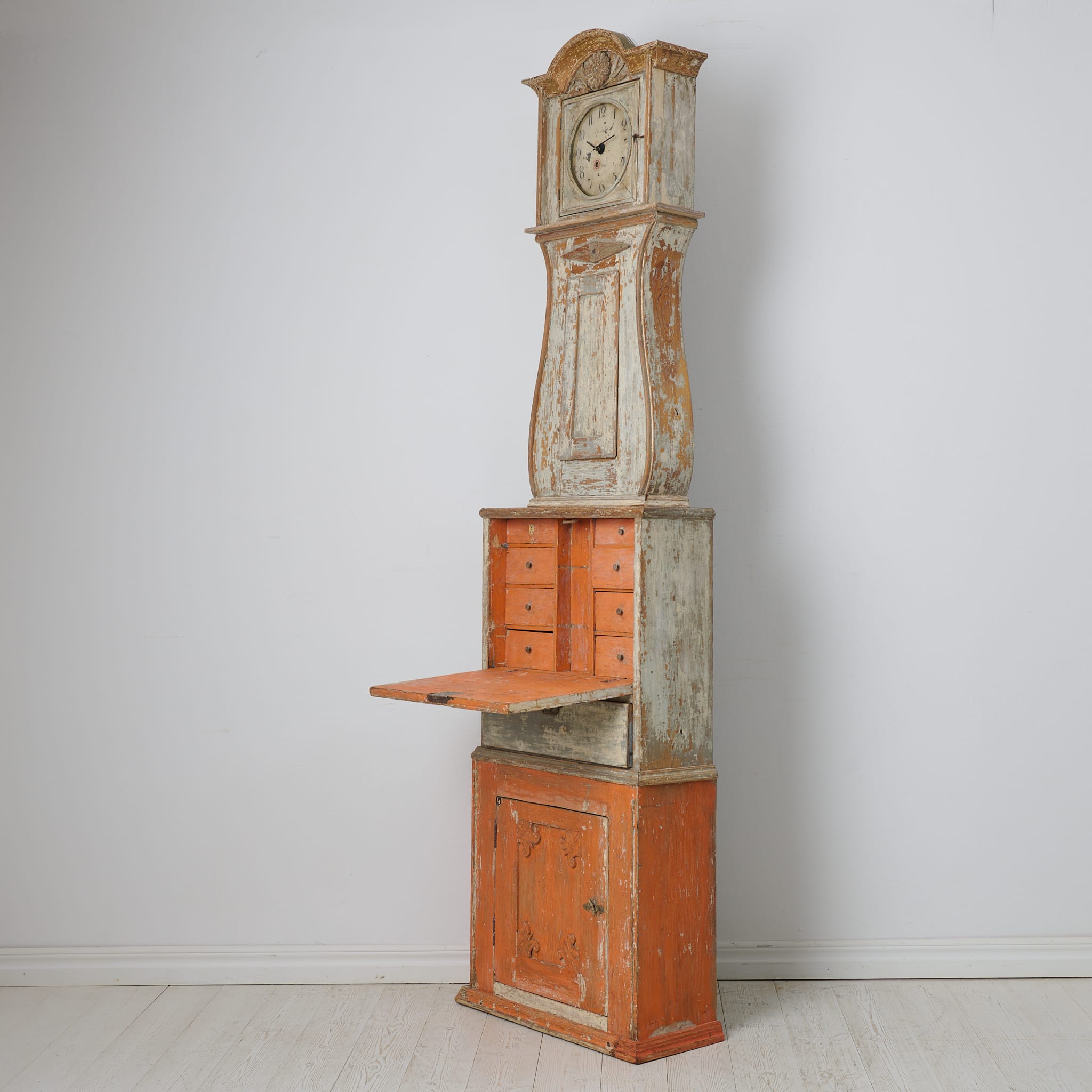 Antique longcase clock cabinet with bureau from northern Sweden around 1850. An unusual and charming example of a combined furniture where a longcase clock is combined with a writing bureau. Handcrafted and featuring an unusually slim and narrow frame constructed in two parts. The lower section with a fall-front writing flap and fitted interior with small drawers. The upper part has the clock and the original 19th-century clock face. An interesting detail is that the channel for the weights and pendulum runs through the entire cabinet and continues down into the lower part.