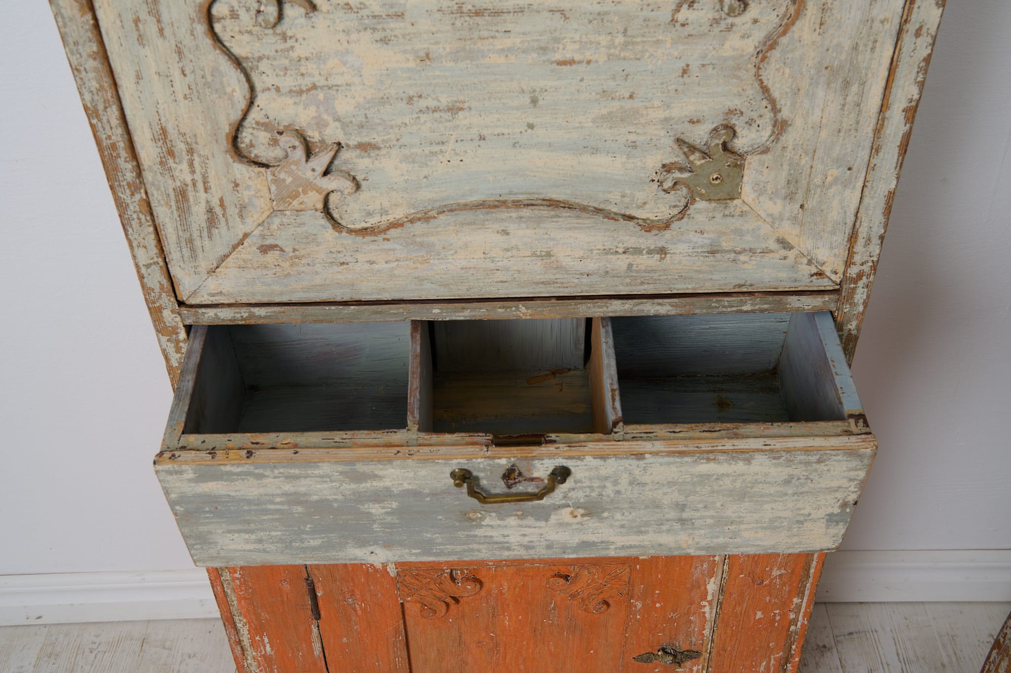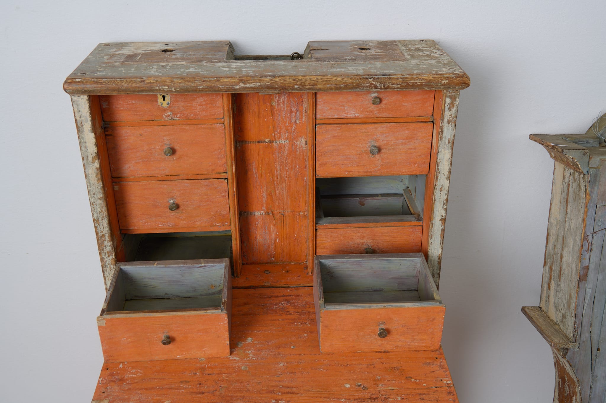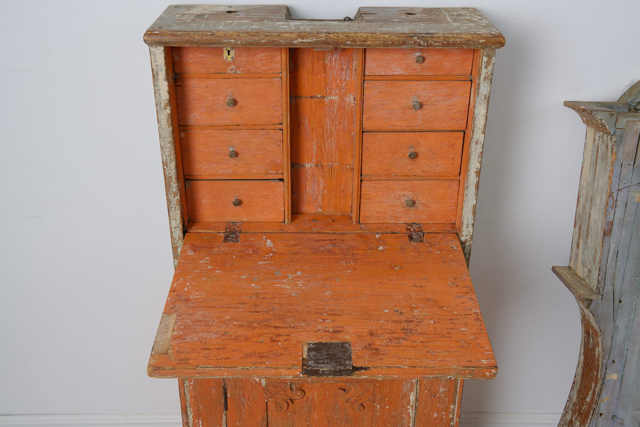 Antique longcase clock cabinet with bureau from northern Sweden around 1850. An unusual and charming example of a combined furniture where a longcase clock is combined with a writing bureau. Handcrafted and featuring an unusually slim and narrow frame constructed in two parts. The lower section with a fall-front writing flap and fitted interior with small drawers. The upper part has the clock and the original 19th-century clock face. An interesting detail is that the channel for the weights and pendulum runs through the entire cabinet and continues down into the lower part.