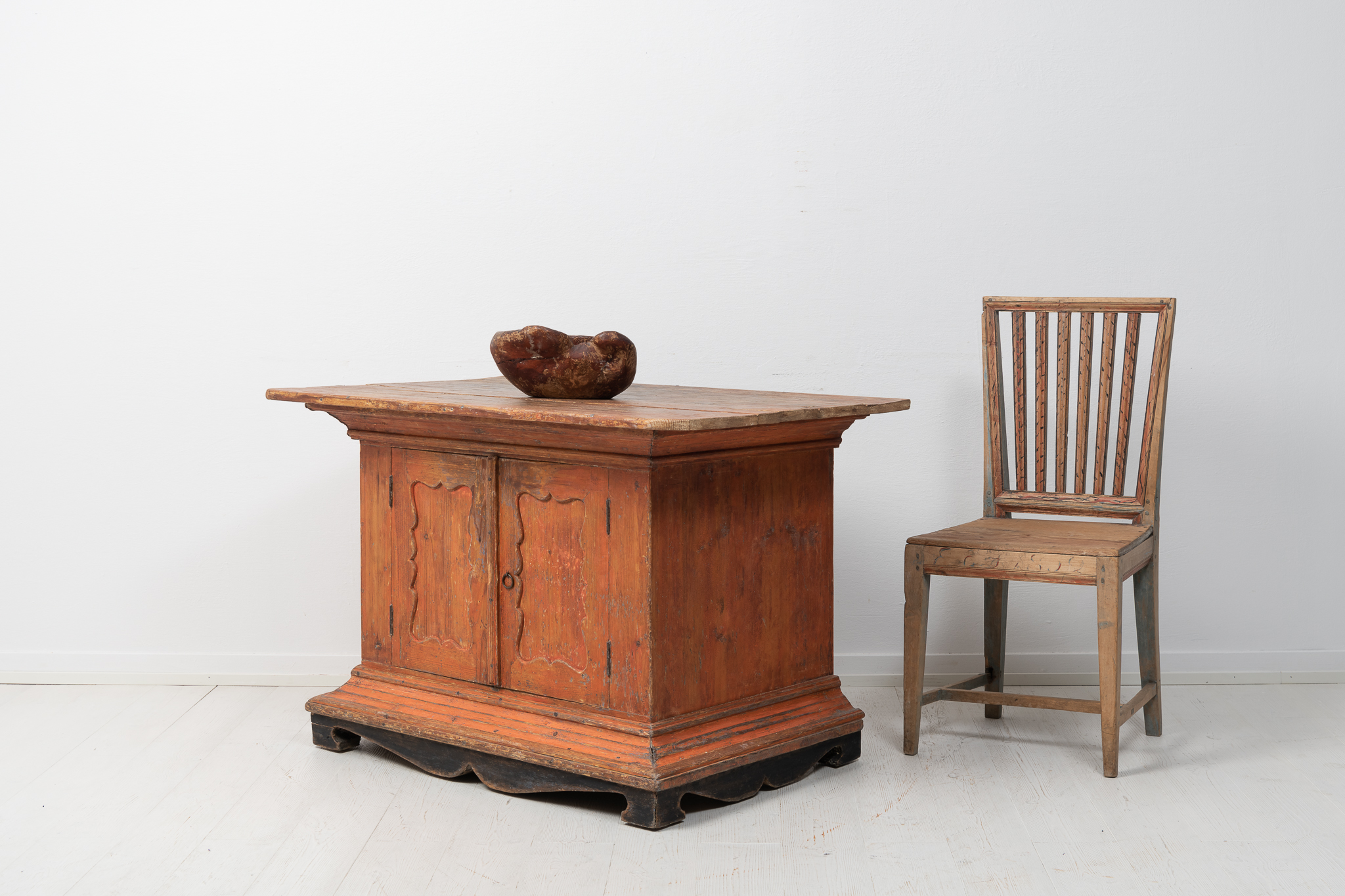 Antique rare Swedish sideboard in folk art from northern Sweden. The sideboard is from around 1810 to 1820 and is in an unusual model. The sideboard has an oversized table top and two doors as well as a strong profiled plinth. Made in painted pine with the original salmon-pink paint and blank plinth. The distress and patina are authentic to the furniture and a sign of time and use. Healthy and stable, the measurements are taken from the table top.