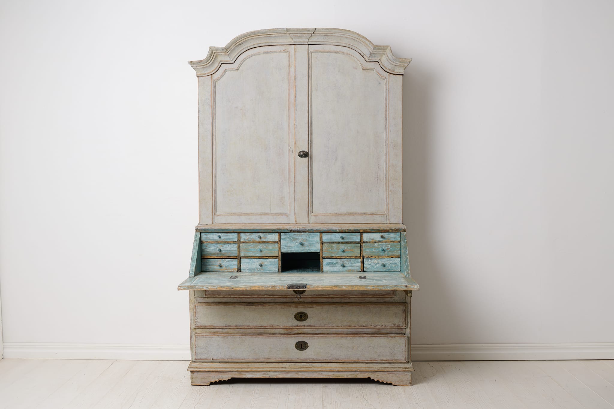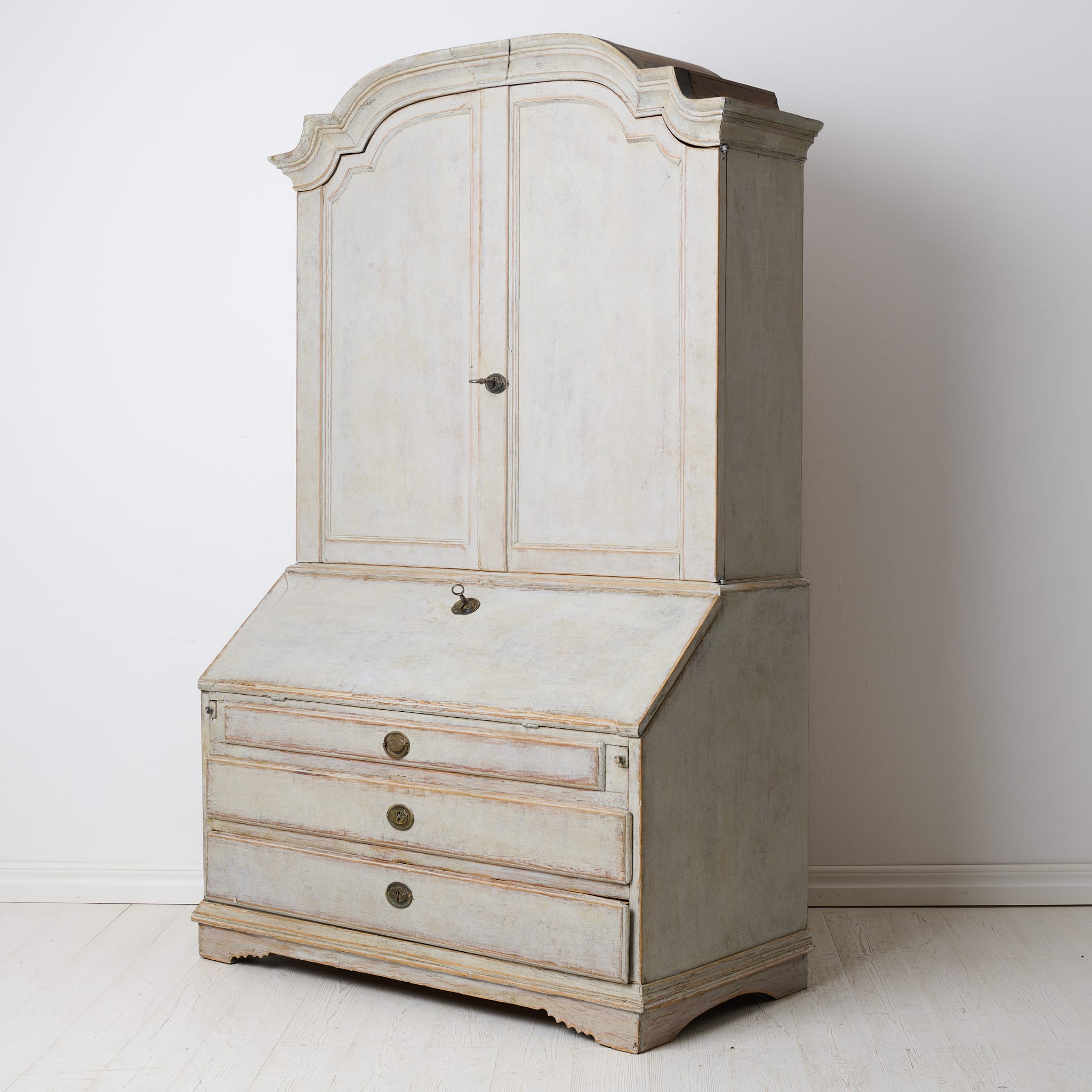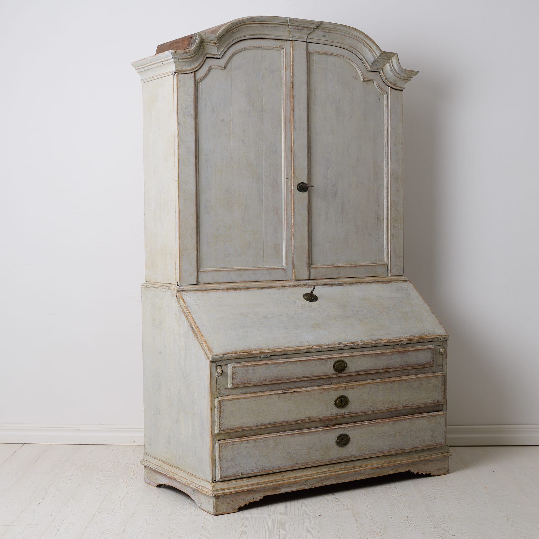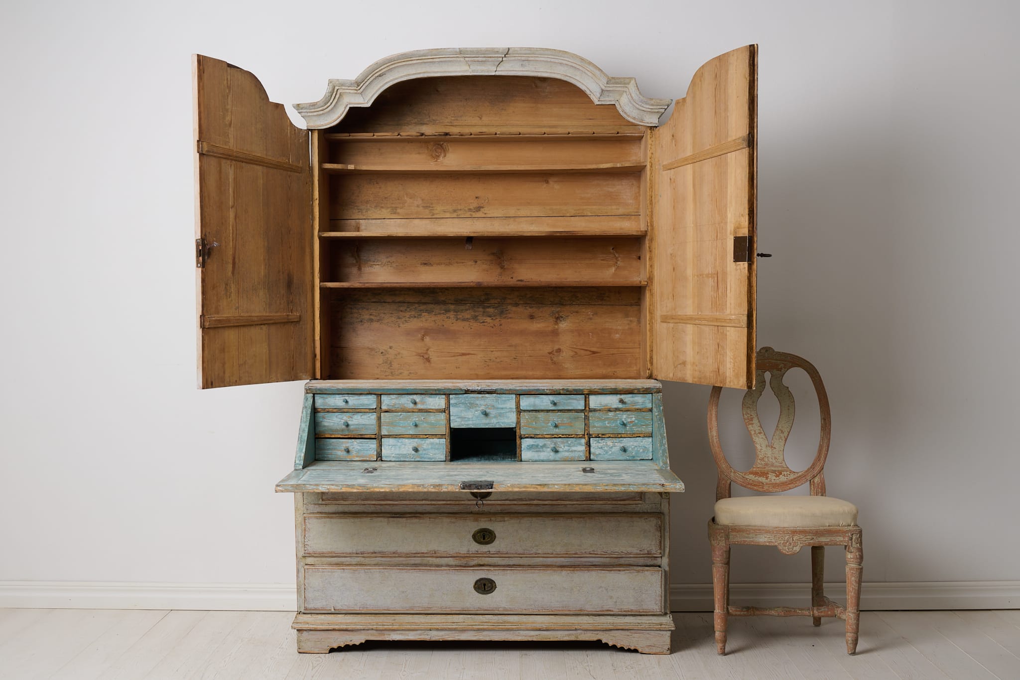 Antique rococo secretary cabinet from northern Sweden. The cabinet is from the rococo period and made by hand in two parts from solid pine around 1790 to 1800. The lower cabinet has a secretary desk and drawers. The upper cabinet has two doors and a curved rococo pediment.