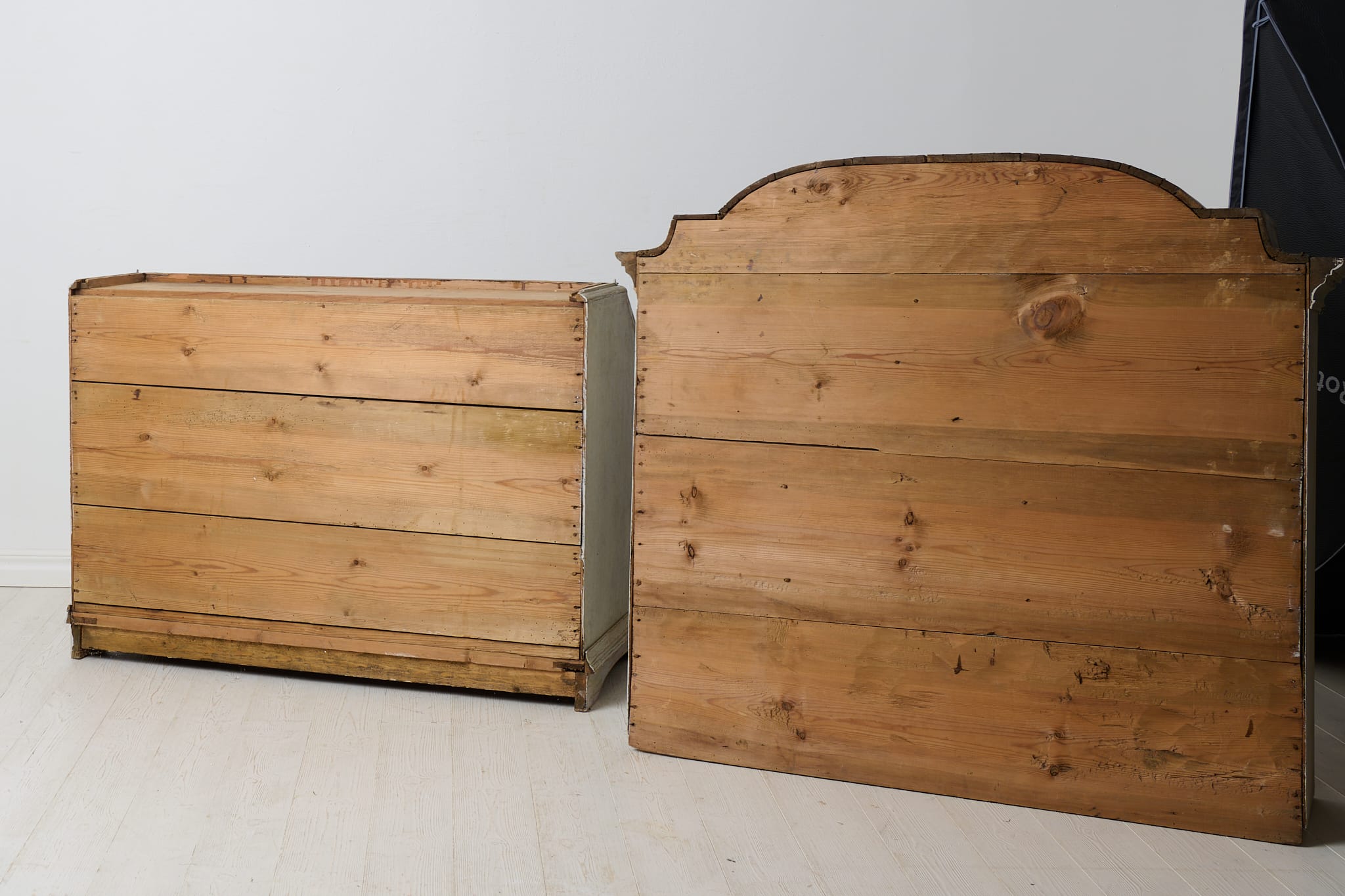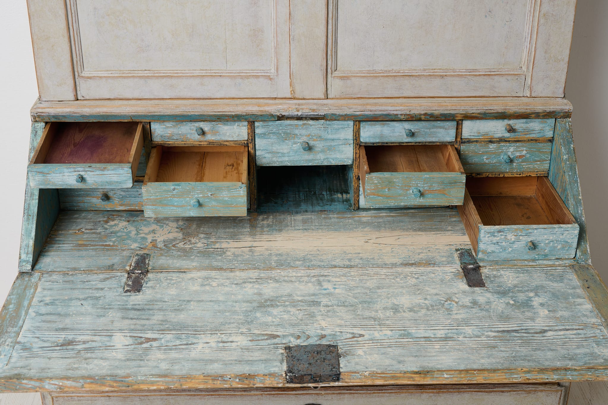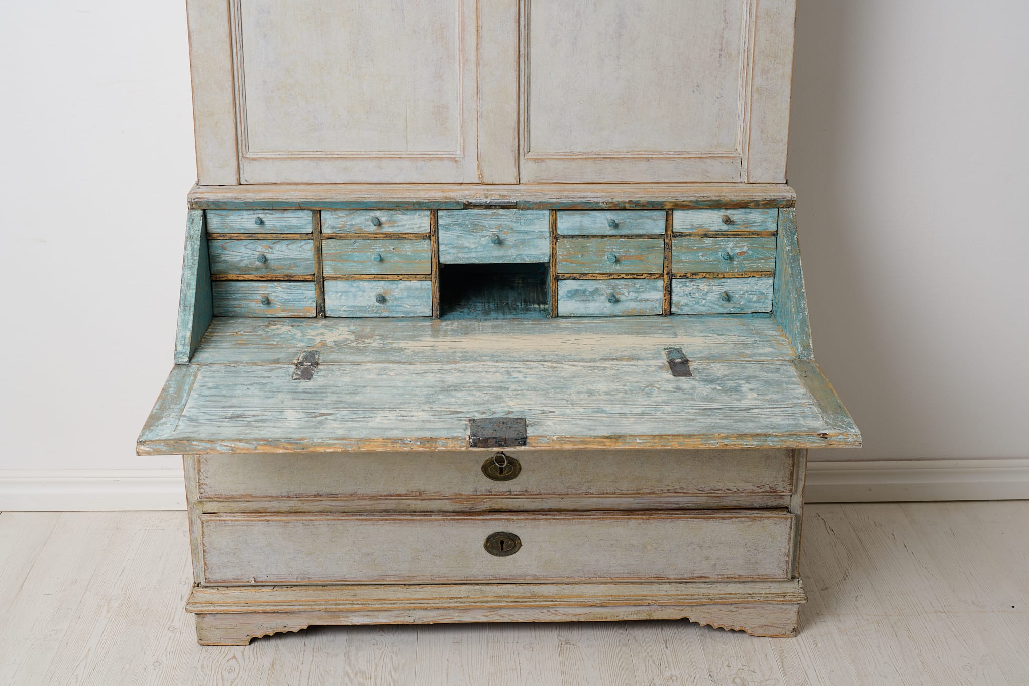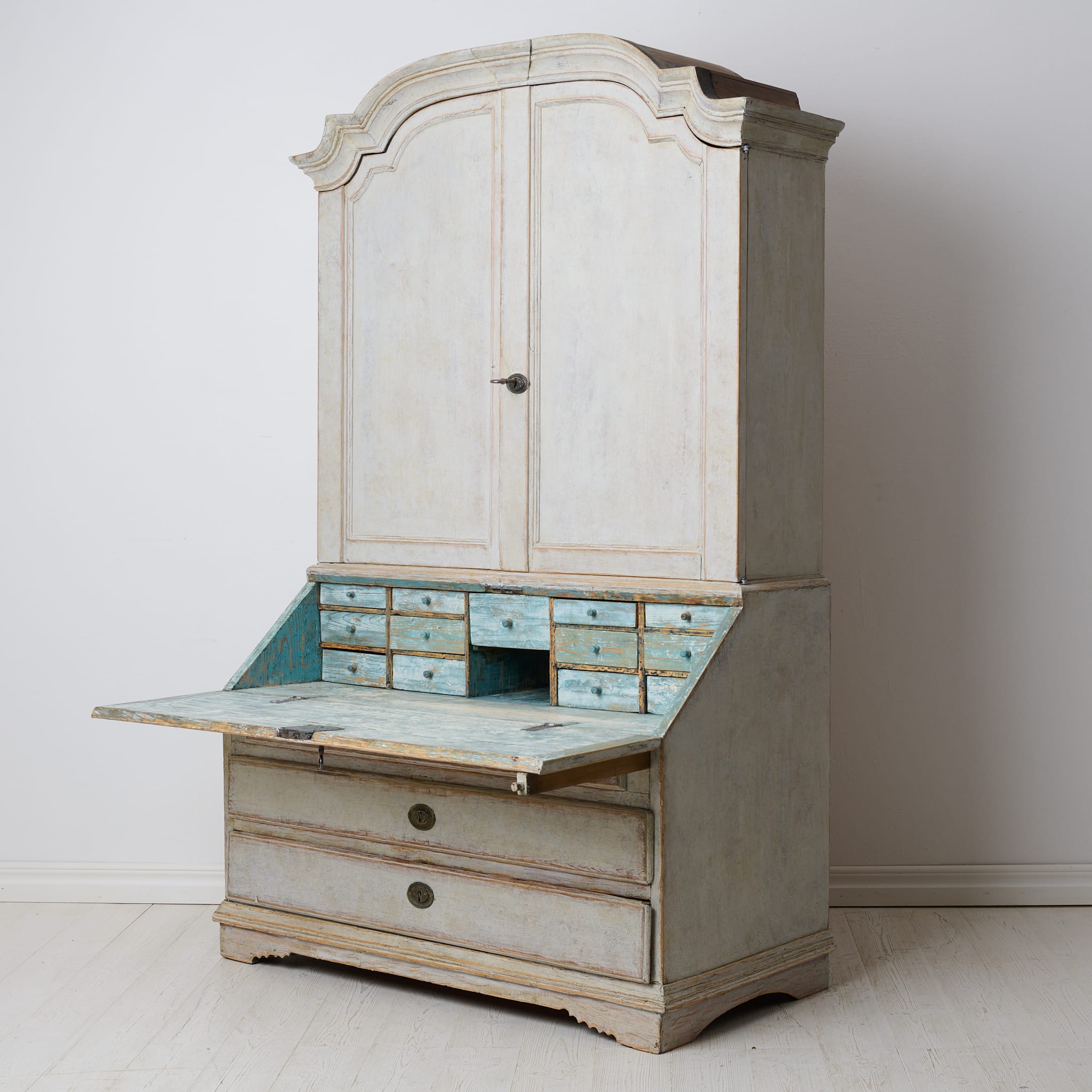 Antique rococo secretary cabinet from northern Sweden. The cabinet is from the rococo period and made by hand in two parts from solid pine around 1790 to 1800. The lower cabinet has a secretary desk and drawers. The upper cabinet has two doors and a curved rococo pediment.