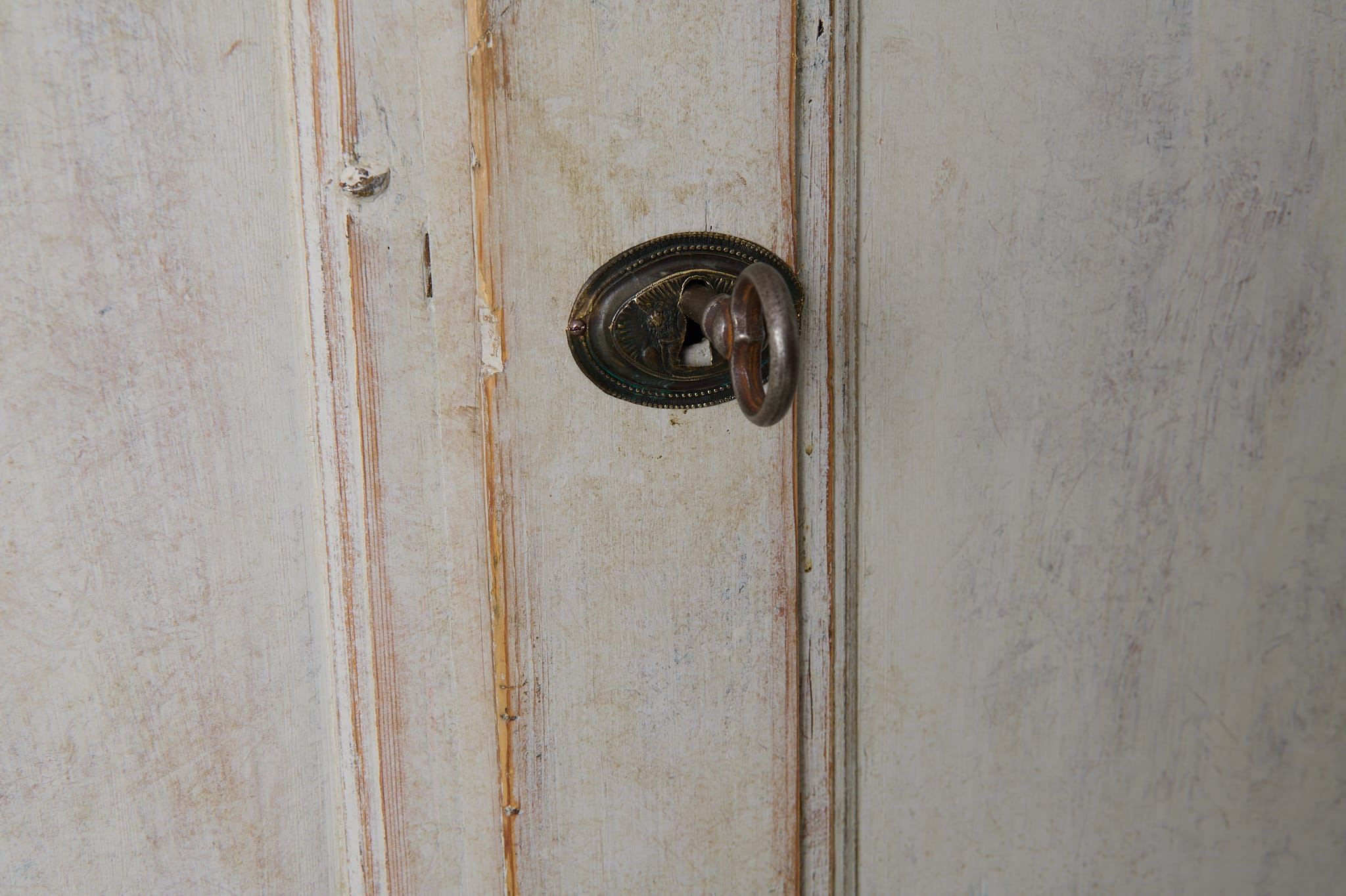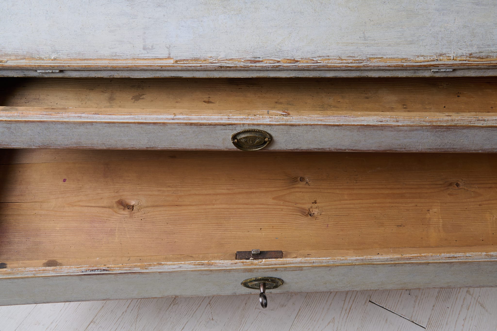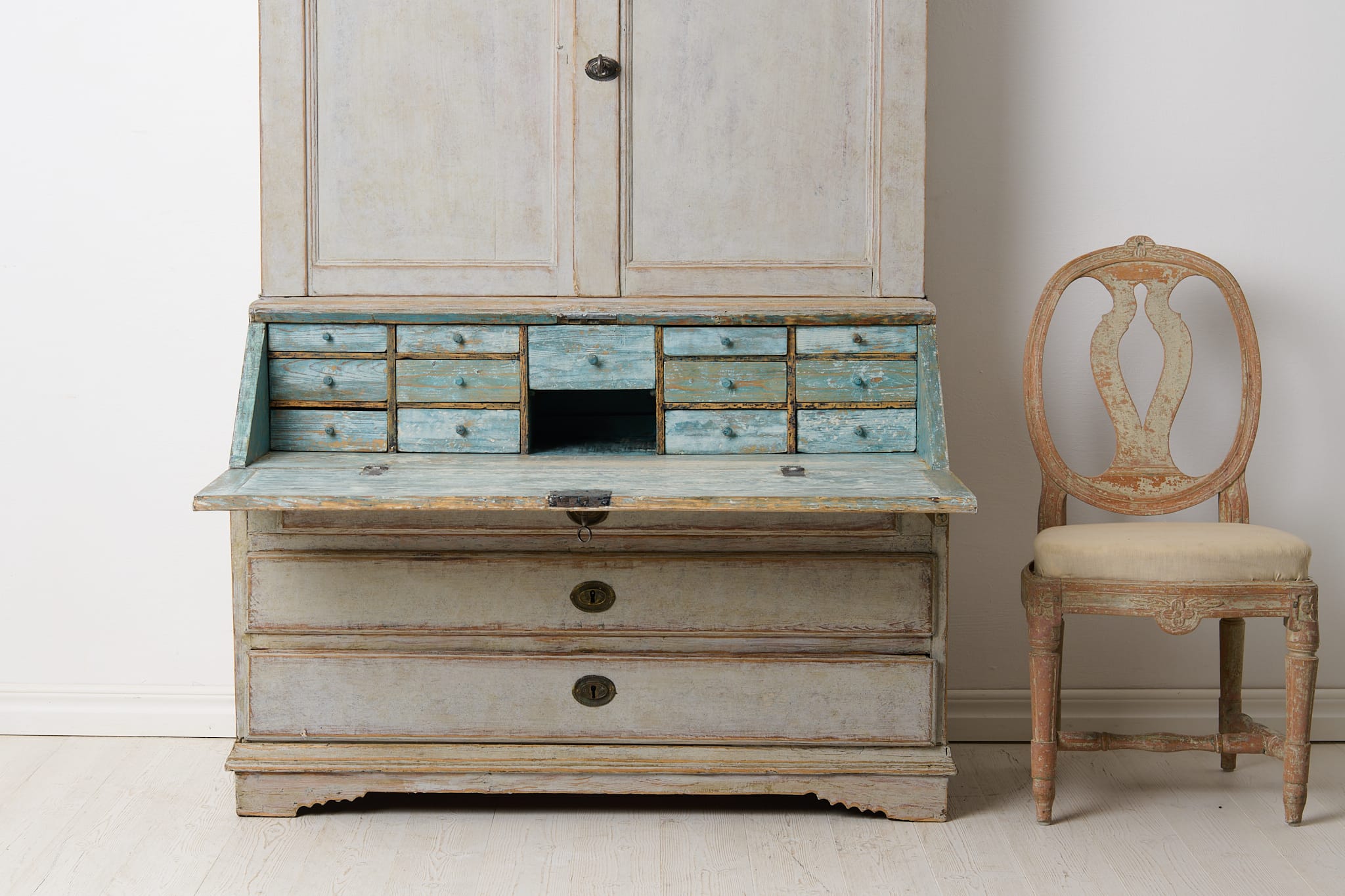 Old original hardware in brass – the hardware has some traces and marks of use. Working locks and keys. The interior of the secretary desk has the original blue paint while the exterior of the cabinet has later paint. The inside has never been painted. There are some marks and stains on the shelves – traces of use. Do also observe the measurements, the desk top is low.