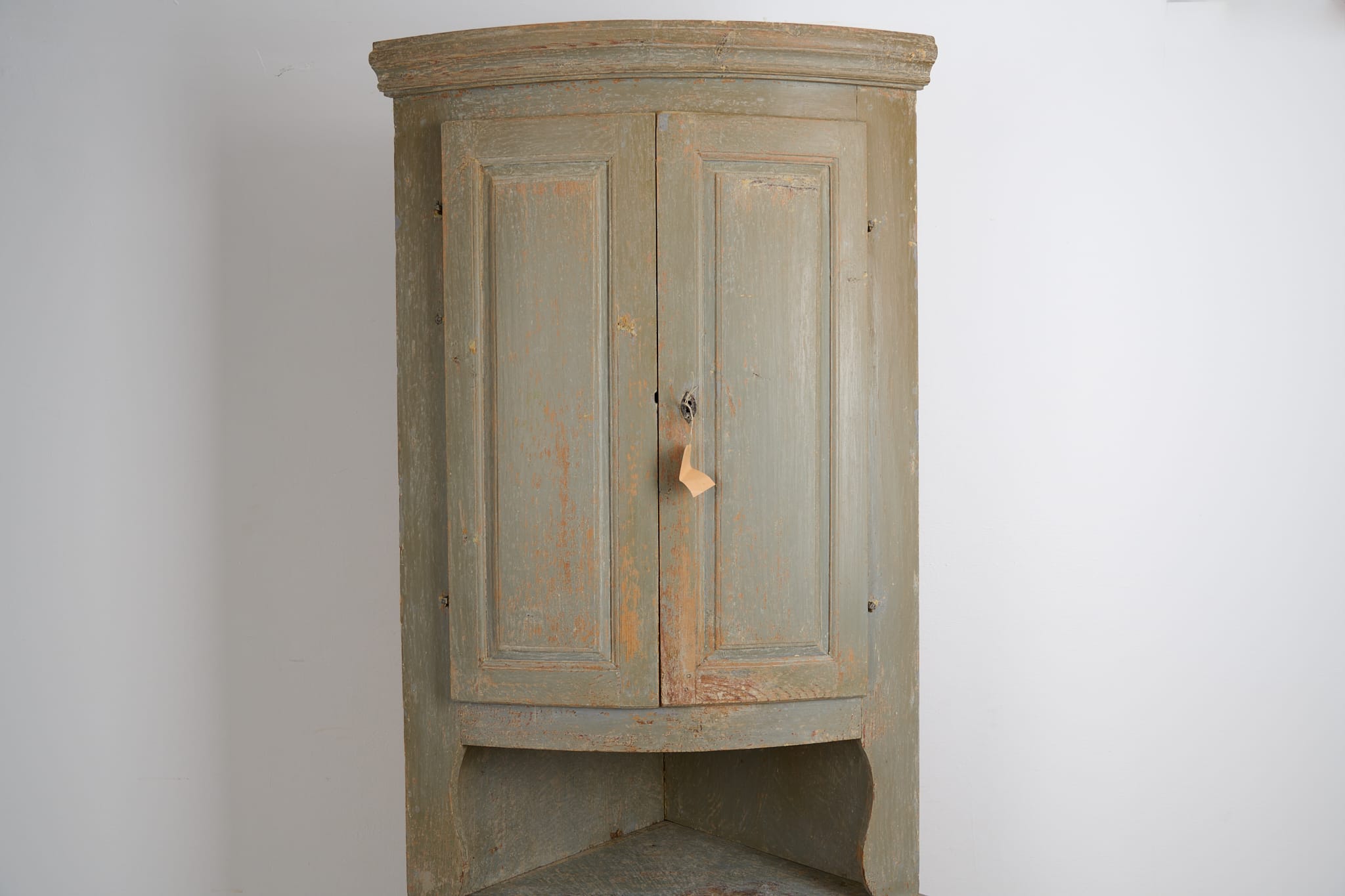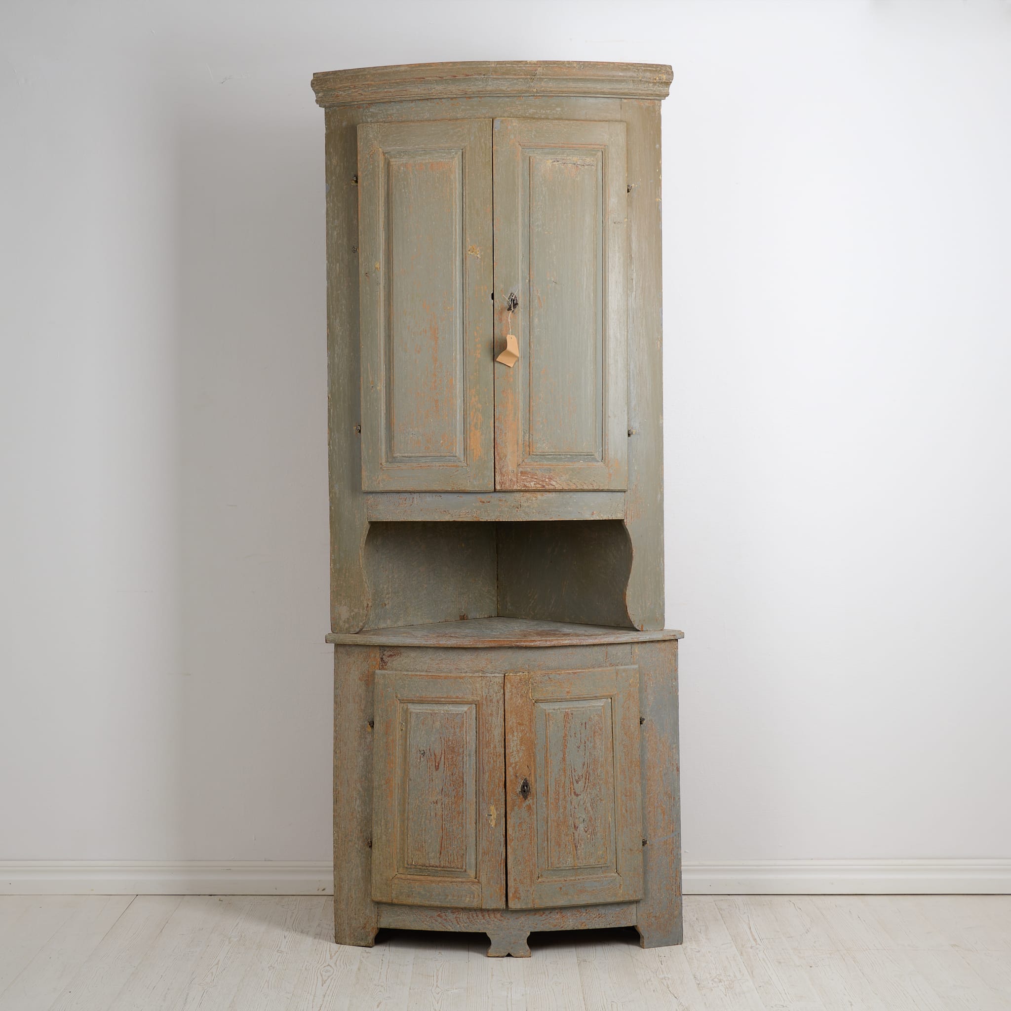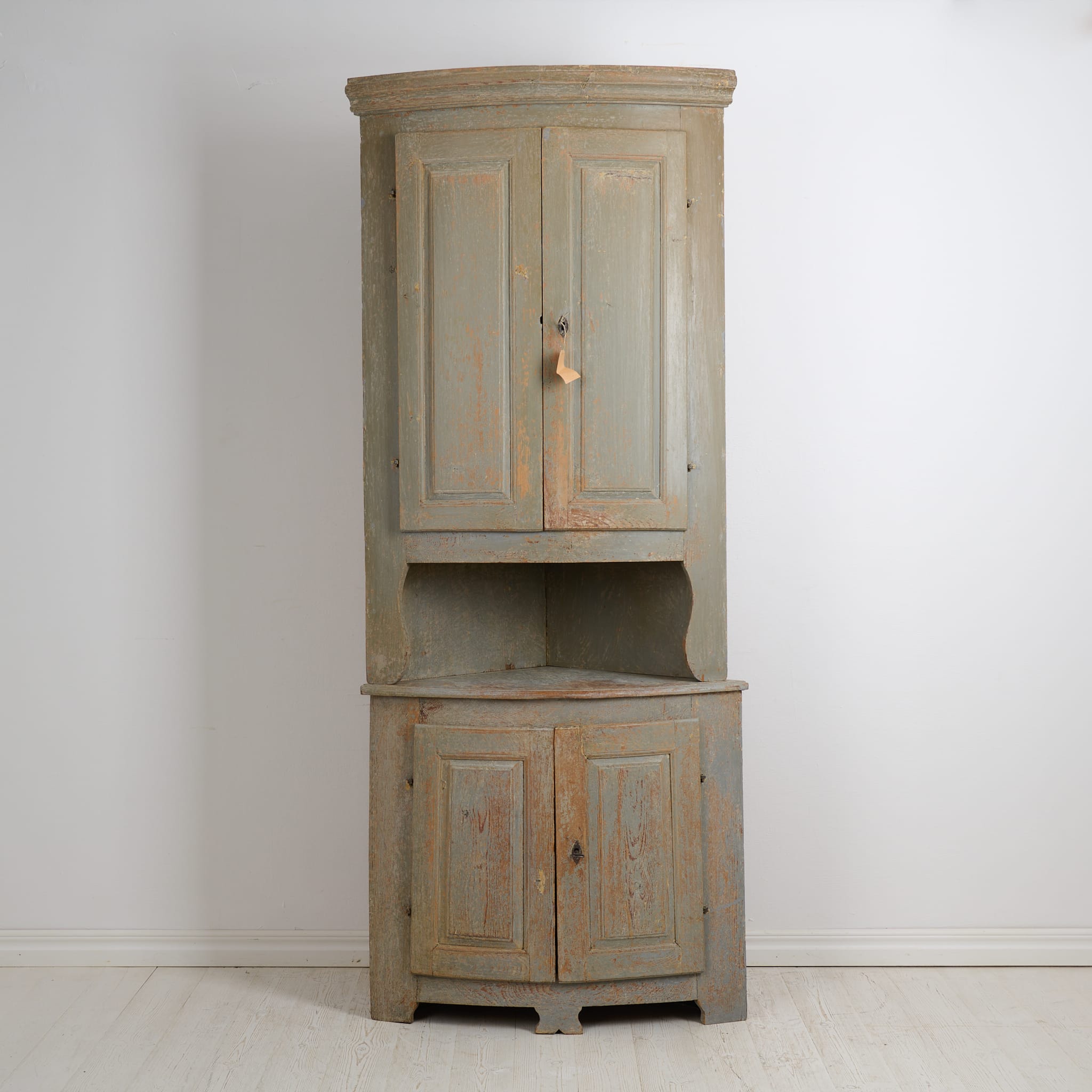 Antique Swedish corner cabinet from the early 1800s, around 1820. The cabinet is a country house furniture made in the gustavian style. Two parts with a rounded front, double doors and the original locks and keys which are in working condition. Original first layer of paint from the early 1800s. The paint shows the history of the cabinet with minor distress and patina. Healthy and solid frame. Total height is 225 cm, the lower cabinet is 81 cm high. Each side facing the walls are 64 cm wide and the cabinet measures circa 92 cm straight across. Depth is 56 cm.