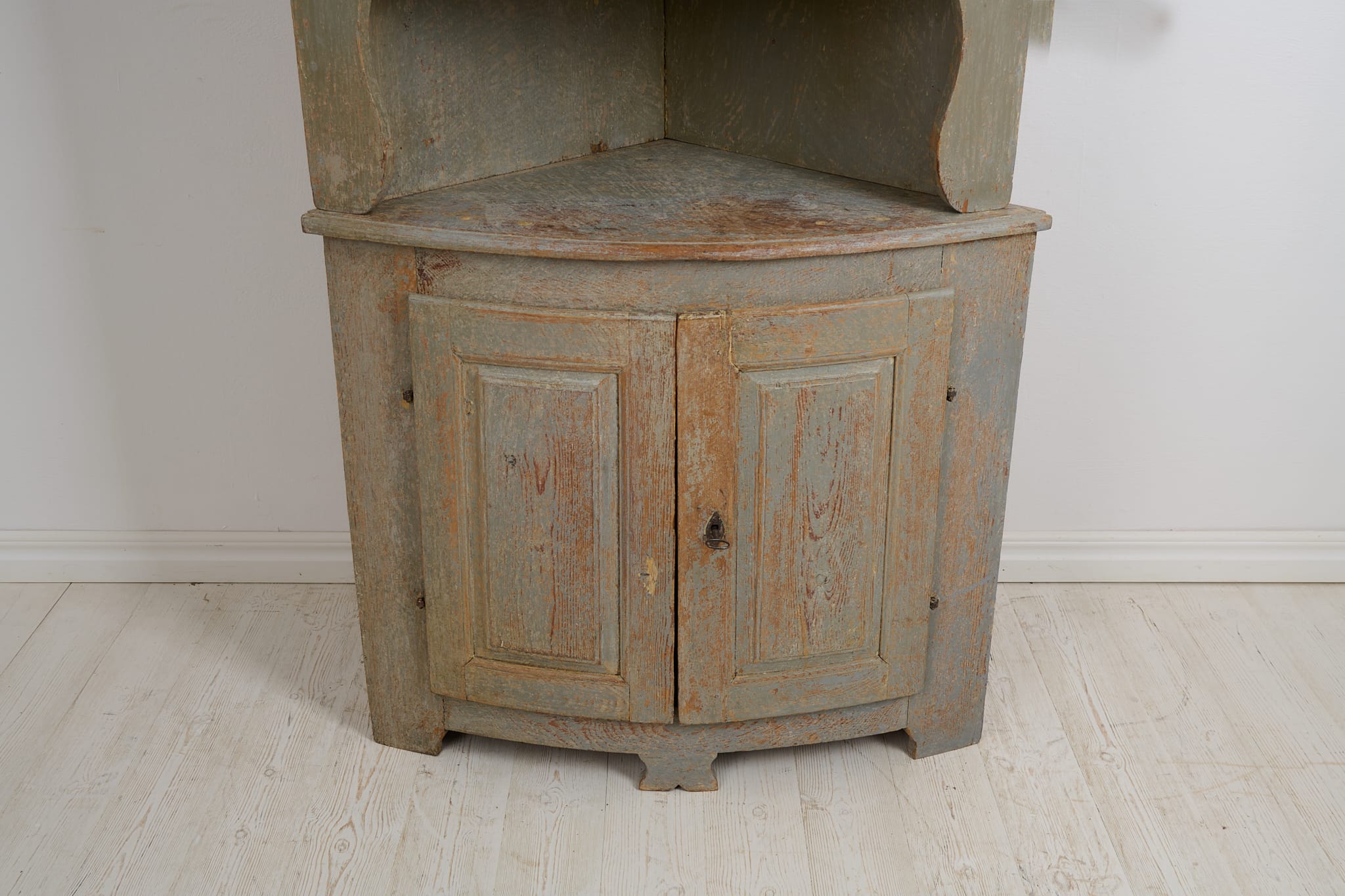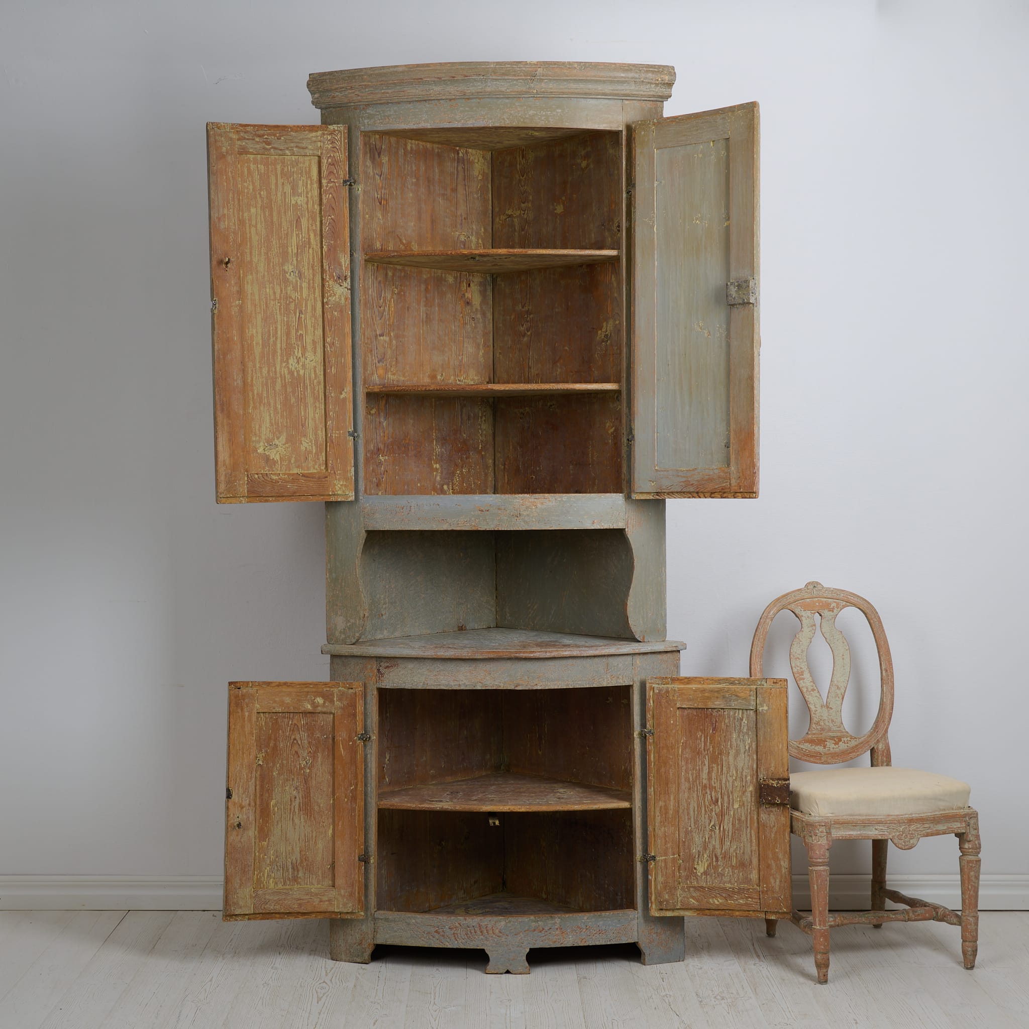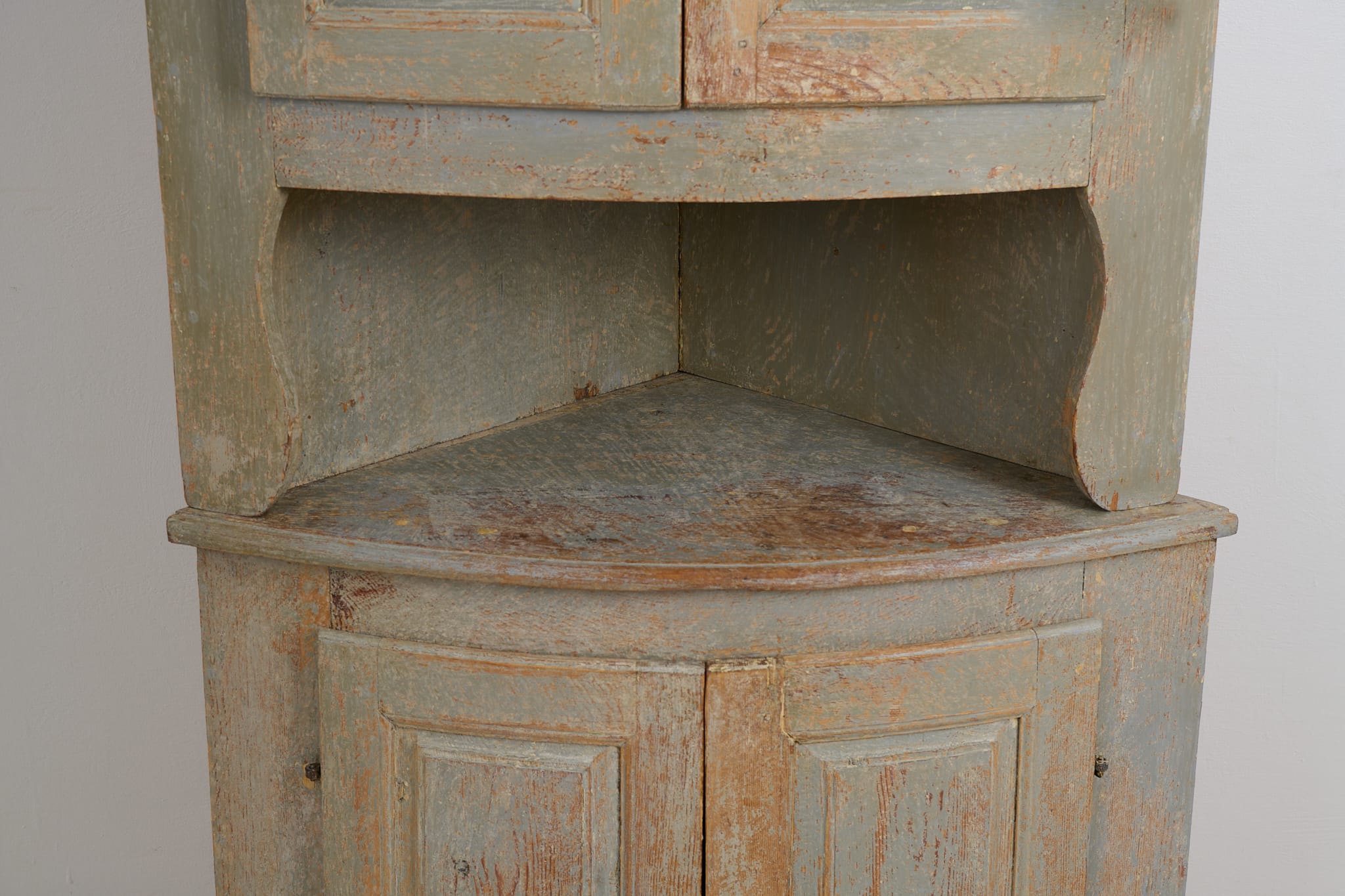 Antique Swedish corner cabinet from the early 1800s, around 1820. The cabinet is a country house furniture made in the gustavian style. Two parts with a rounded front, double doors and the original locks and keys which are in working condition. Original first layer of paint from the early 1800s. The paint shows the history of the cabinet with minor distress and patina. Healthy and solid frame. Total height is 225 cm, the lower cabinet is 81 cm high. Each side facing the walls are 64 cm wide and the cabinet measures circa 92 cm straight across. Depth is 56 cm.