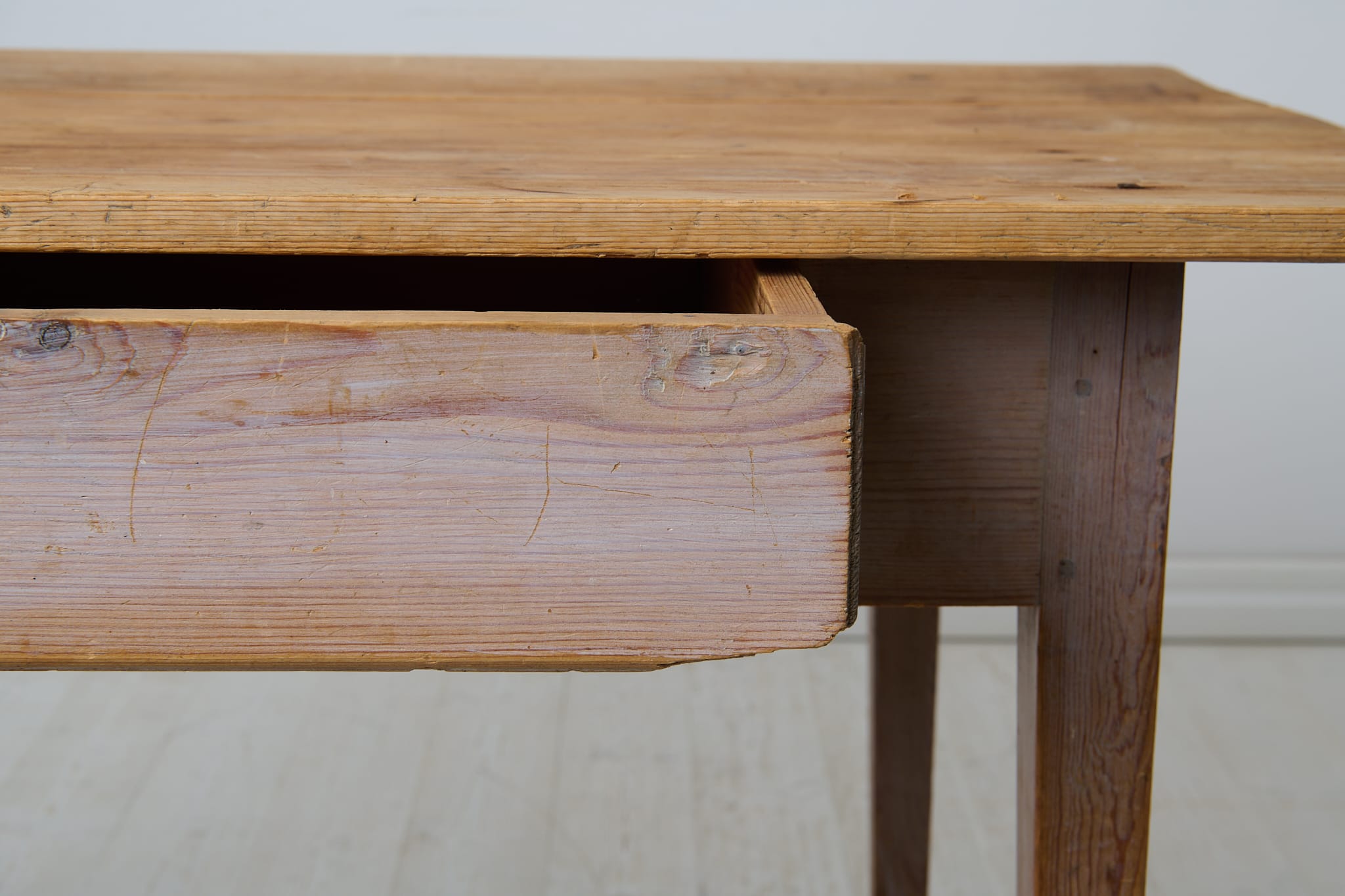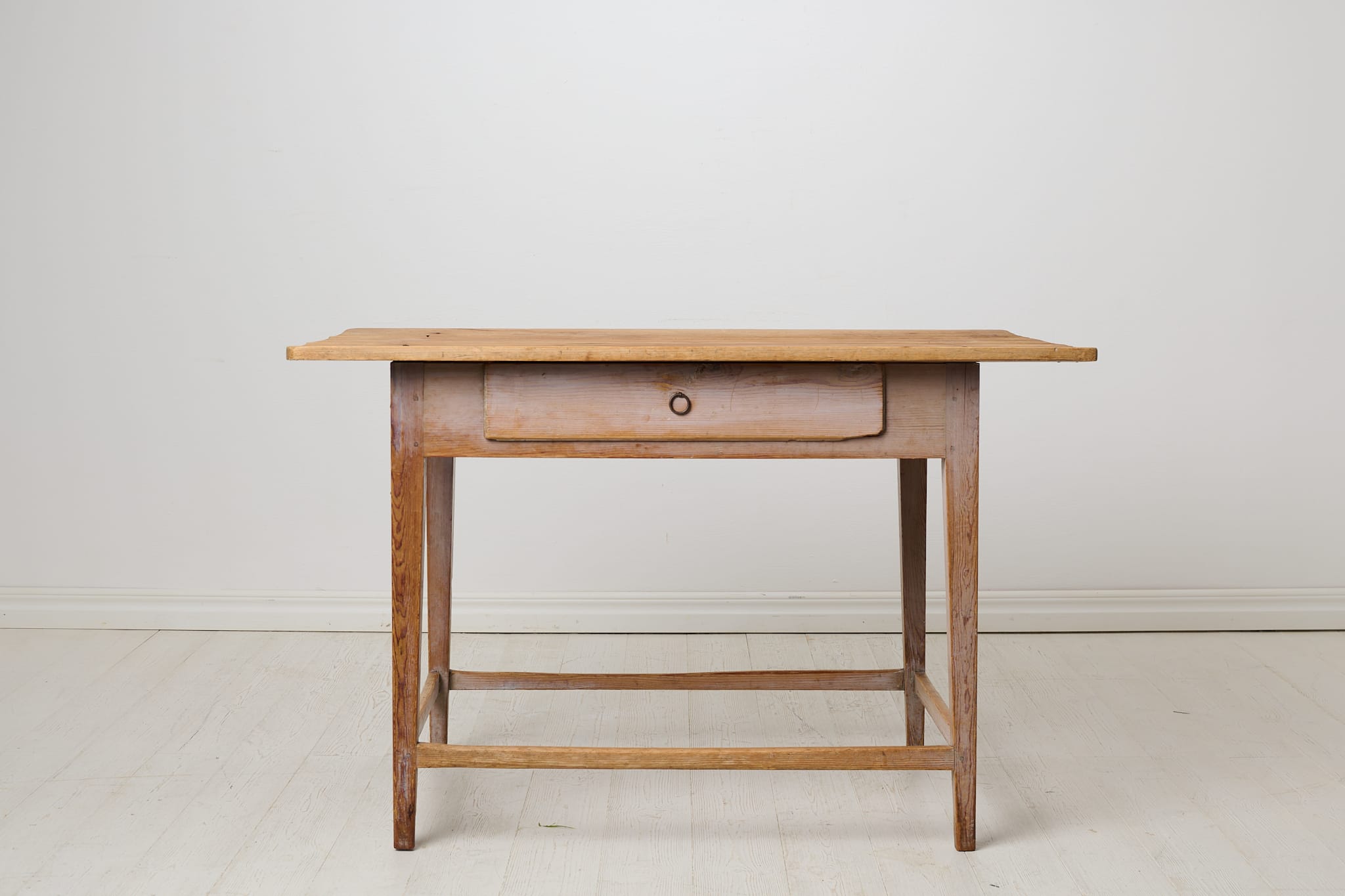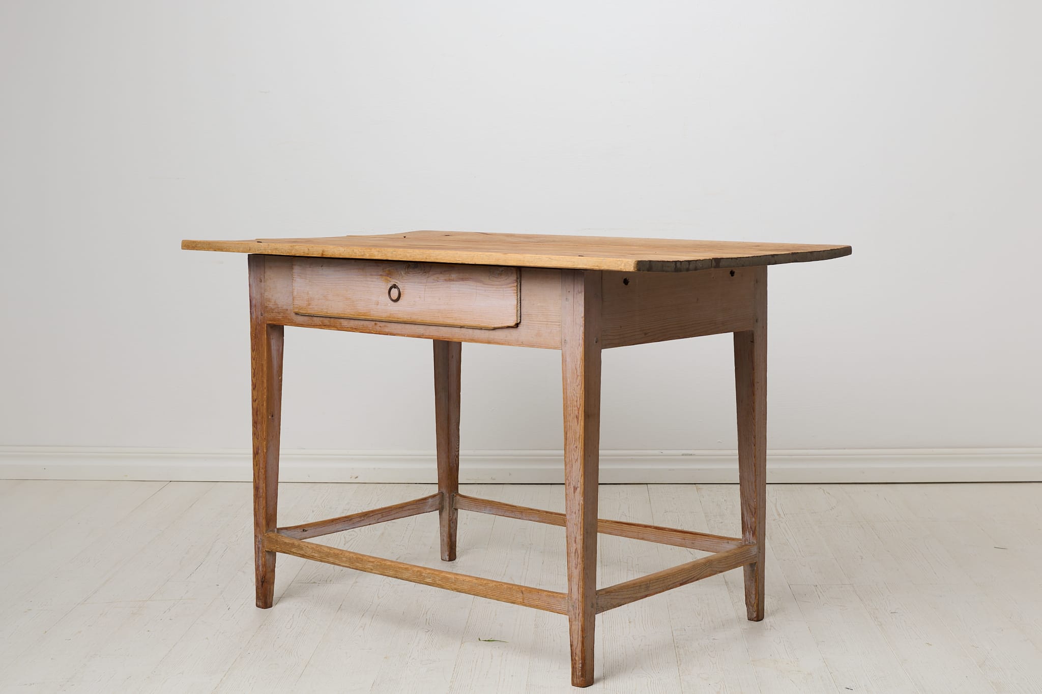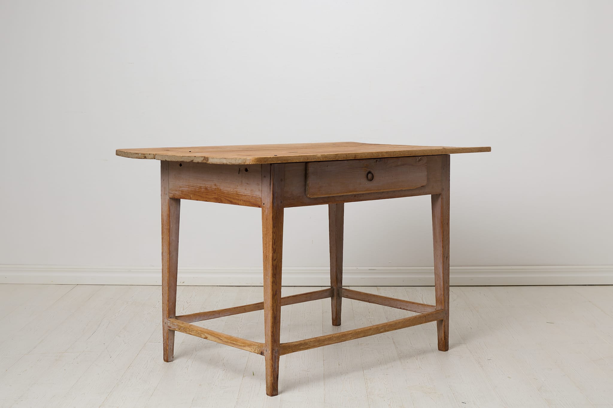 Antique Swedish country table in untouched condition. The table has a drawer and straight legs as well as original paint that shows the age and history of the piece. Charmingly worn with attractive patina. Made by hand in Sweden around 1820. Healthy and stable frame.
