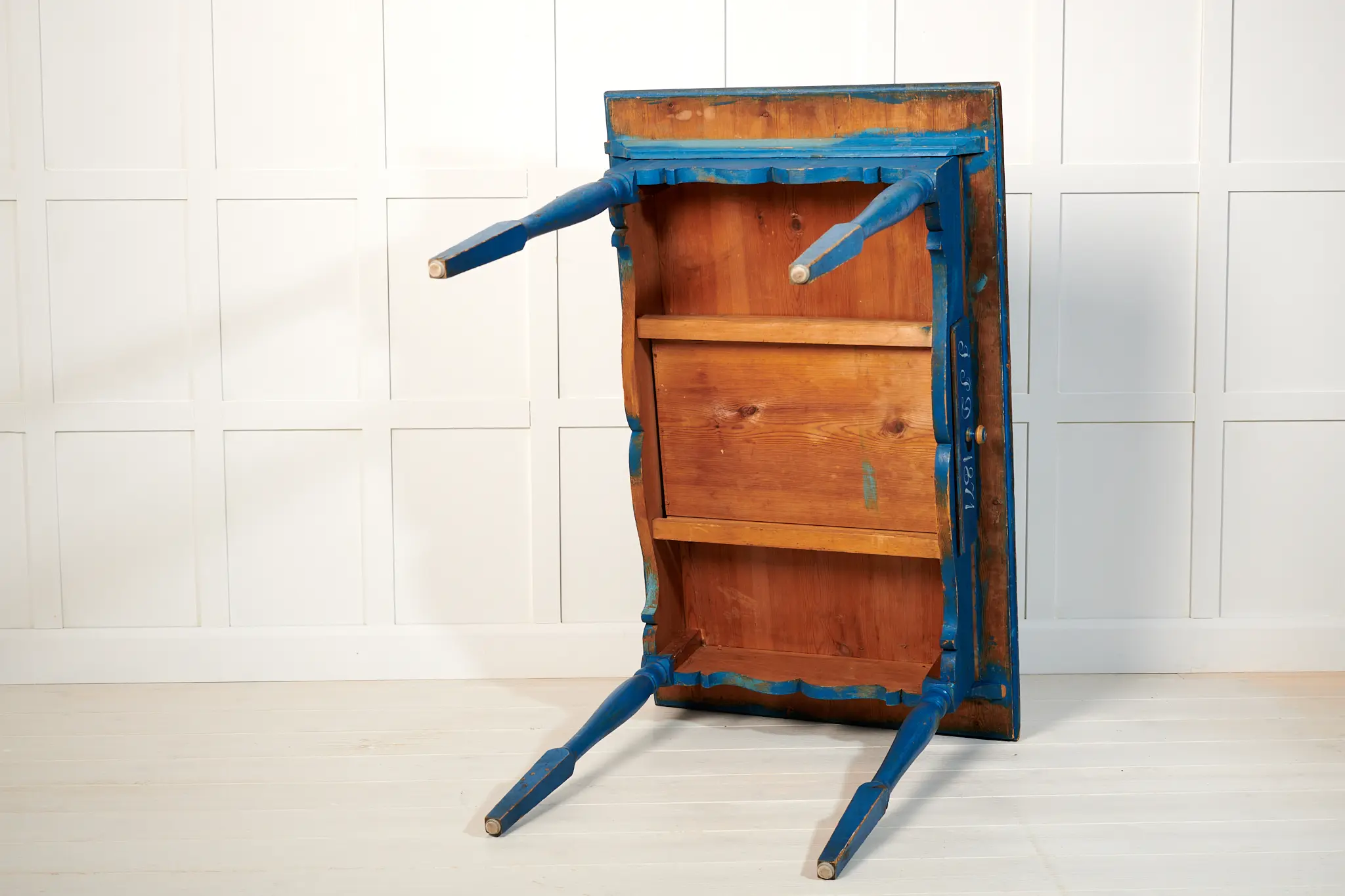 Antique Swedish country table or desk with a drawer. The table is an authentic country house furniture from northern Sweden made by hand in solid pine. The table has the original blue paint with painted initials and the year 1871 on the drawer. The drawer has the original drawer pull. The table has the original paint which has a genuine patina and distress after being used for 150 years. Healthy and solid frame. There is a smaller notch from a branch on the table top, see picture. Height from the floor to the apron is 58.5 cm.