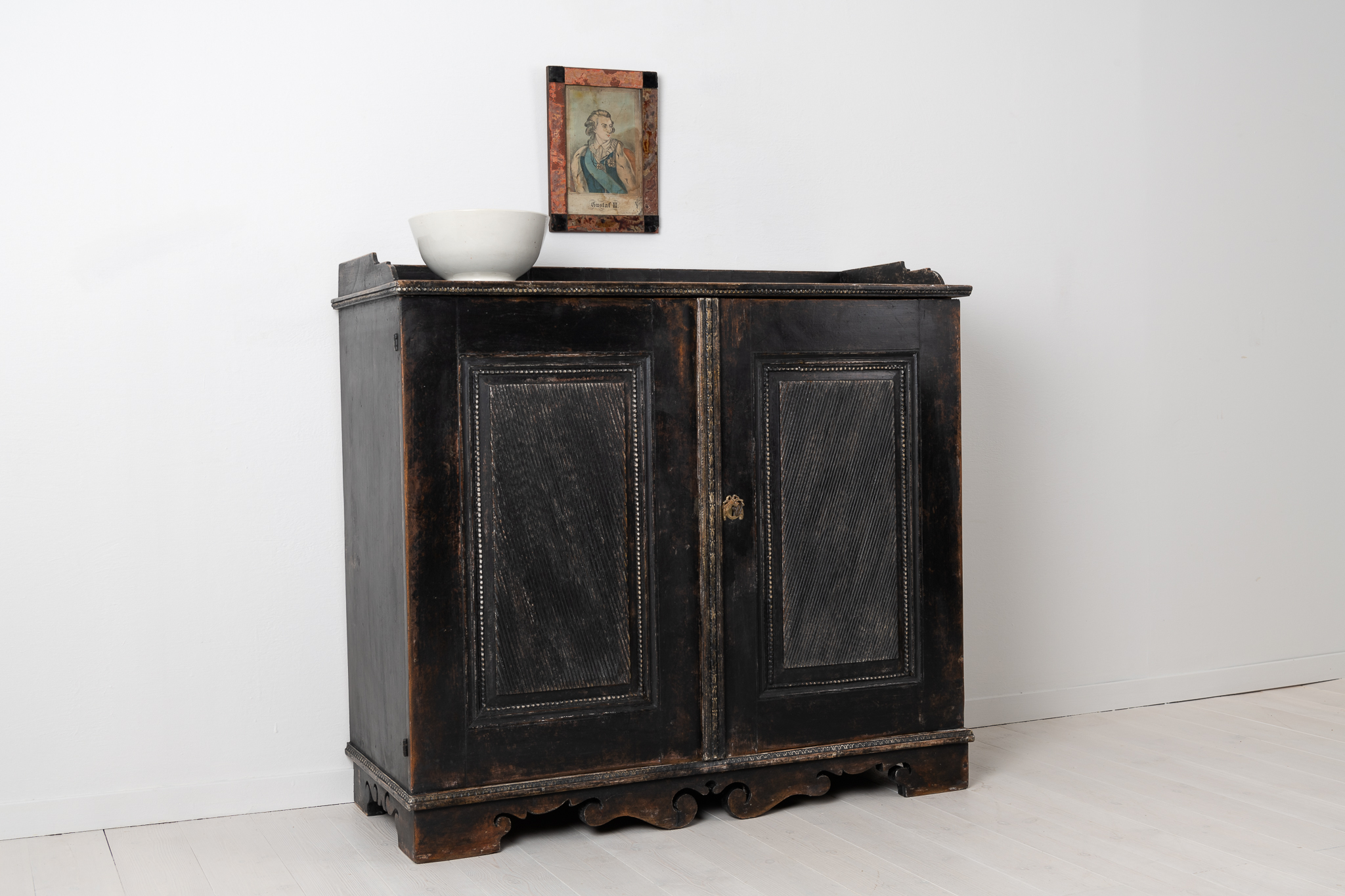 Black gustavian sideboard from Sweden made around 1790. The sideboard has two doors and a profiled bottom rim. Made in painted pine and an unusually low model, rich with hand carved wooden decorations on the doors and around the edges. Original lock and key in working condition and original hardware. Healthy and solid frame. Height to the table top is 104 and the total height including the 7 cm rim is 111 cm.