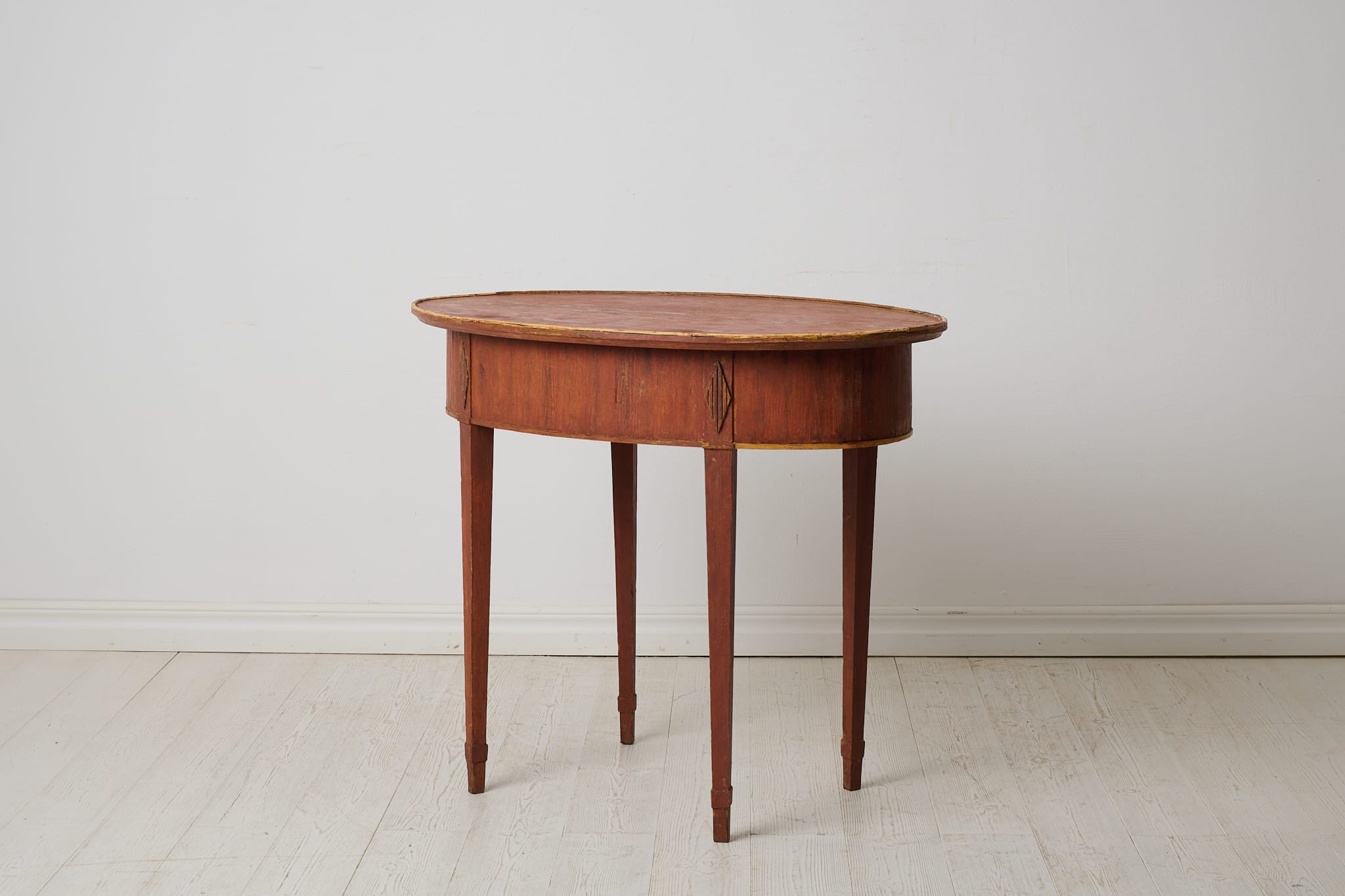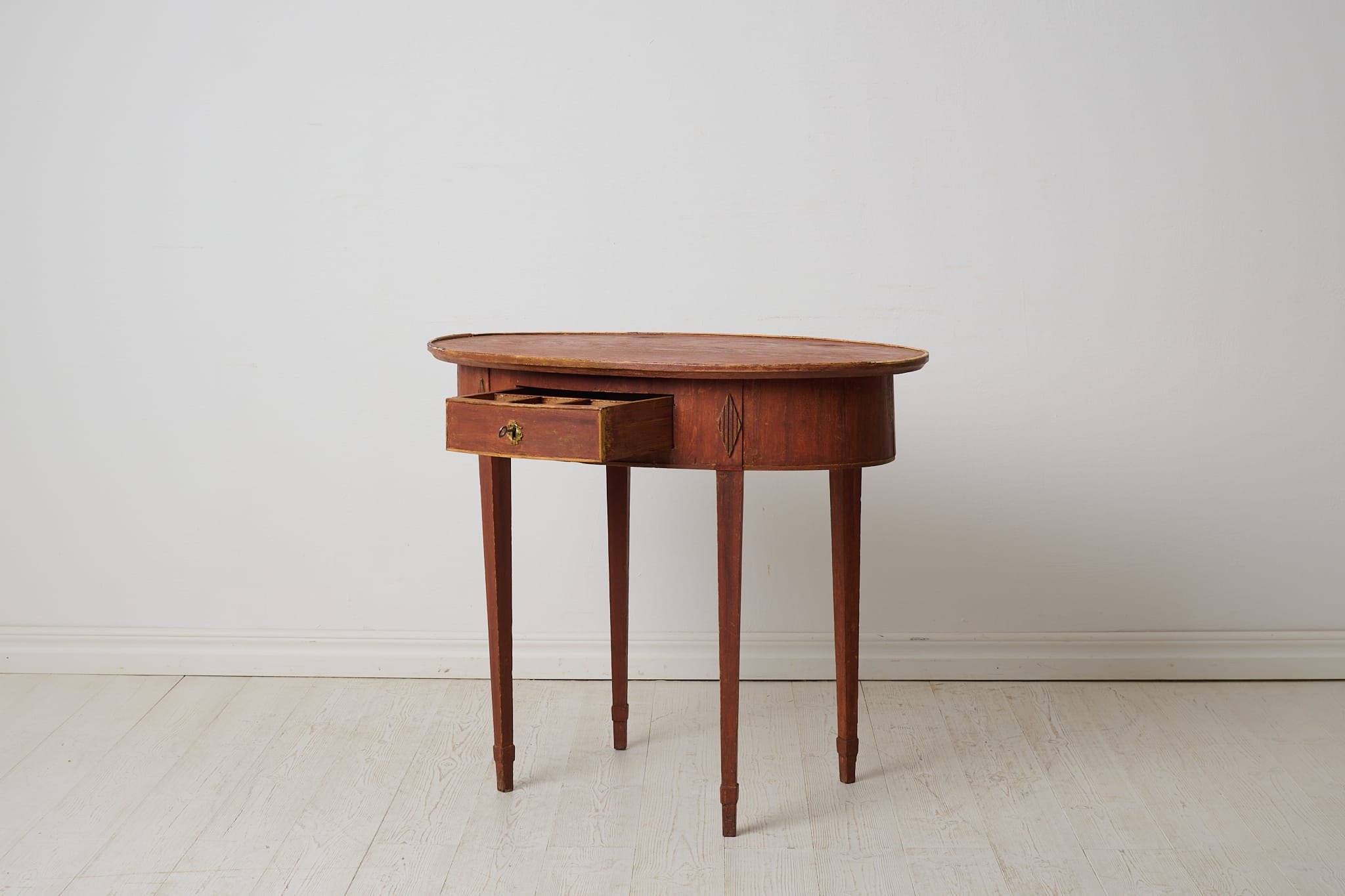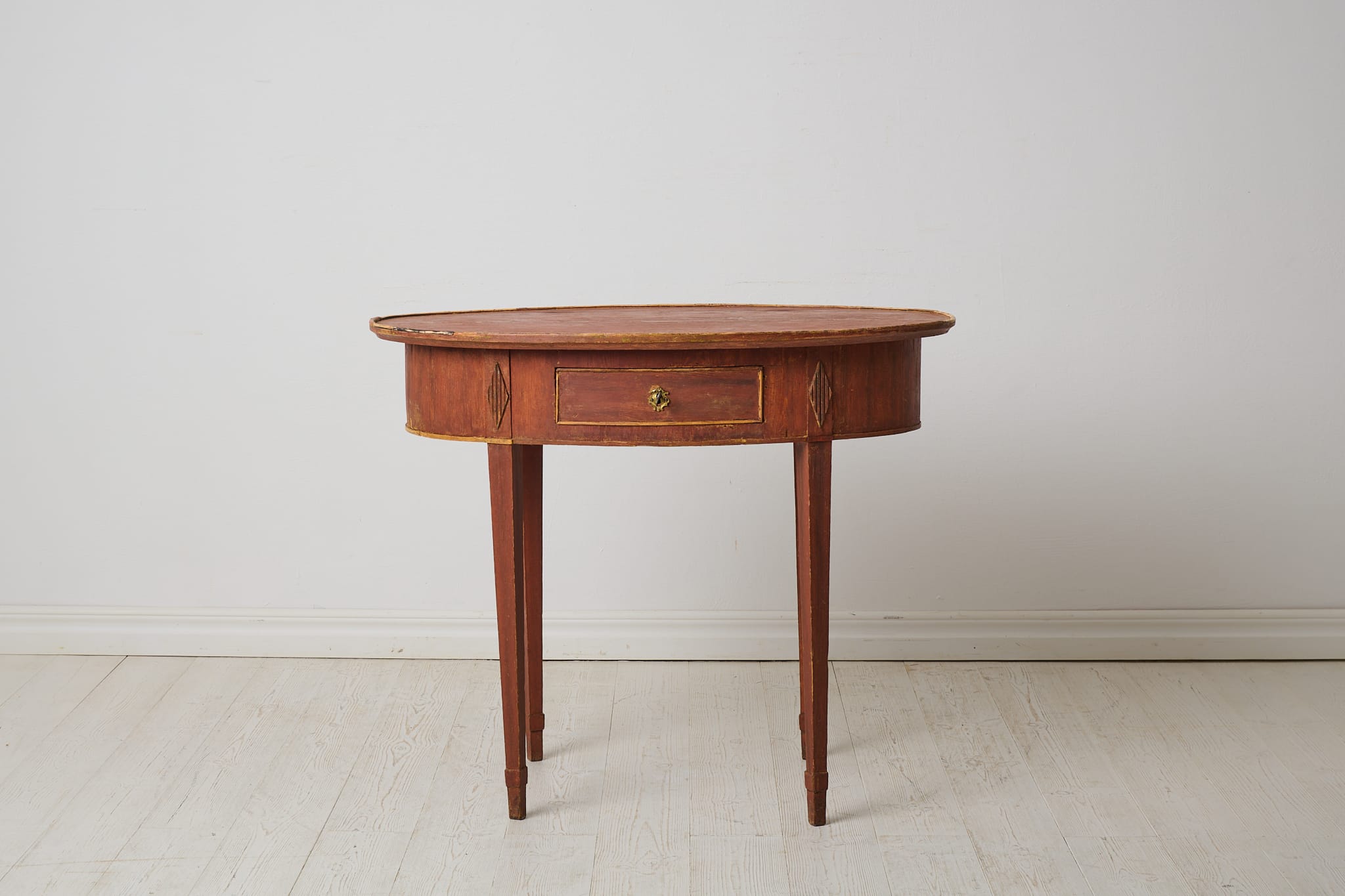 Classic gustavian side table from the late 1700s. The table has a classic straight shape with an oval table top and straight tapered legs. There is a drawer in the apron and hand carved wooden decorations. A thin trim is made around the whole table top as a finishing touch. Original first layer of paint from the late 1700s. Traces of use with smaller marks and patina. Healthy and stable frame.