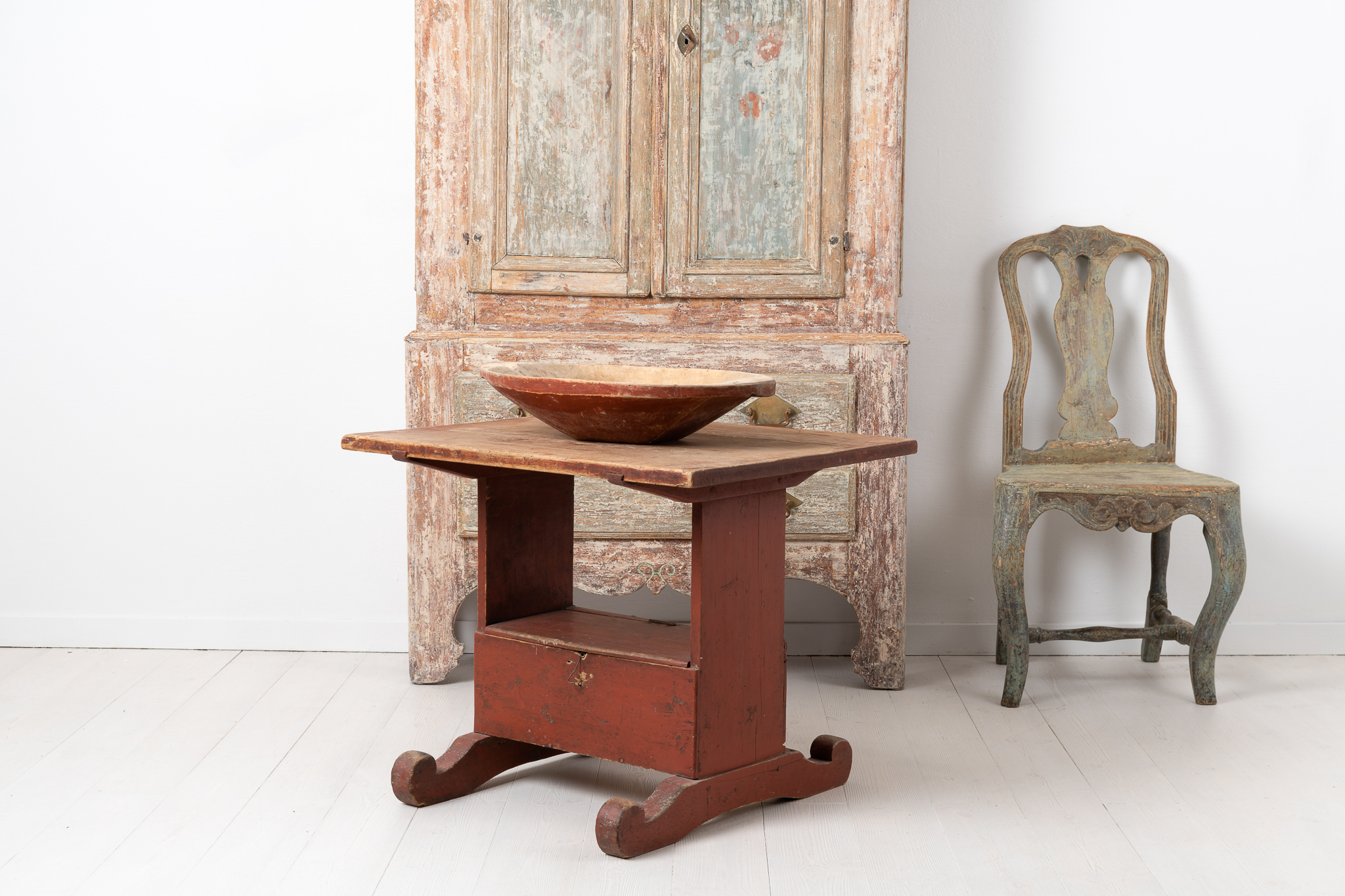 Country folk art table from the late 18th century. The table is pine with the original red paint as well as the authentic patina from the 18th century. The patina has naturally developed trough the years to the irreplaceable charm it has today with different tones in the paint and genuine antique character. Unusual curls at the end of the feet as well as a storage box underneath the table with a lid – see picture. The table works well as a coffee table. Healthy and solid frame. The table has its origin in northern Sweden.