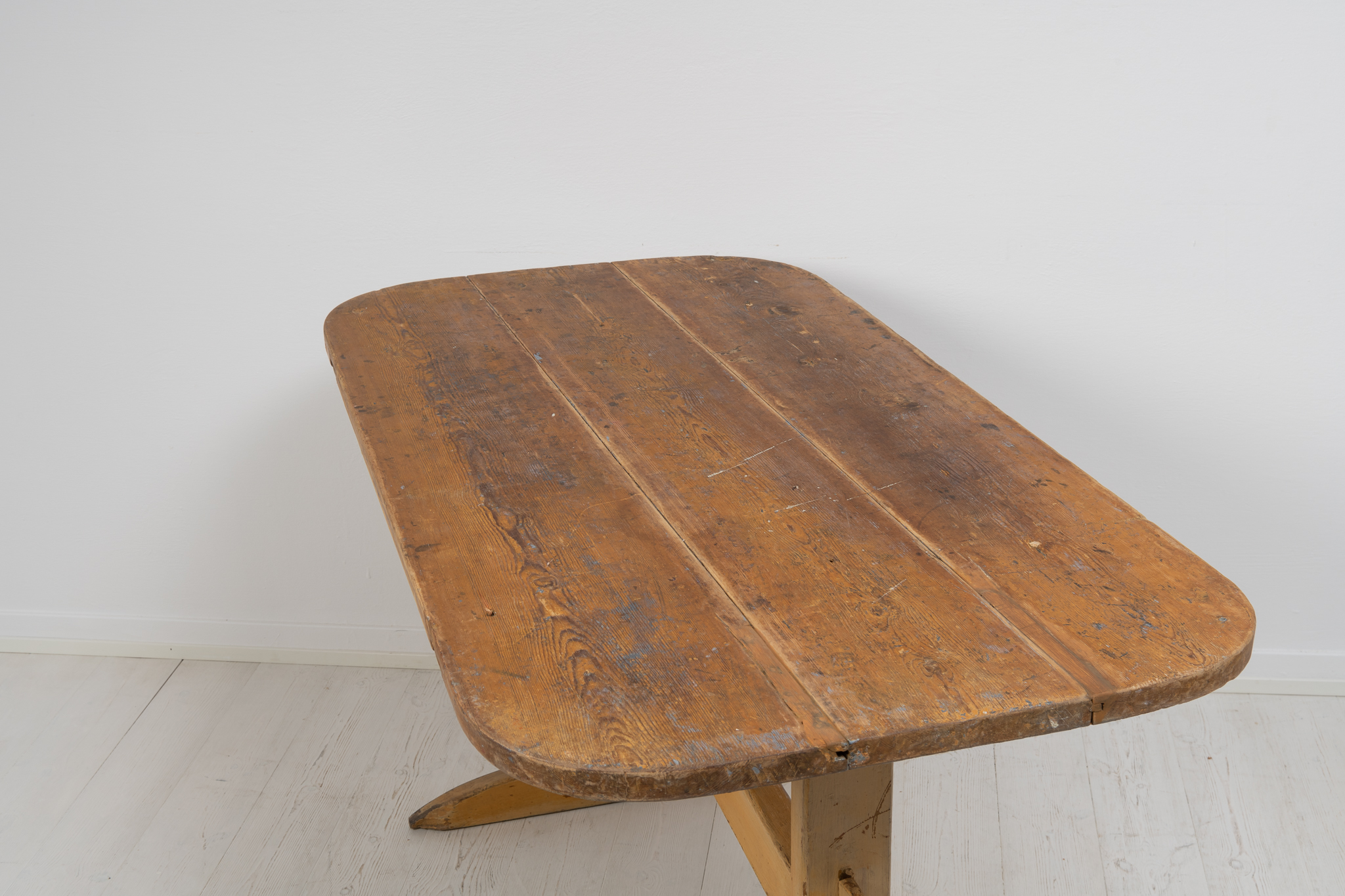 The table top consist of only 3 thick boards of pine where the surface has a unique patina after 200 years of use. The legs frame is also pine and can be taken apart where it’s held together by wedges on both sides. The table has old paint from the 1800s with the authentic distress and patina of use. The table top has two older repairs – see close up pictures.