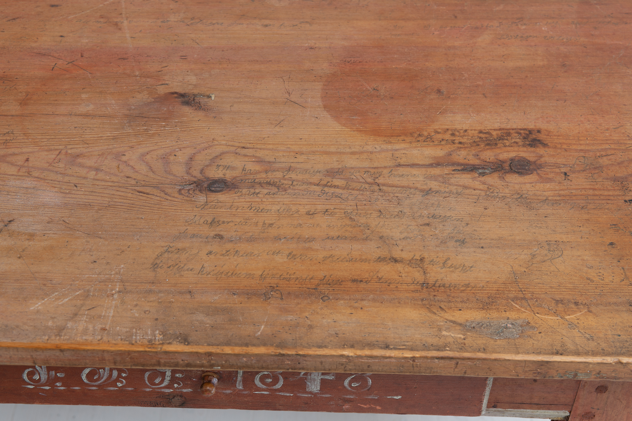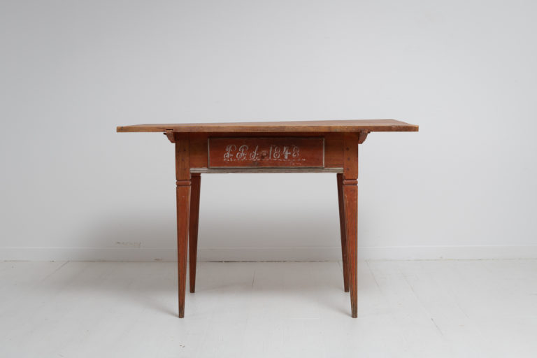 Country table in gustavian style from northern Sweden. The table is a rare example and has a large centered drawer and straight tapered legs with flutes. Hand made and in genuine untouched condition with original salmon paint. Complete with a painted monogram and the dating 1848 on the front of the drawer. Paint with authentic distress and patina. Unusual decoration with flutes on the legs that rounds the corners. Traces of hand-written text on the table top and drawer. Healthy and solid frame. Unusually good condition and overall impression. Height to rim 55 cm.