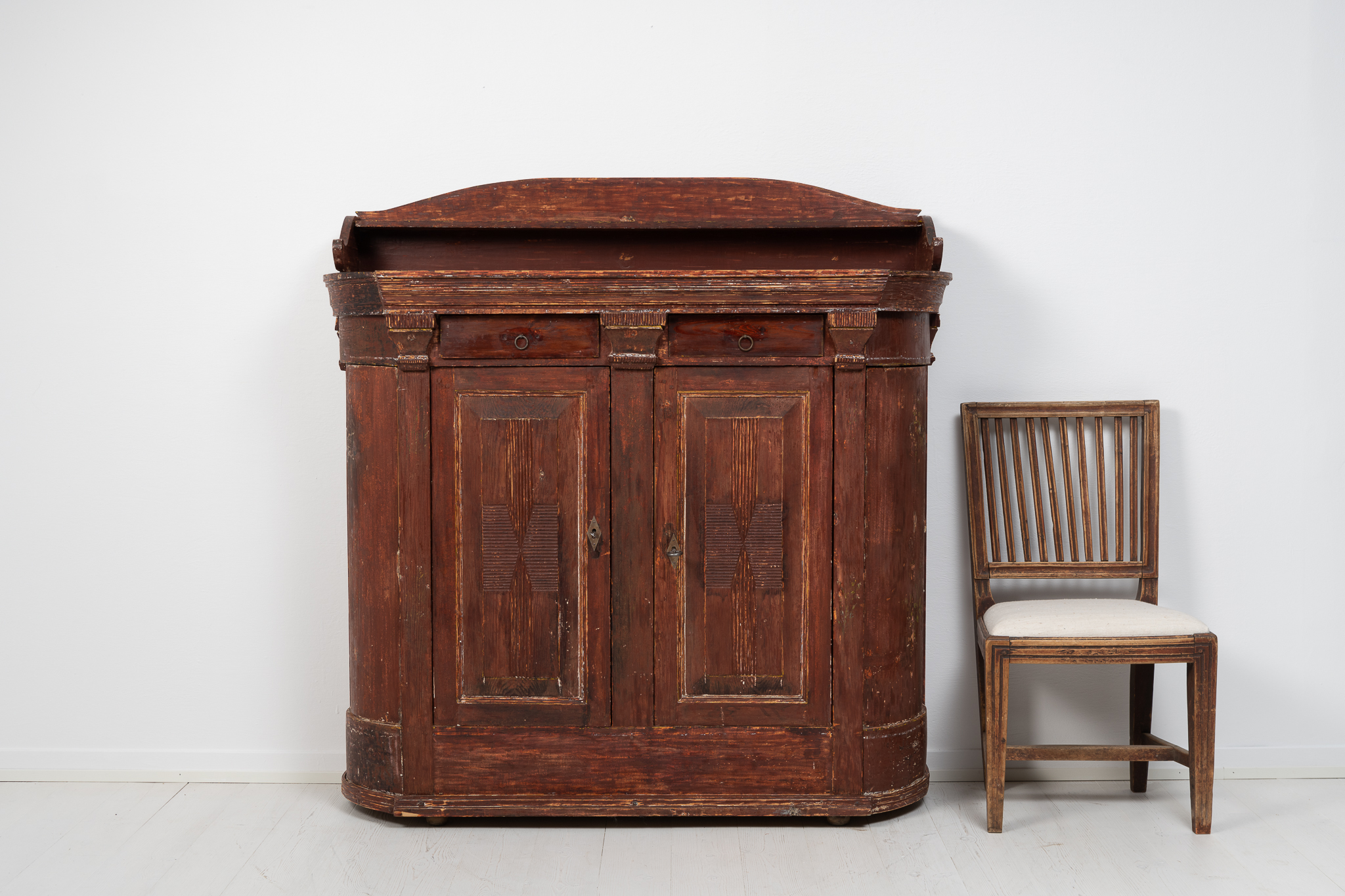 Curved country house sideboard from northern Sweden. The sideboard is from the 1820 to 1830s and is made in painted pine. It has two doors and rounded corners as well as a hand carved decor. The sideboard is a grand and solid piece with distinctly stately features.