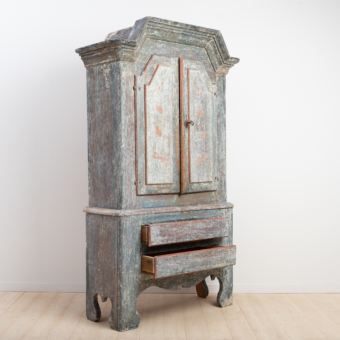 Swedish folk art cabinet from northern Sweden. The model is often called Lockne cabinets because they were manufactured in the area surrounding the village Lockne in Jämtland. The cabinet is dry scraped to the first layer of paint from the late 1700s. Original working lock and key. The cabinet is in two parts and manufactured during the late 1700s.