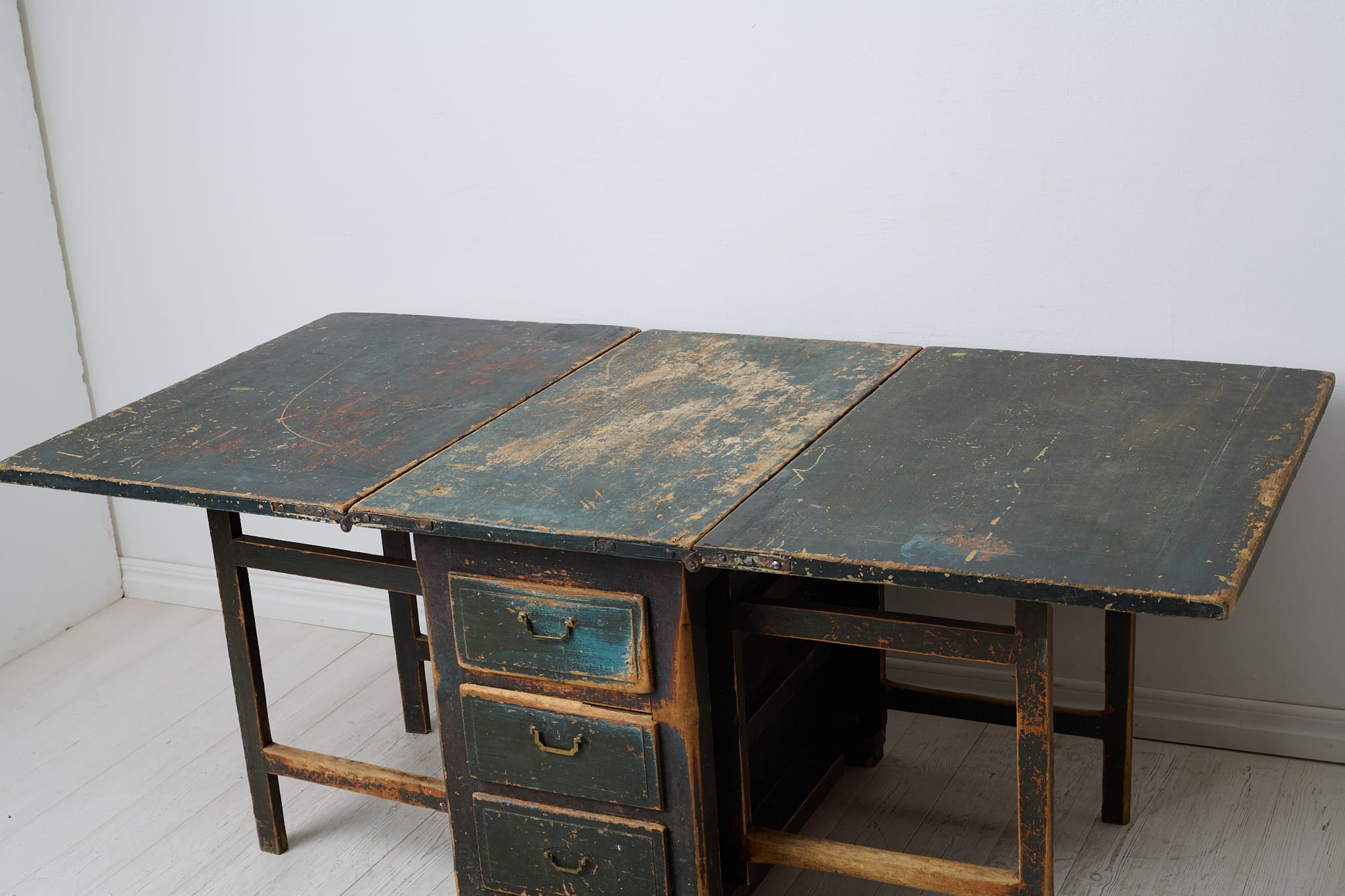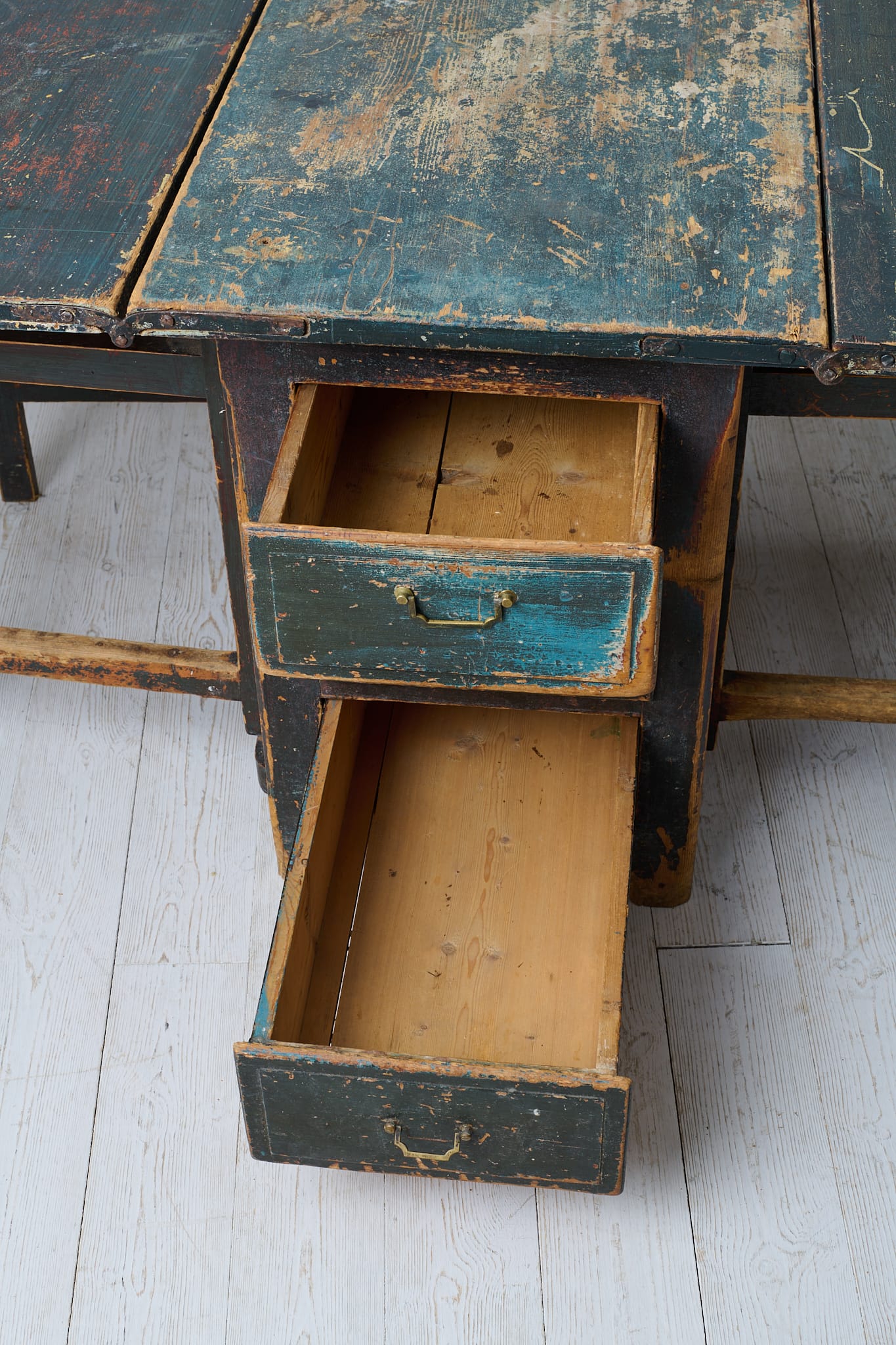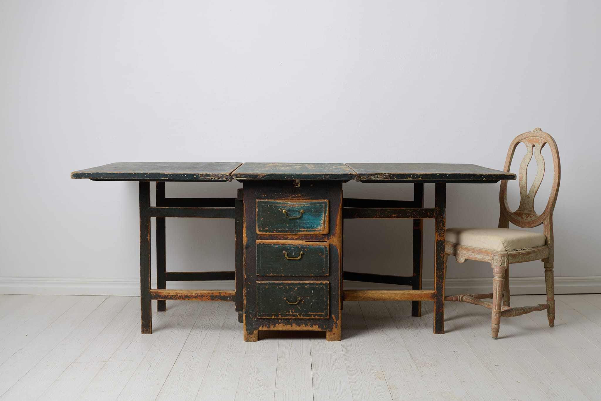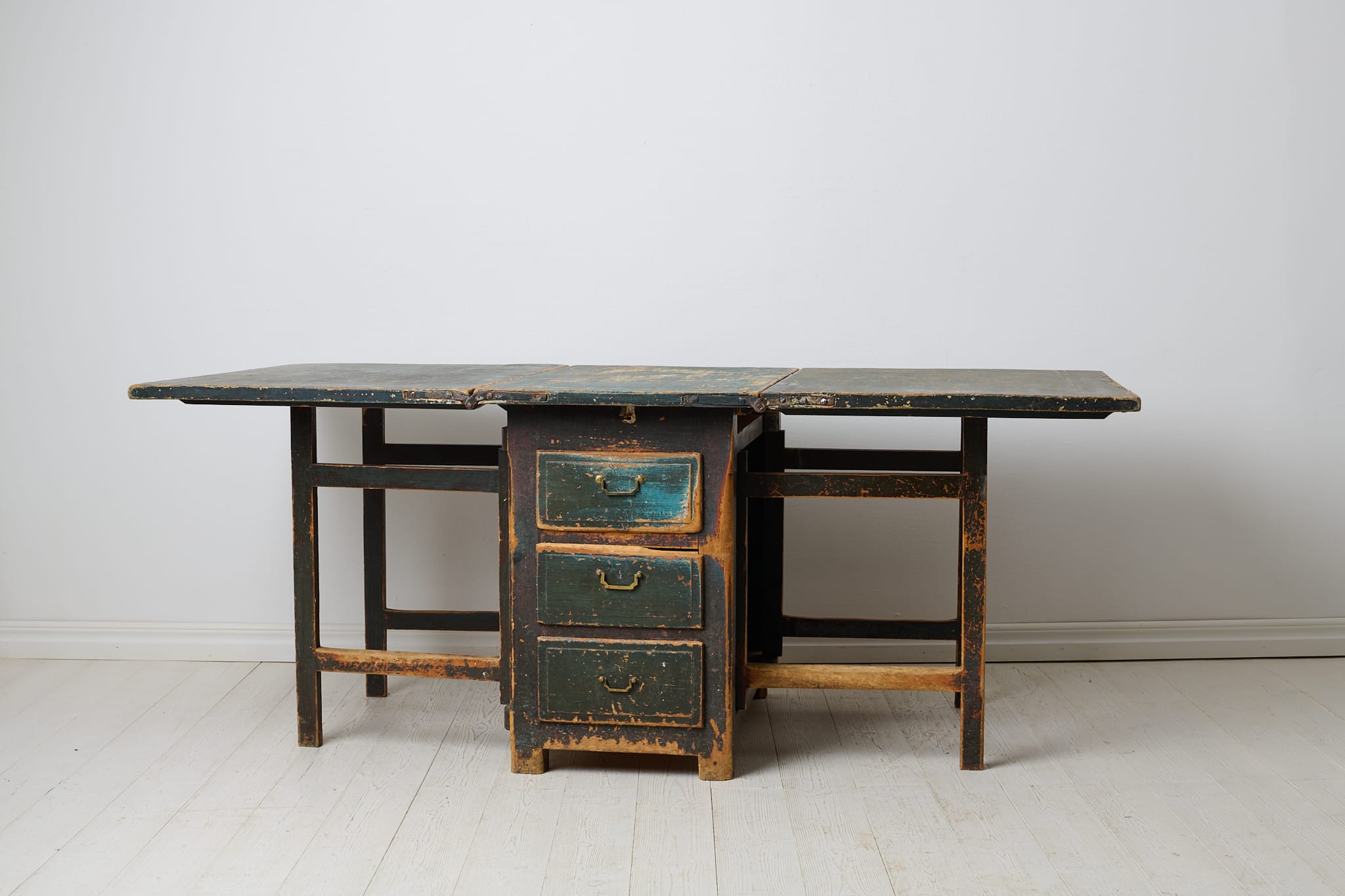 Folk art dining table from northern Sweden. Antique drop-leaf table with one leaf on each side and two gates for each leaf which makes it a stable and steady table. Can be used with both one or two leafs up. It is a more unusual model with extendable drawers in the centre section. Old, historic paint with a lot of character and patina with distress. Healthy and stable frame. There is a smaller loss of material on the edge of one drawer – see picture. The centre section is 53 cm and each leaf is 68 cm wide making the total width 189 cm.