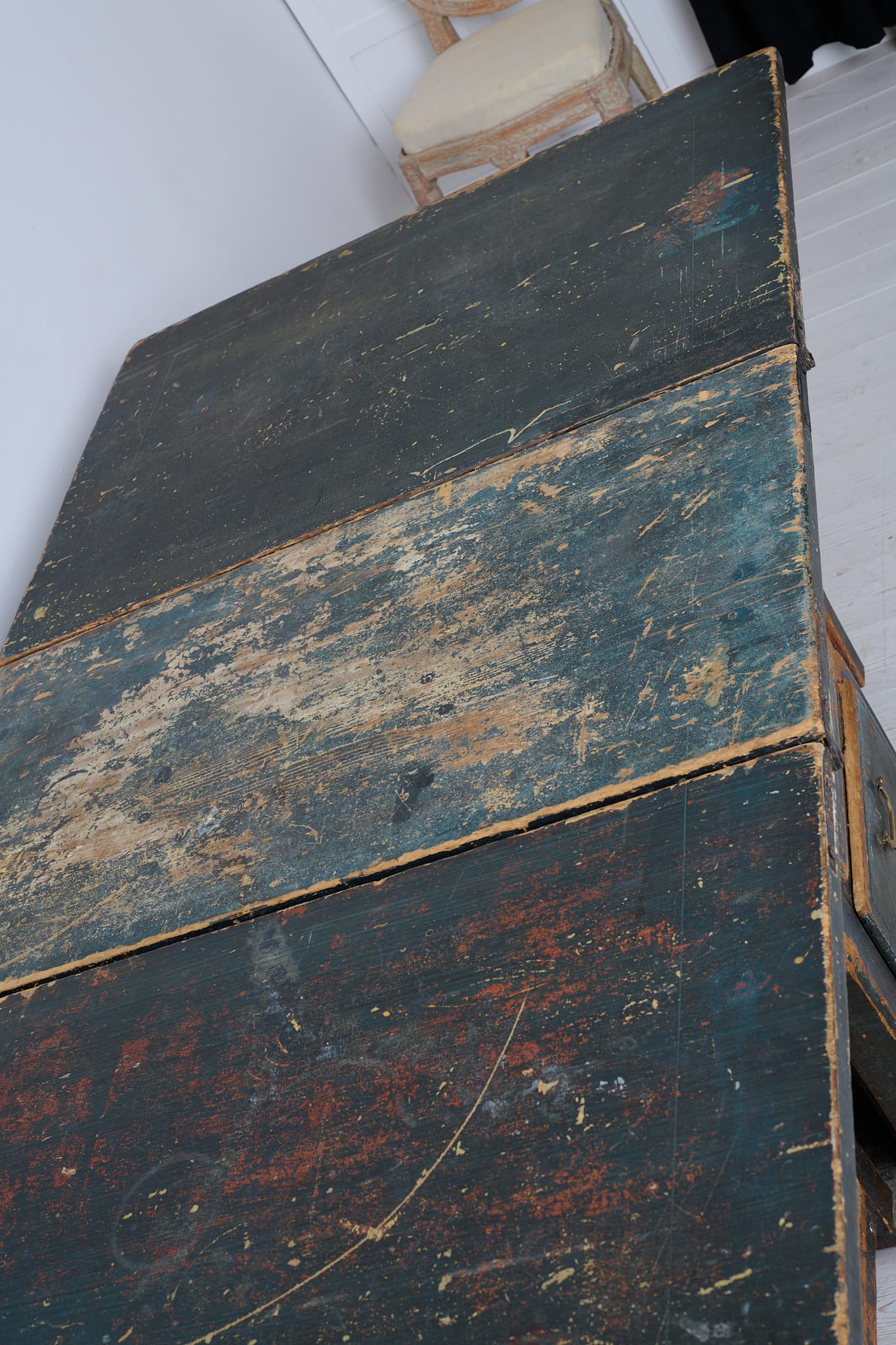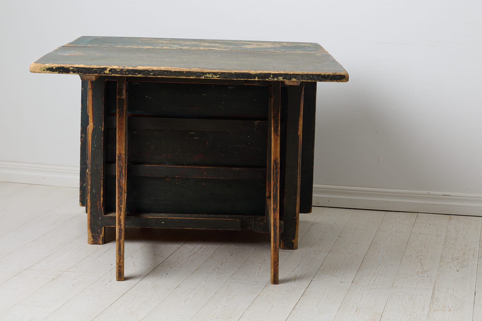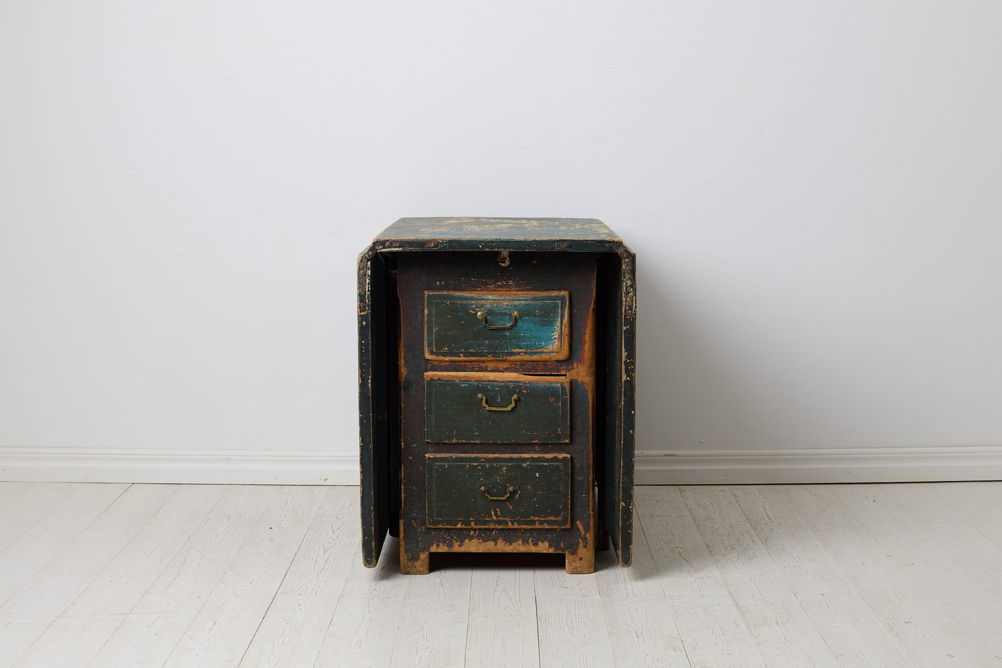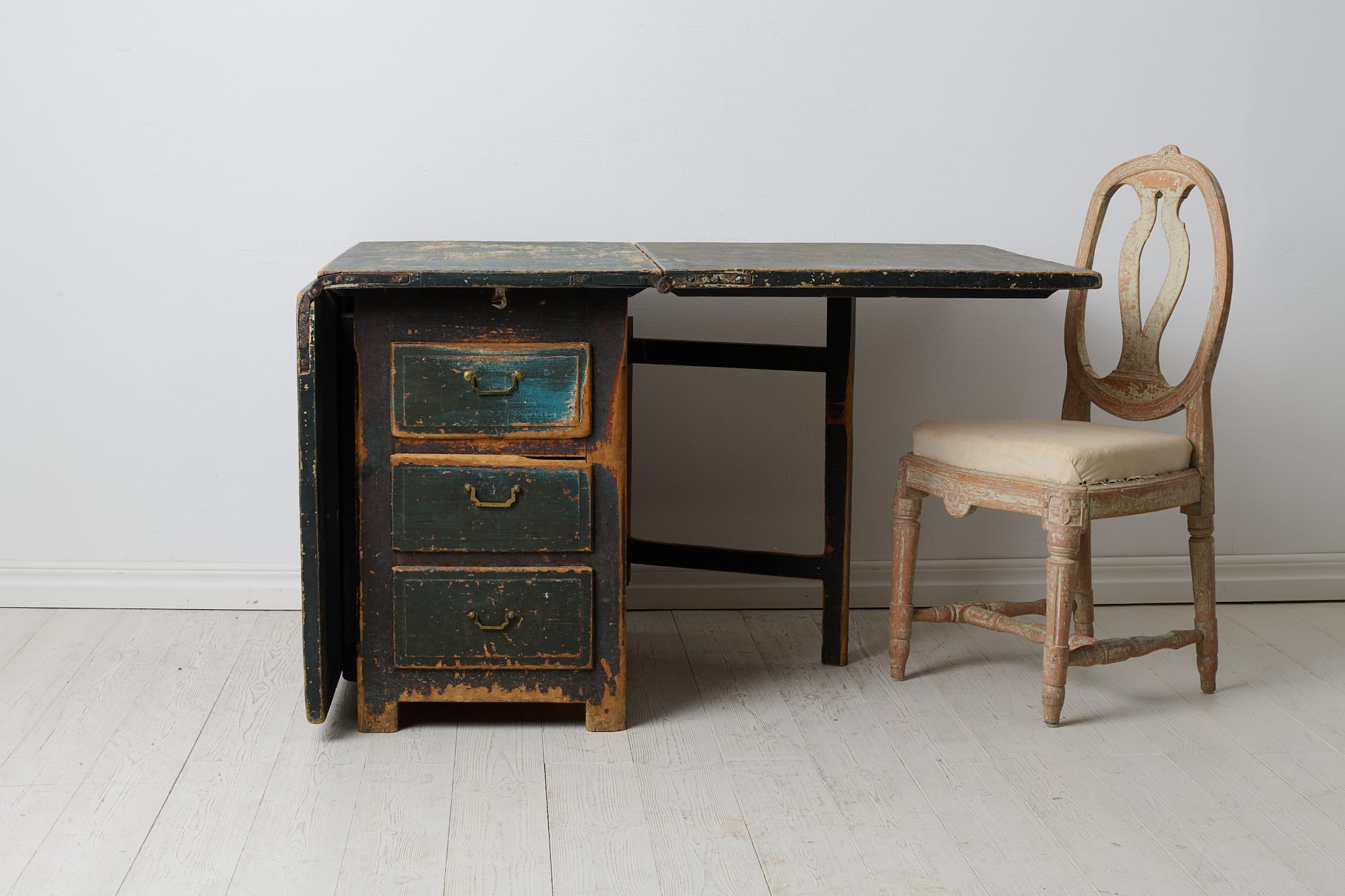 Folk art dining table from northern Sweden. Antique drop-leaf table with one leaf on each side and two gates for each leaf which makes it a stable and steady table. Can be used with both one or two leafs up. It is a more unusual model with extendable drawers in the centre section. Old, historic paint with a lot of character and patina with distress. Healthy and stable frame. There is a smaller loss of material on the edge of one drawer – see picture. The centre section is 53 cm and each leaf is 68 cm wide making the total width 189 cm.