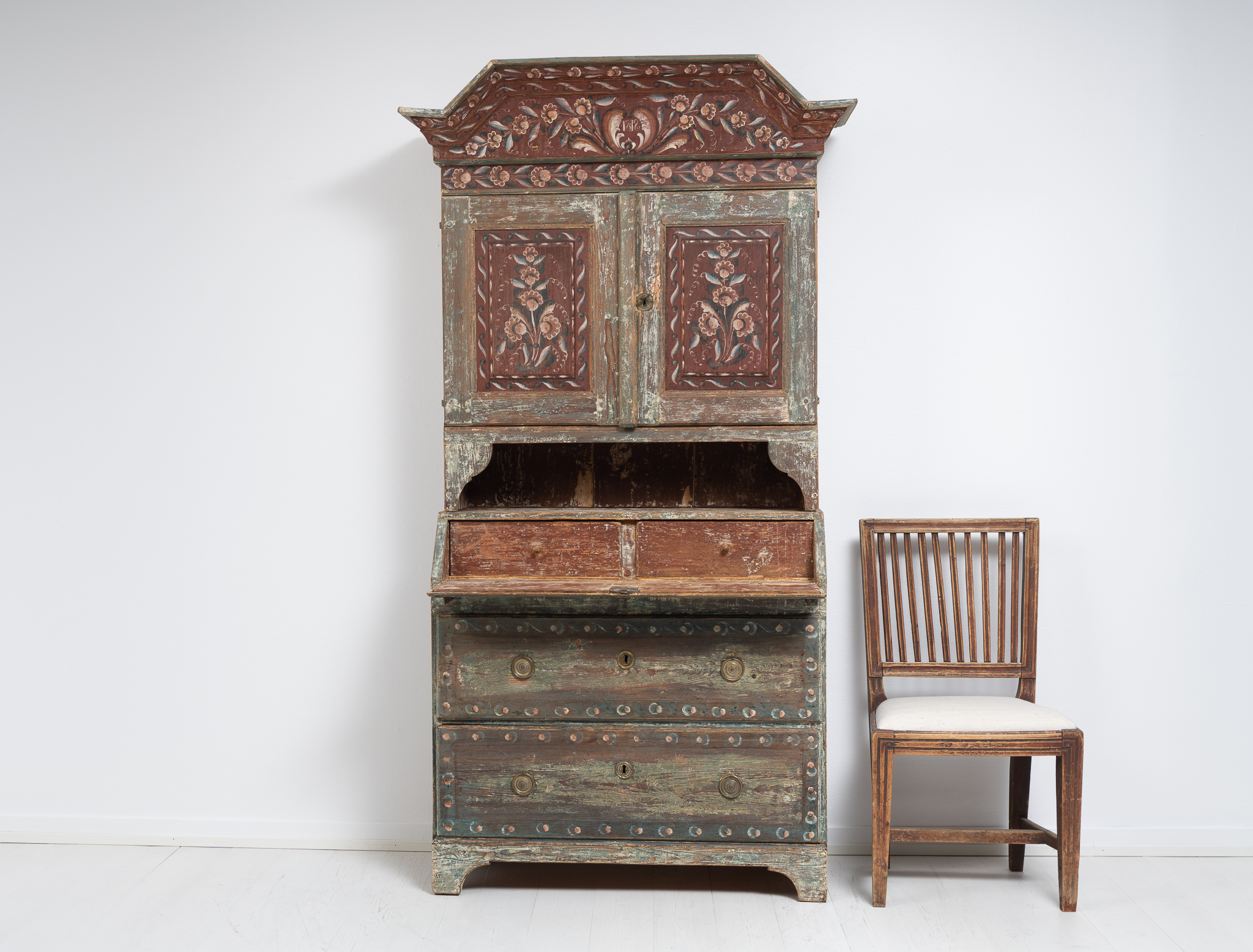Folk art secretary cabinet in two parts. The secretary cabinet has two large drawers, a writing desk and two upper doors with shelves inside. Original paint and dated 1818 on the pediment. The paint is distressed by time and use and has some wear. The cabinet is from Northern Sweden and is unusually decorated. The frame itself is straight and solid with sharp lines and a strong accentuated pediment. The paint is detailed around the sides of the drawers, across the doors and over the pediment. The motif is mainly floral with some additional patterns and will undoubtedly draw the eye, making the whole cabinet stand out.