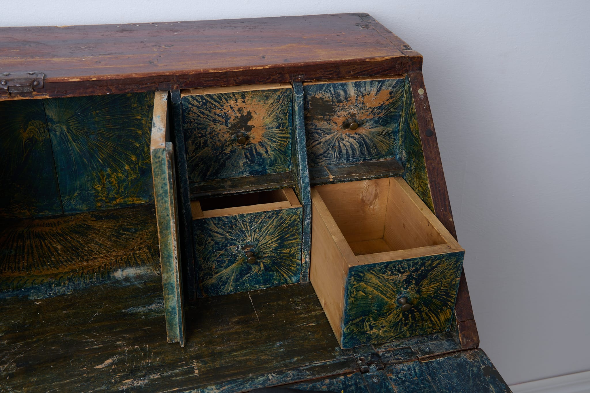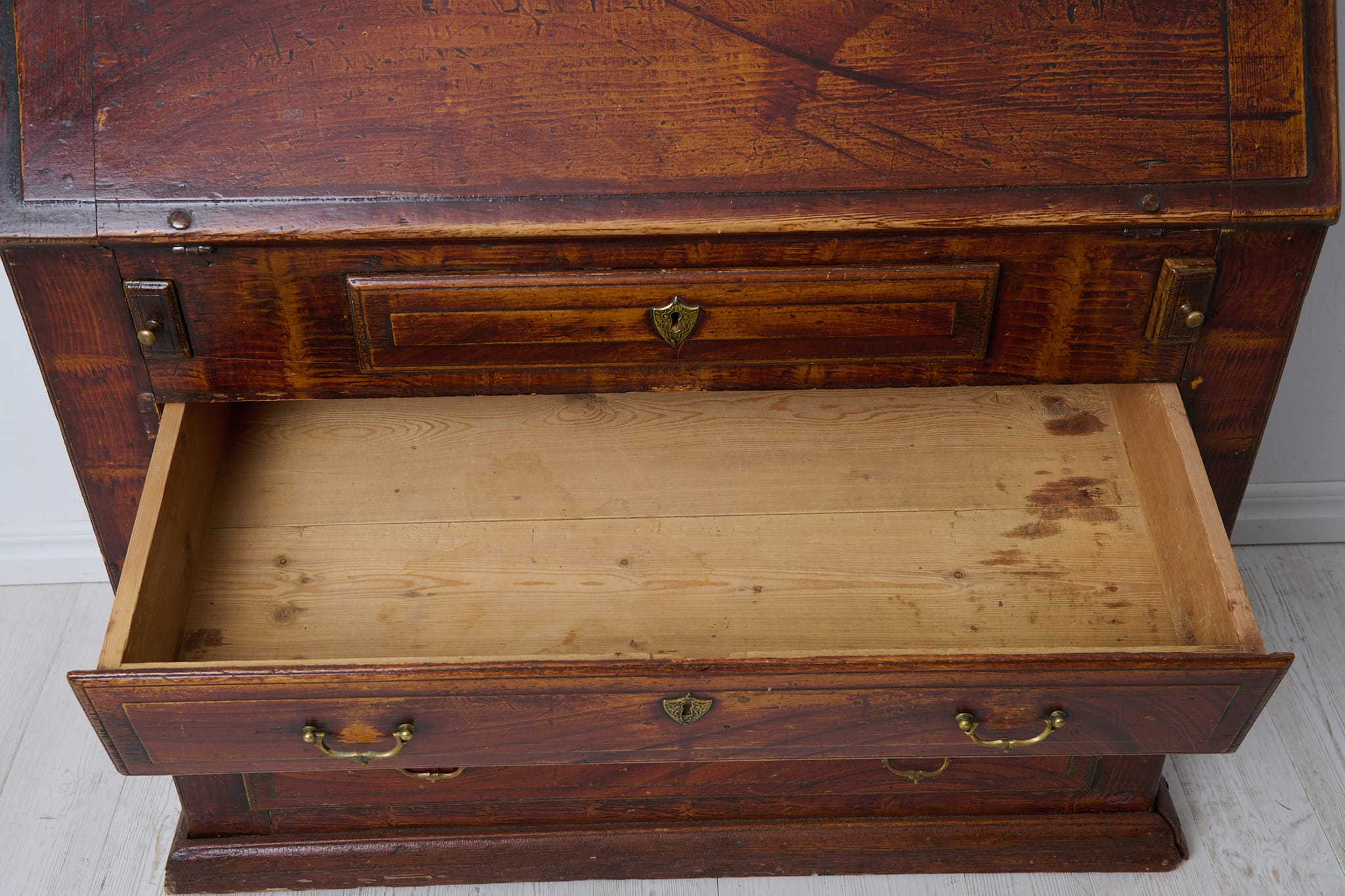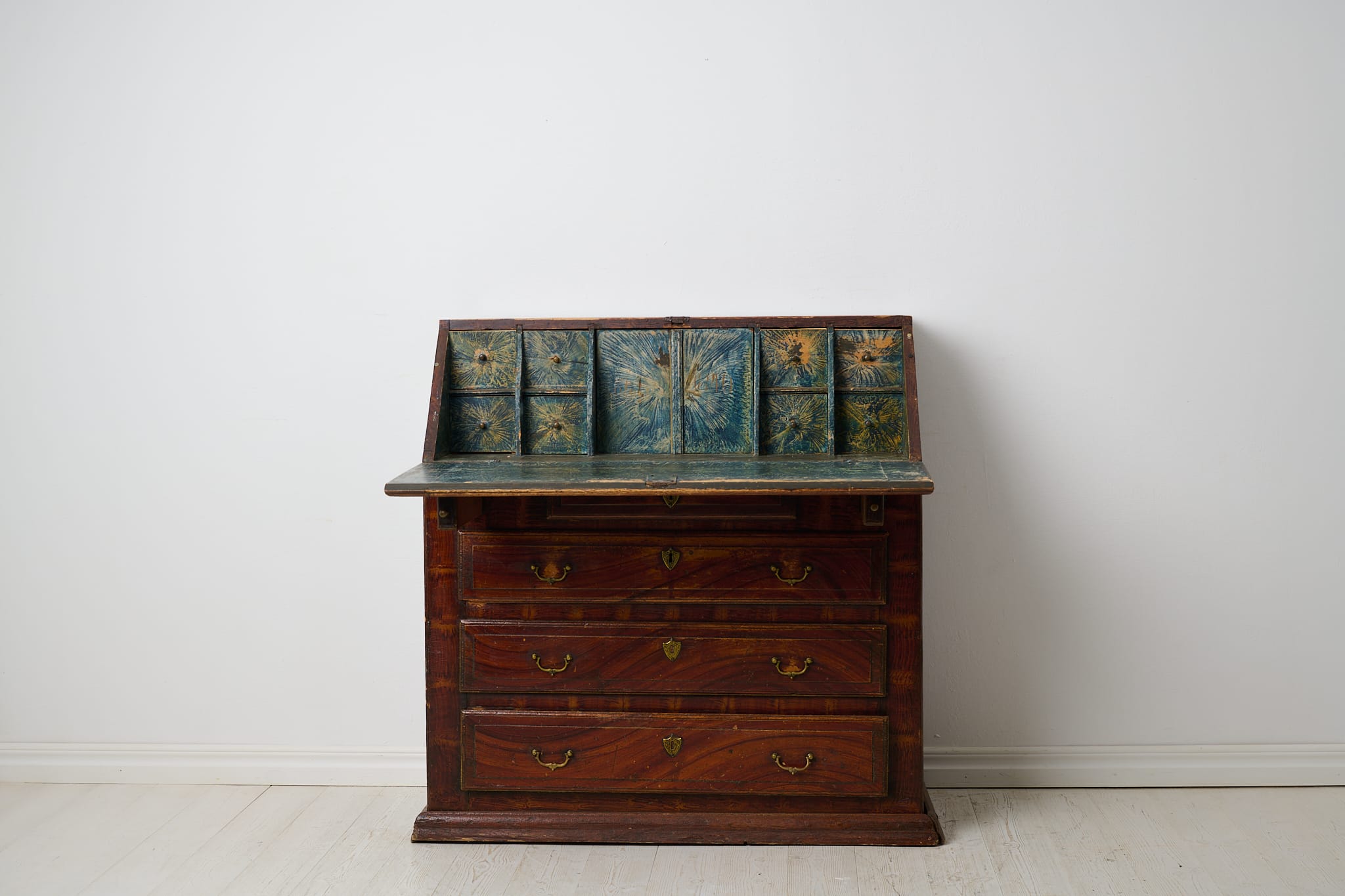 Folk art secretary desk with a painted date, 1840, and initials. This genuine folk art furniture was made in northern Sweden during the 1800s. The front has four working drawers, a writing desk and small drawers behind the desk. Original condition with the original first layer of mahogany faux paint. The secretary desk has an unusual blue interior paint which is also original.