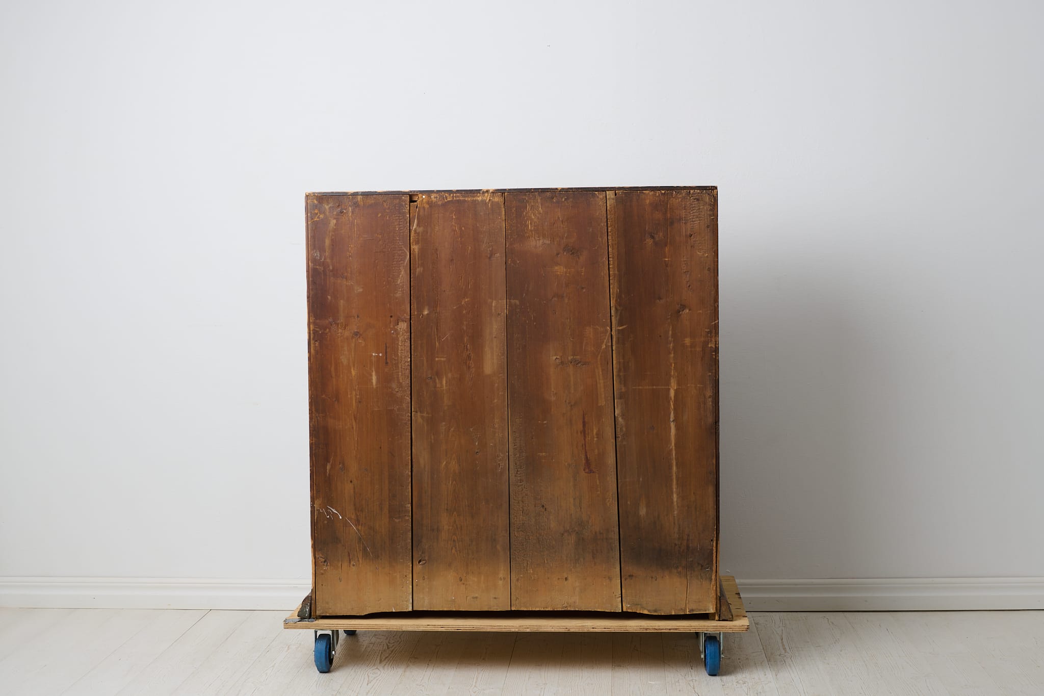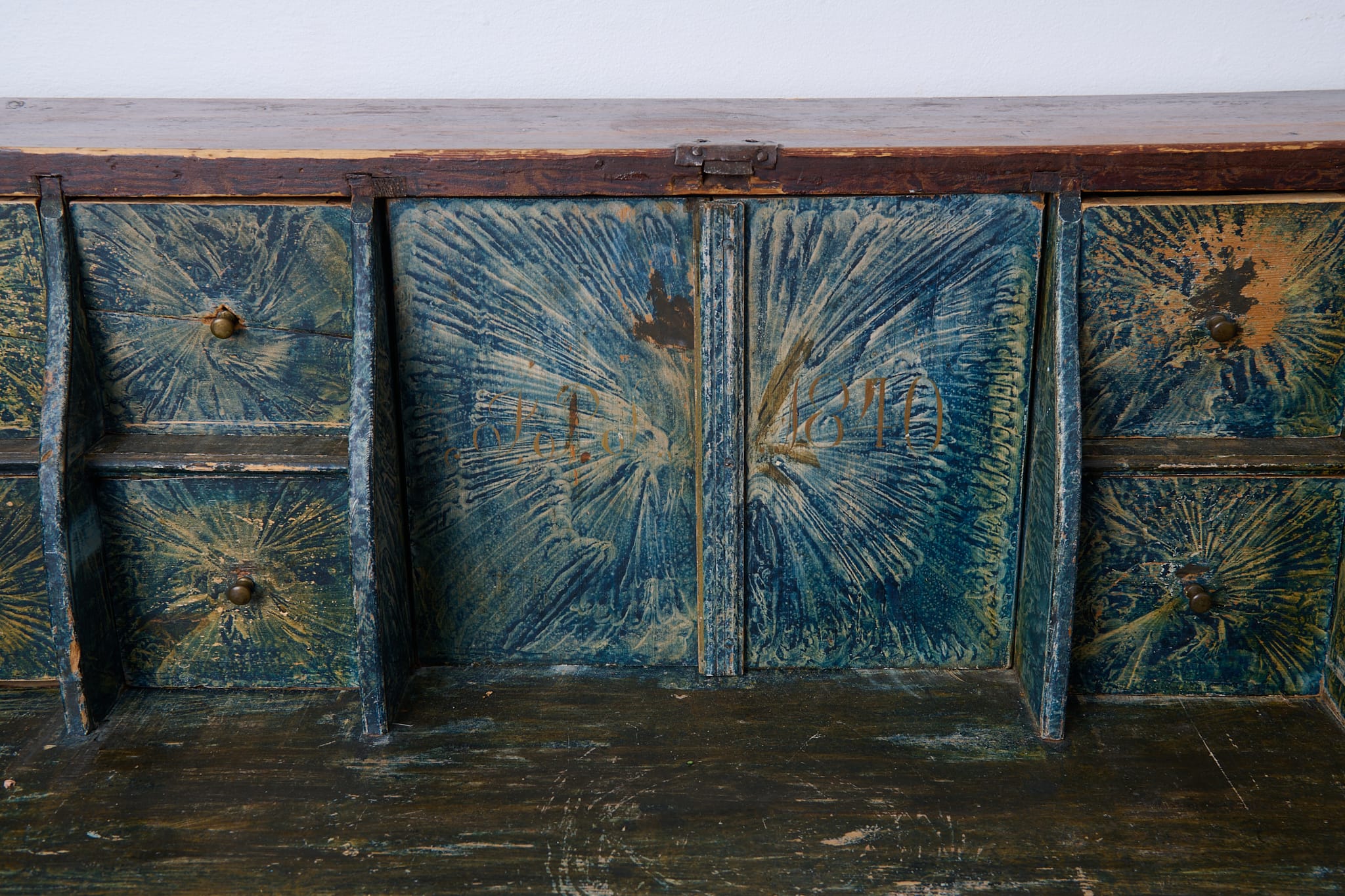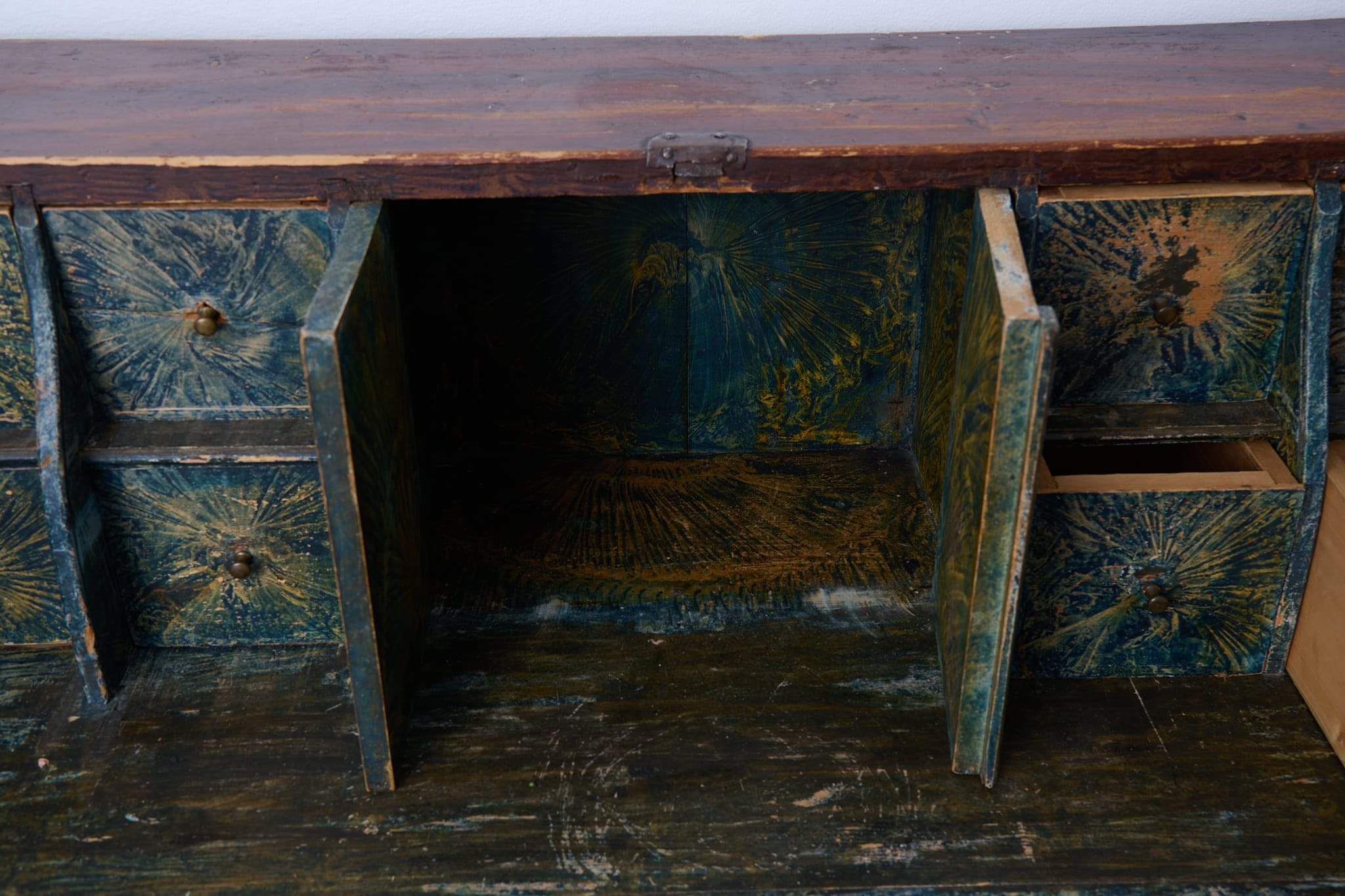 Folk art secretary desk with a painted date, 1840, and initials. This genuine folk art furniture was made in northern Sweden during the 1800s. The front has four working drawers, a writing desk and small drawers behind the desk. Original condition with the original first layer of mahogany faux paint. The secretary desk has an unusual blue interior paint which is also original.