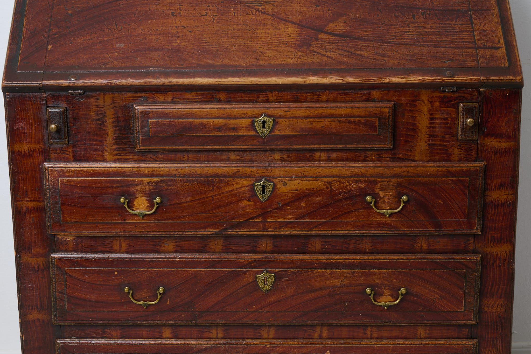 The piece shows its history with distress to the paint and minor traces of use. The secretary is well made with a healthy and stable frame. Original hardware in brass that has lightly oxidised from the passing of time. Height to the desk when open is 82 cm and the depth is 46 and 21 cm respectively.