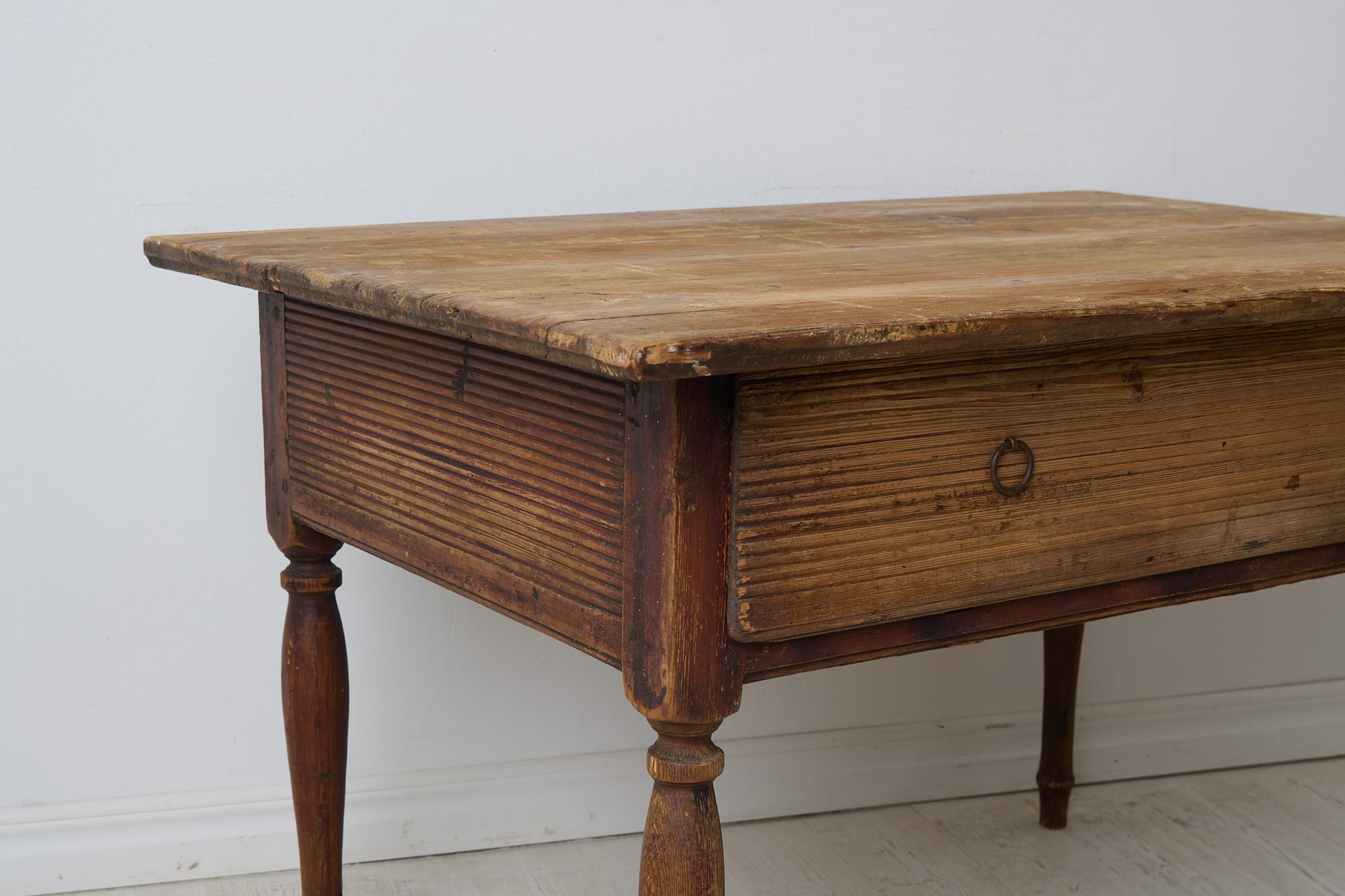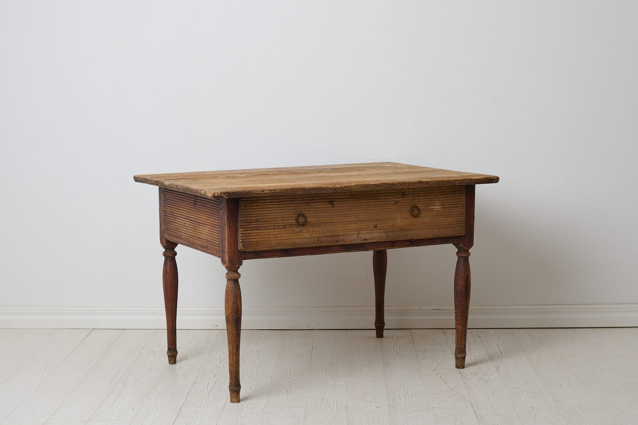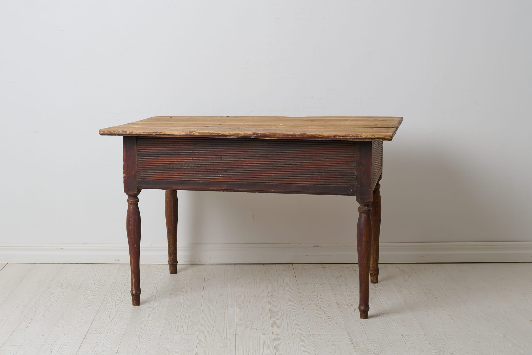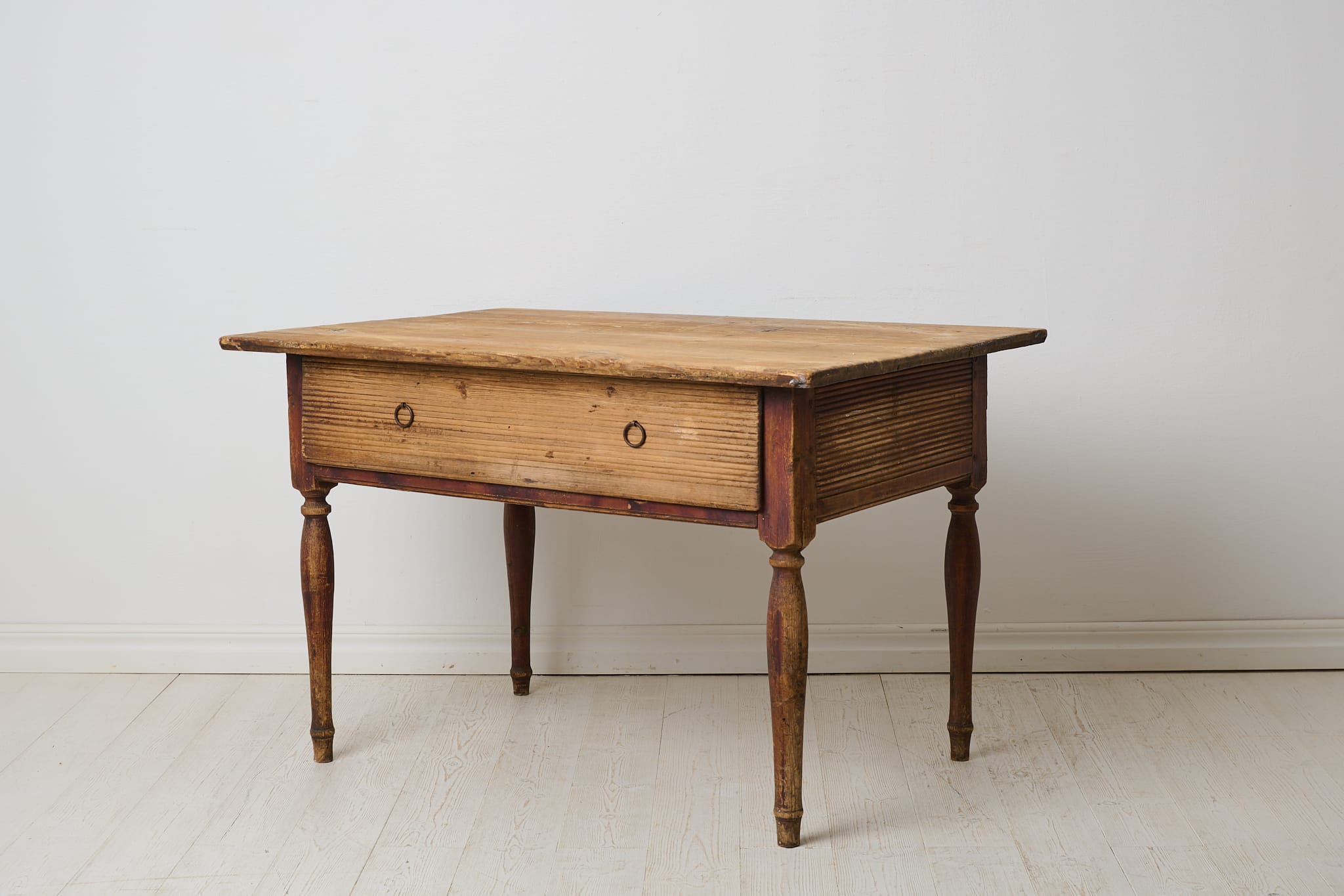 Genuine antique country table from the empire period around 1830. The table is made by hand from solid pine in northern Sweden. Untouched original condition, the age and history can be read in every mark and trace of use. Distressed original paint, the table top has never been painted. The table has one large drawer which is in functional condition. Apron with original hand-carved fluted wooden decor. Healthy and stable frame. Height to apron is 49 cm.
