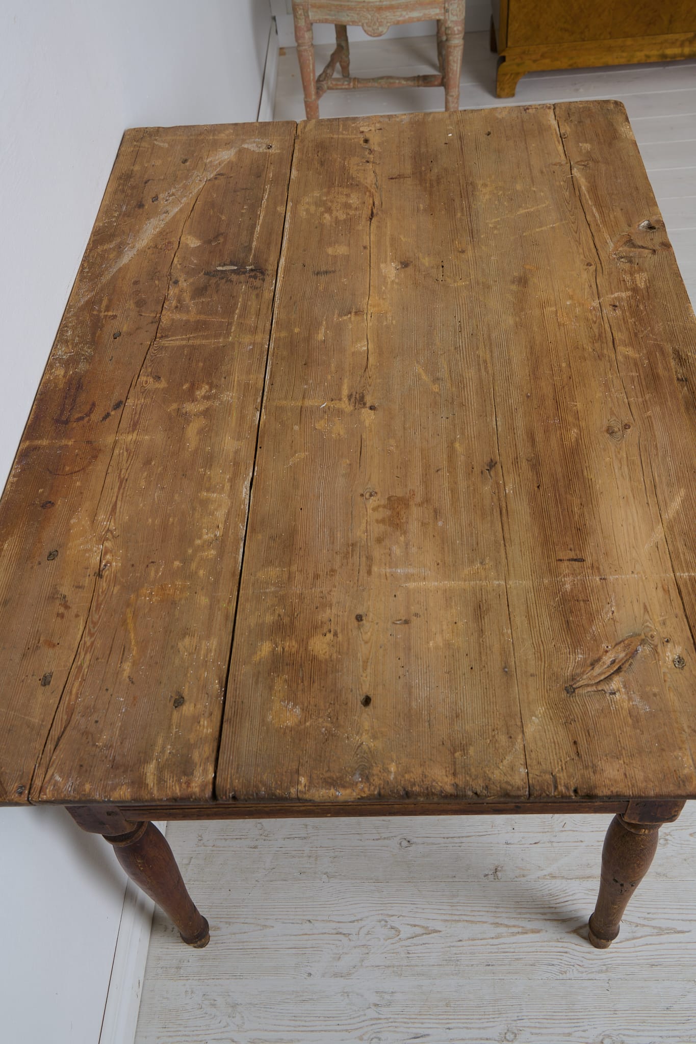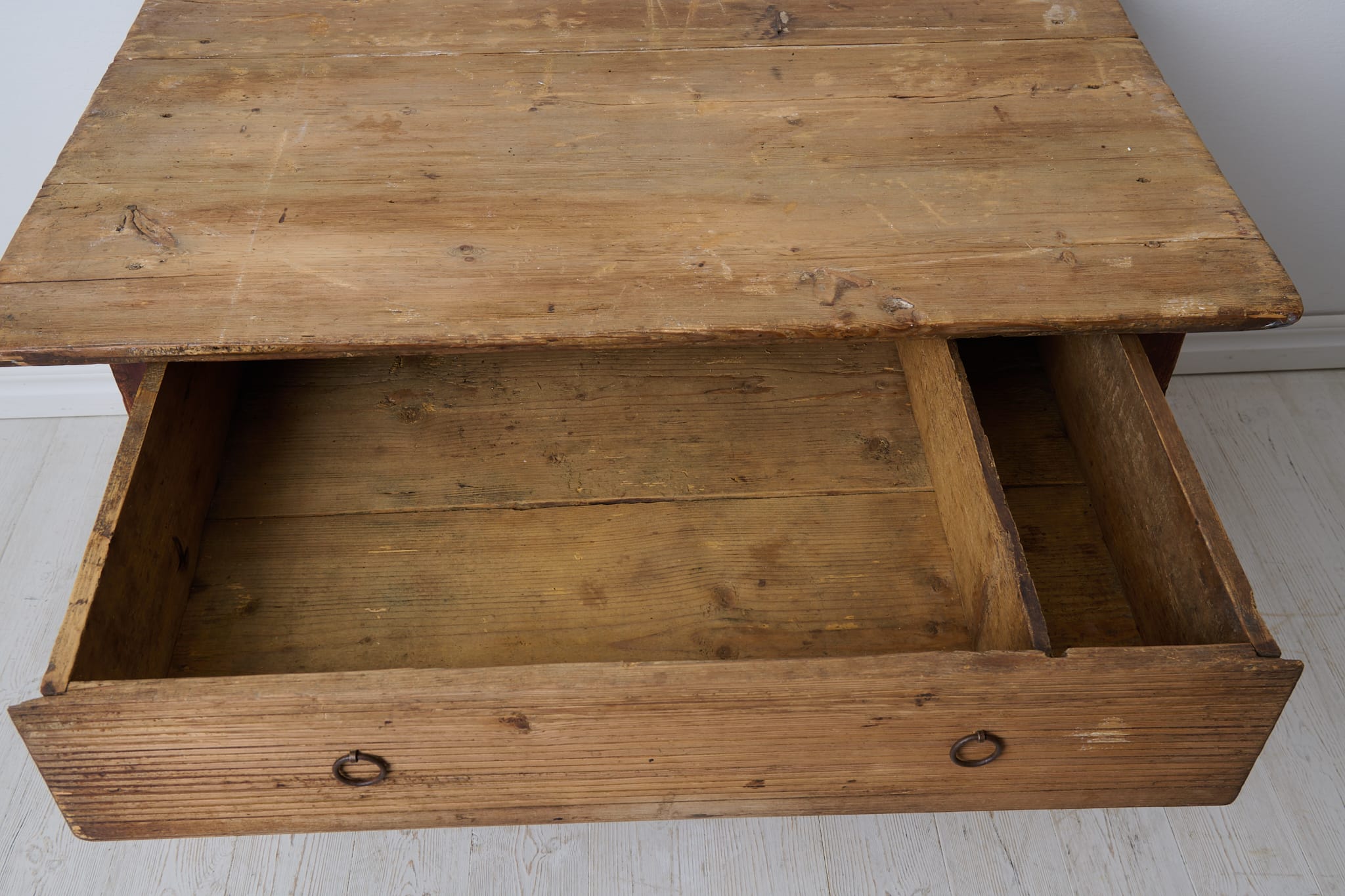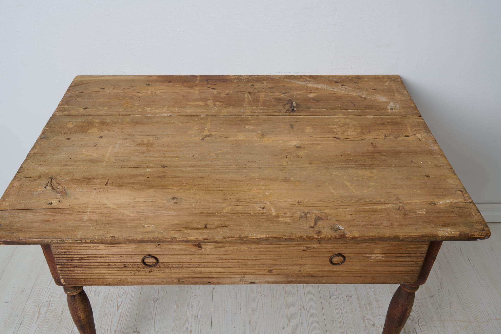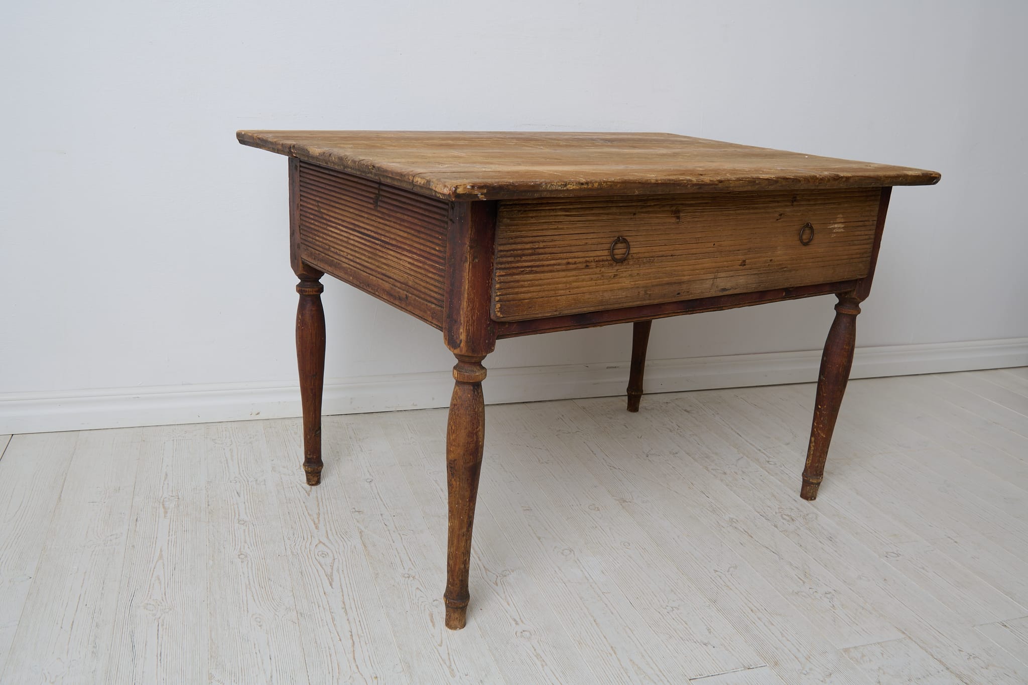 Genuine antique country table from the empire period around 1830. The table is made by hand from solid pine in northern Sweden. Untouched original condition, the age and history can be read in every mark and trace of use. Distressed original paint, the table top has never been painted. The table has one large drawer which is in functional condition. Apron with original hand-carved fluted wooden decor. Healthy and stable frame. Height to apron is 49 cm.