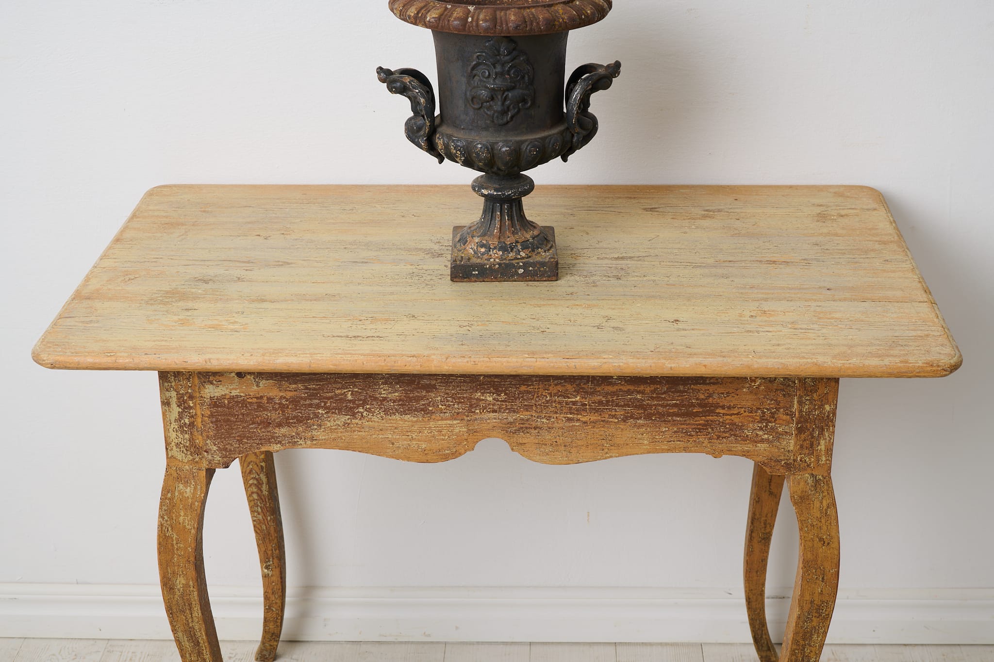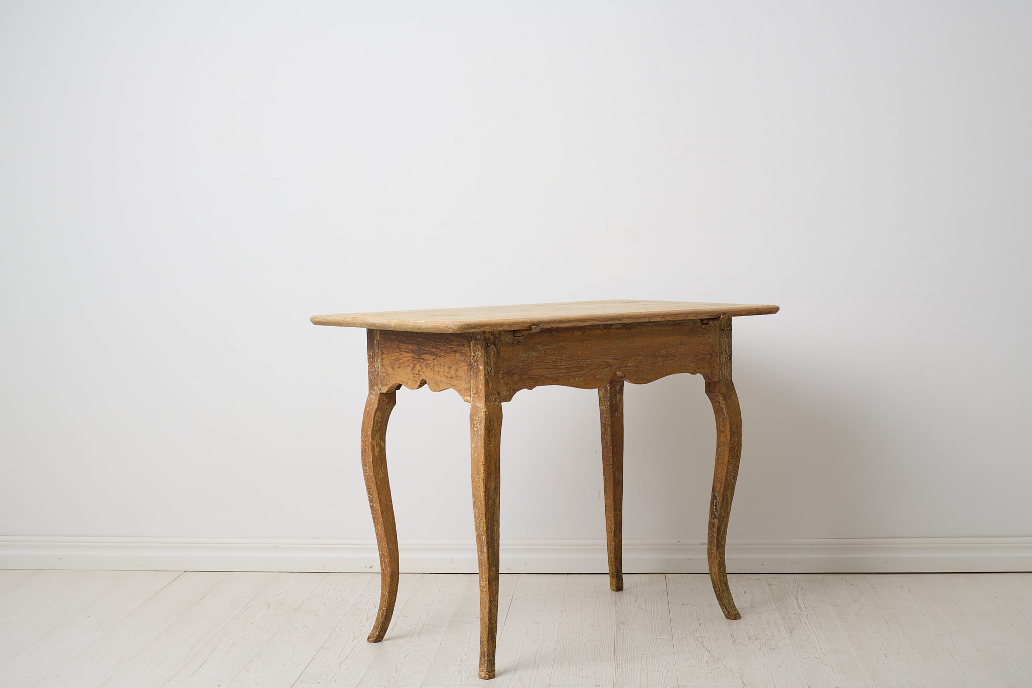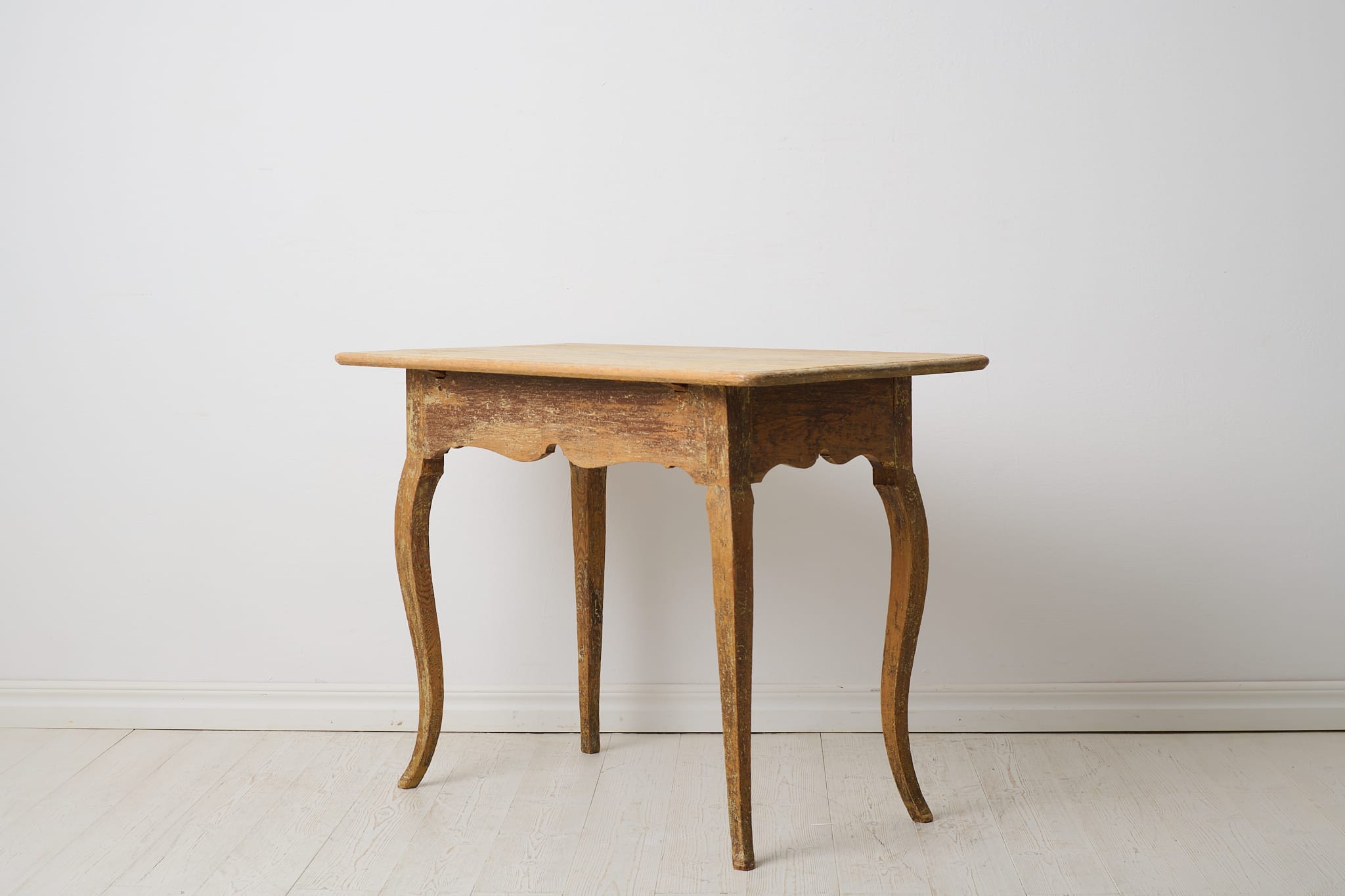 Genuine antique rococo table from northern Sweden. The table rectangular and the same from both sides. From the rococo period around 1770. The table has elegantly surved legs and a bevelled apron. Unique rustic surface that shows the history of the piece with traces of the original paint. Healthy and stable with a solid frame in pine.