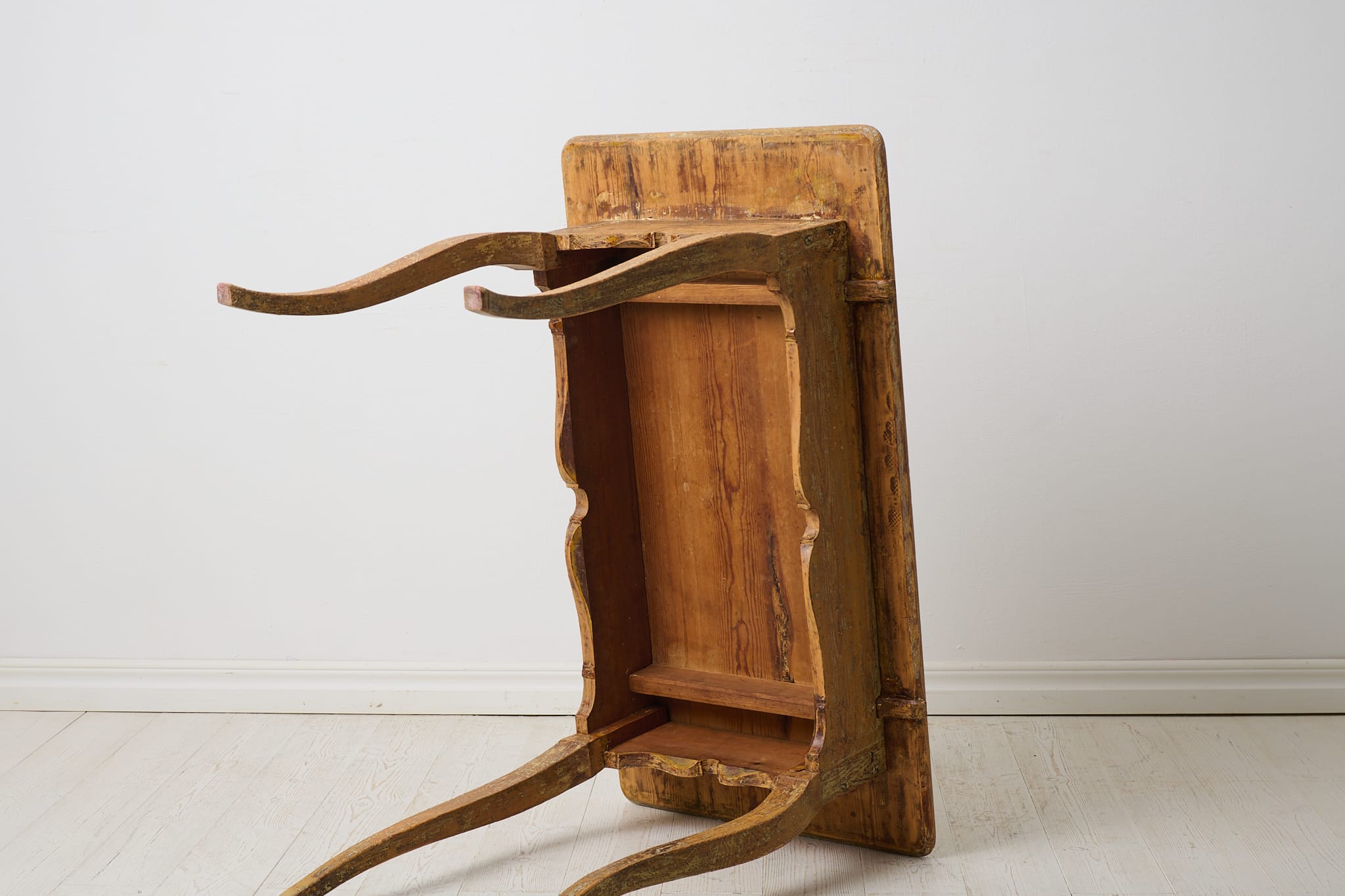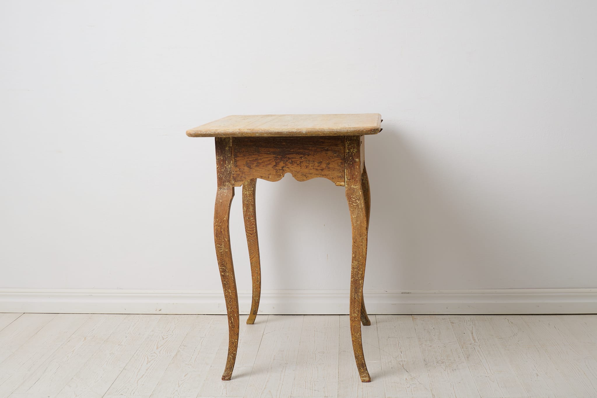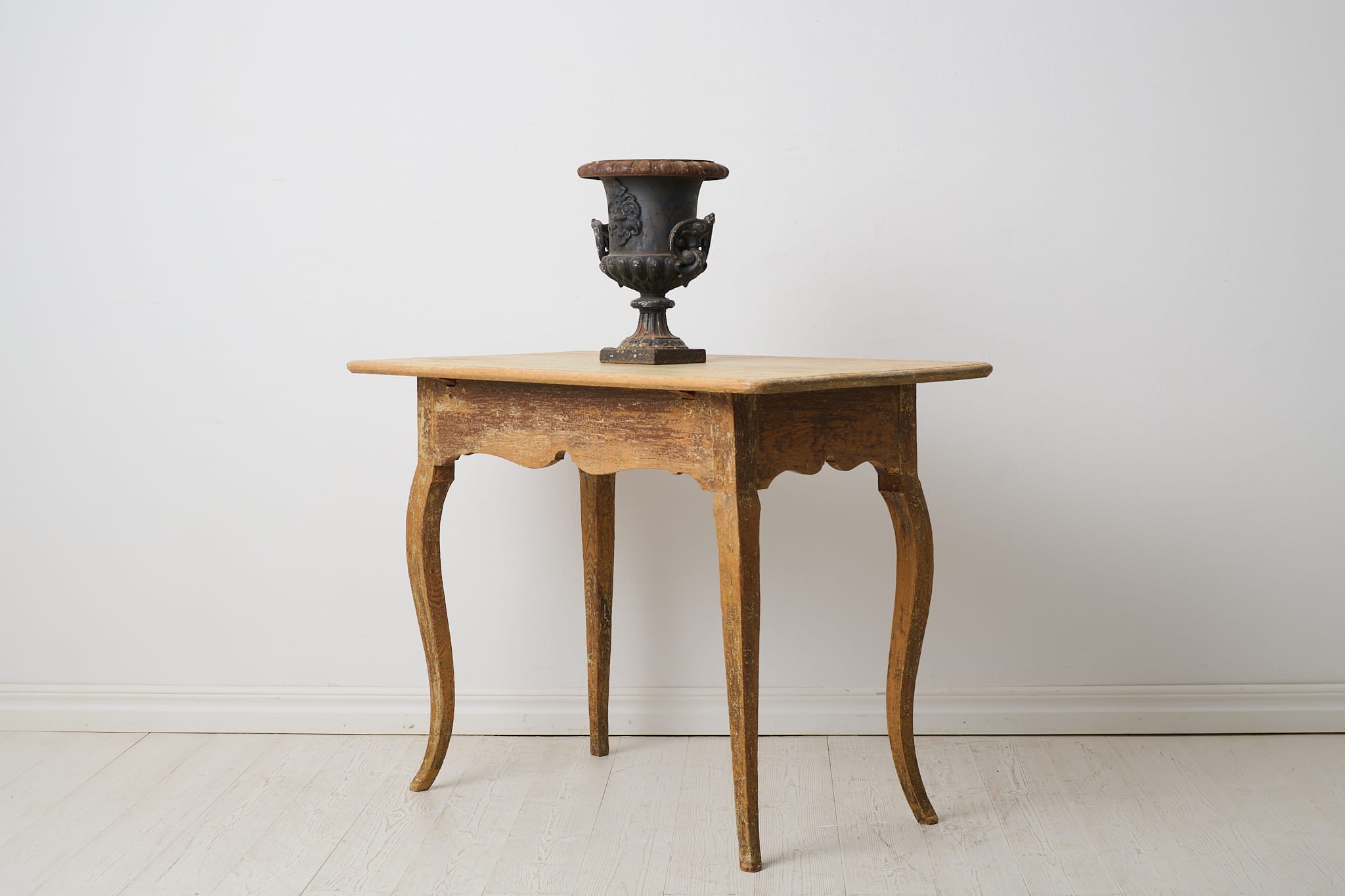 Genuine antique rococo table from northern Sweden. The table rectangular and the same from both sides. From the rococo period around 1770. The table has elegantly surved legs and a bevelled apron. Unique rustic surface that shows the history of the piece with traces of the original paint. Healthy and stable with a solid frame in pine.