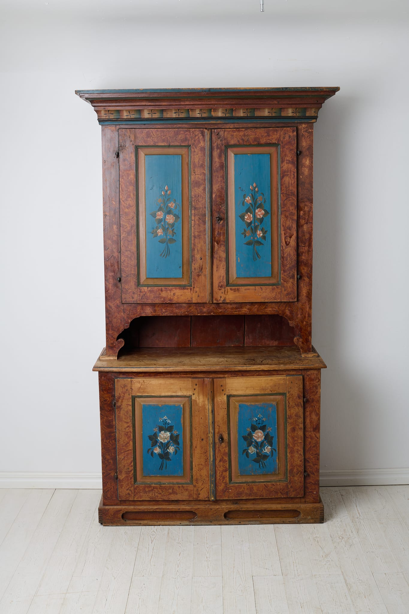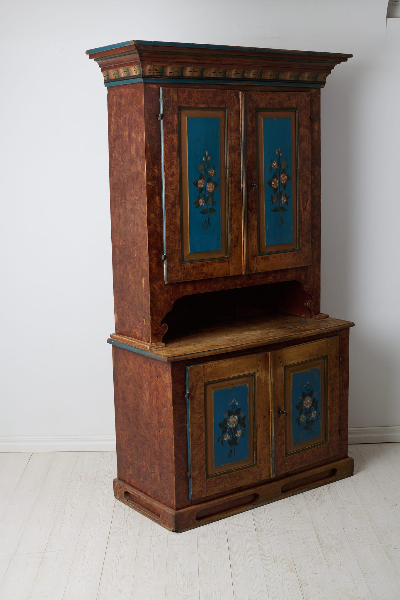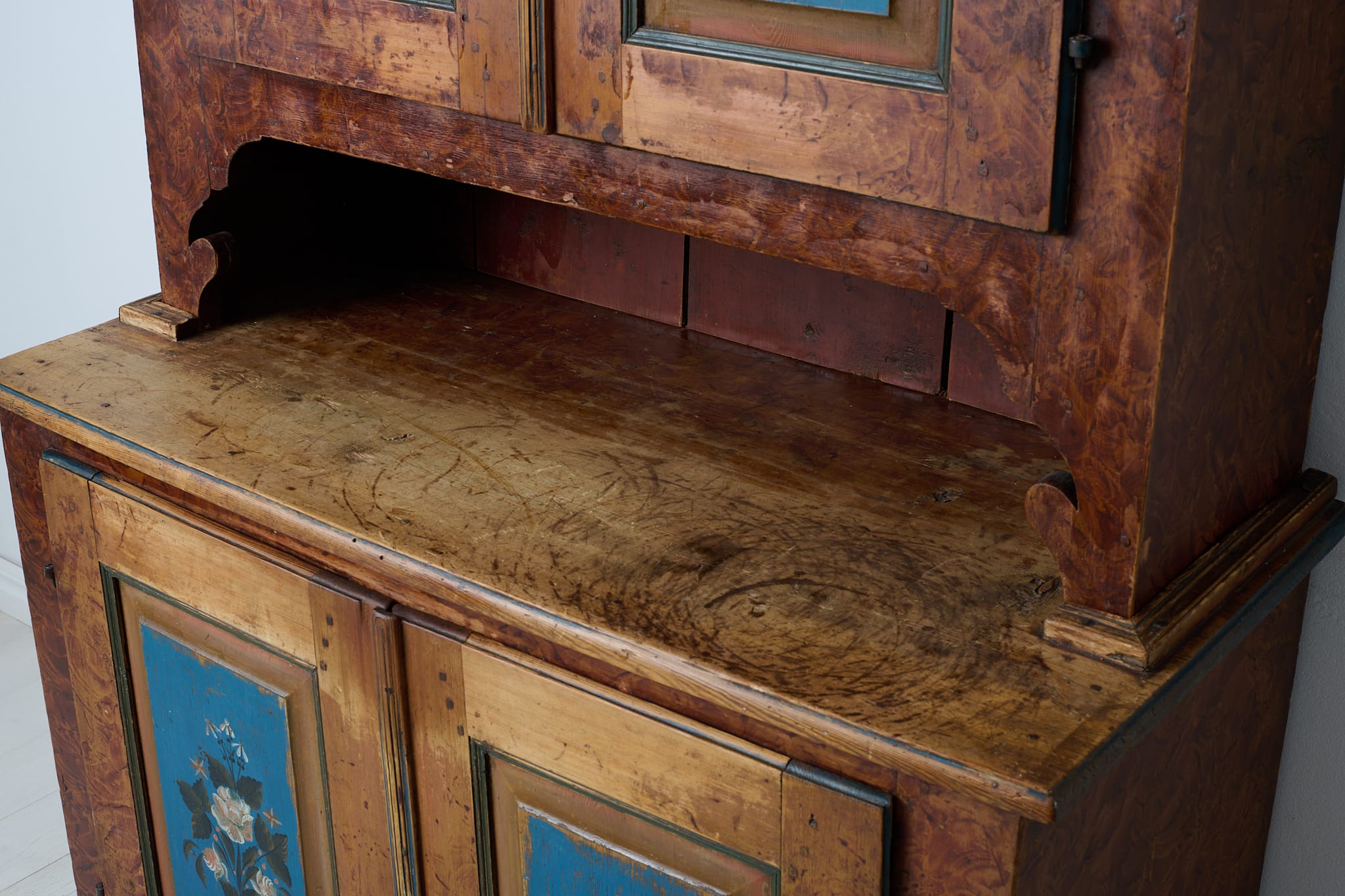 Genuine antique Swedish cabinet from northern Sweden made around 1840. This genuine country house furniture is made by hand in solid pine in two parts. Original paint from the first half of the 19th century. The paint shows its age through distress and smaller marks and traces of use. Healthy and stable frame with working locks and keys. Dark marks, most likely from hot pots and pans, on the table top of the lower cabinet, see picture.