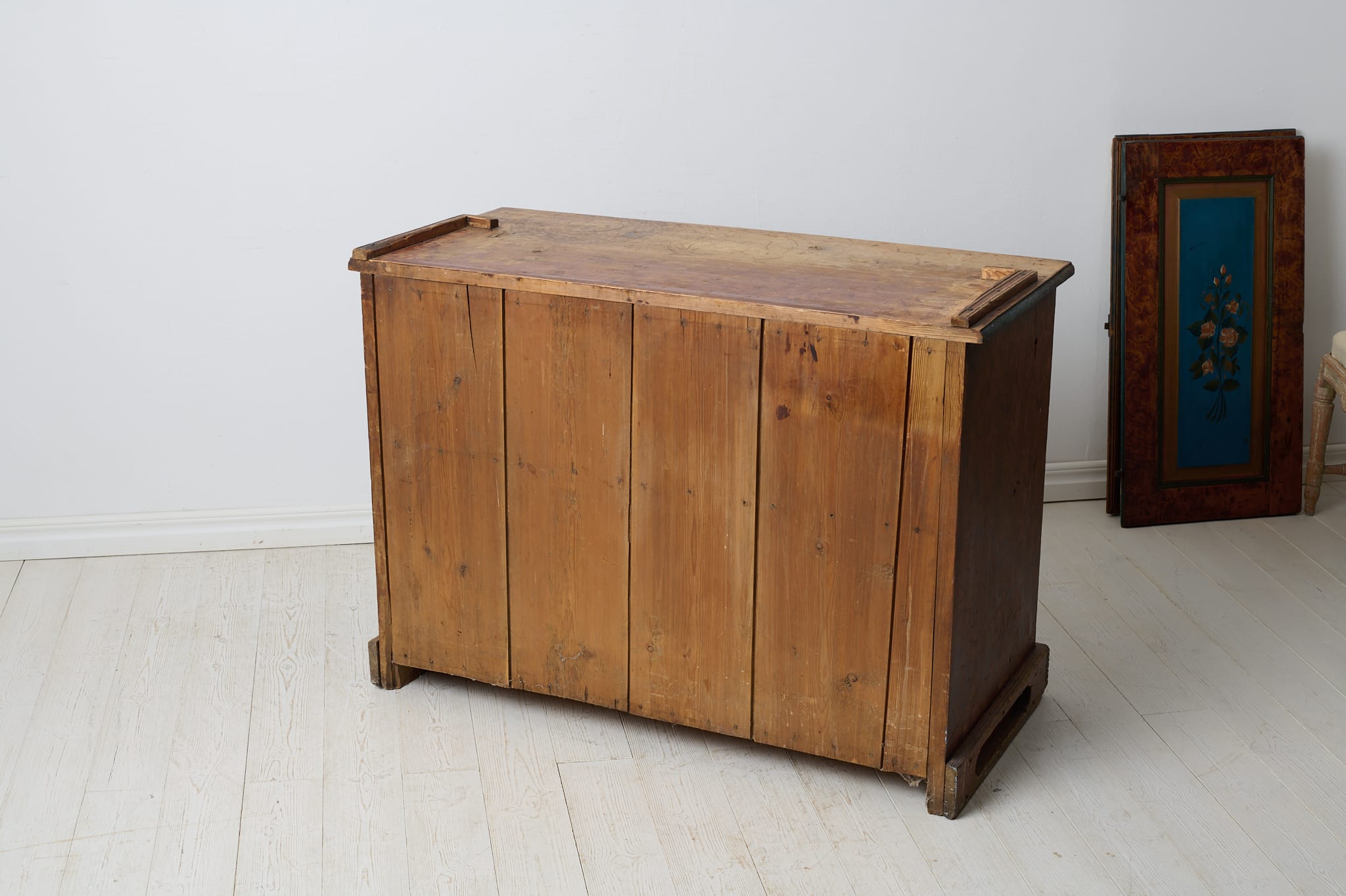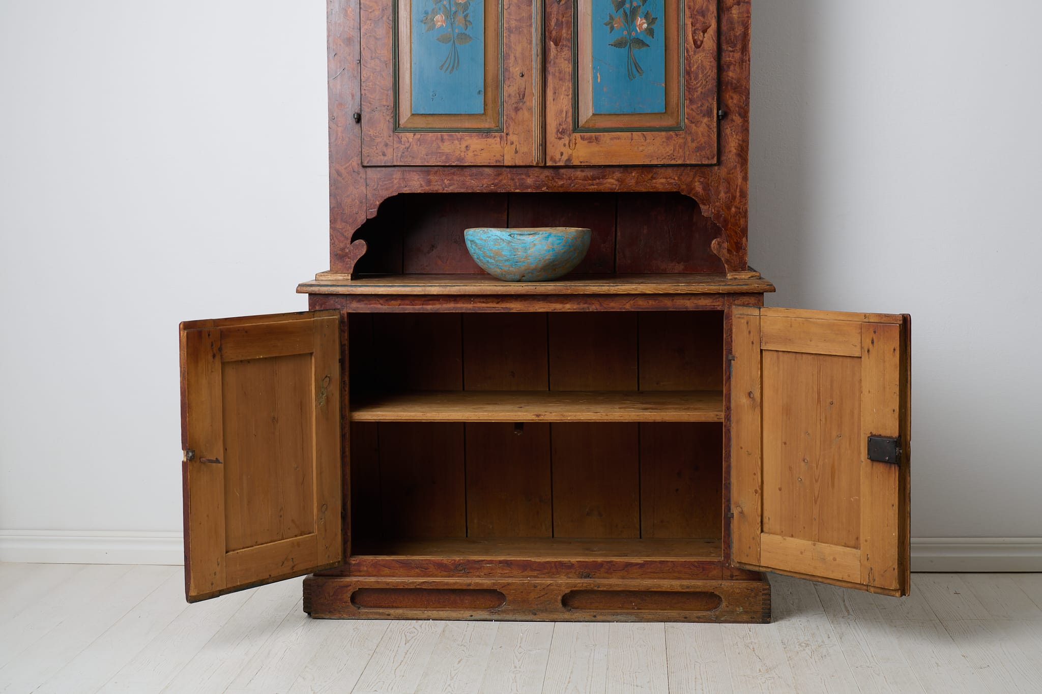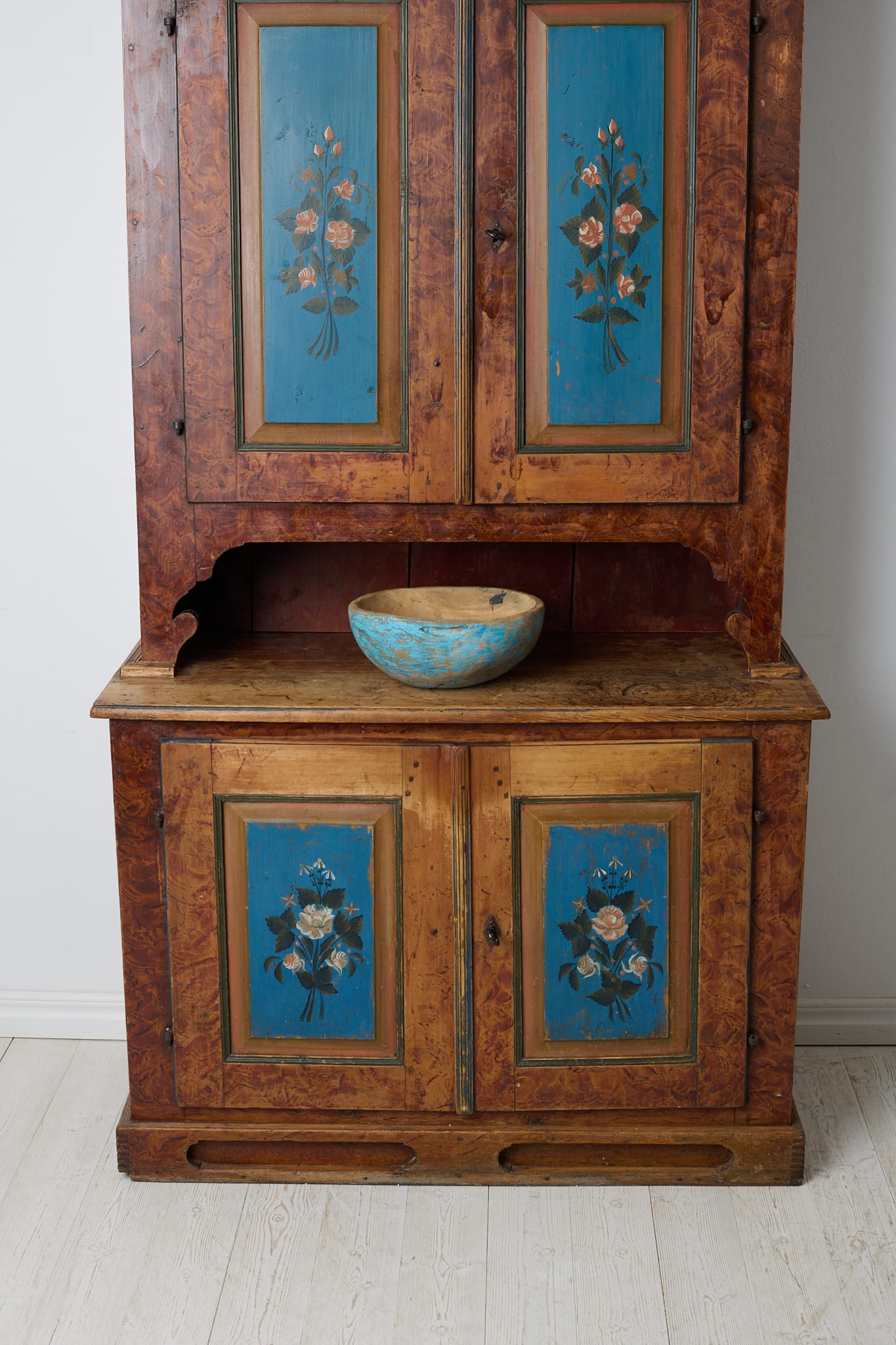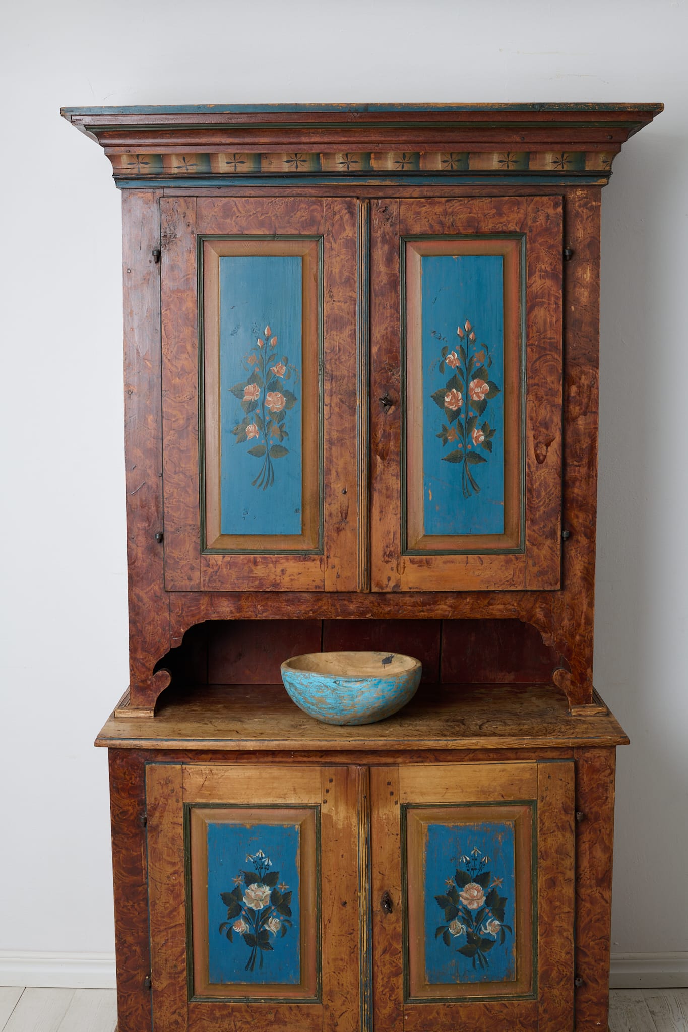 Genuine antique Swedish cabinet from northern Sweden made around 1840. This genuine country house furniture is made by hand in solid pine in two parts. Original paint from the first half of the 19th century. The paint shows its age through distress and smaller marks and traces of use. Healthy and stable frame with working locks and keys. Dark marks, most likely from hot pots and pans, on the table top of the lower cabinet, see picture.