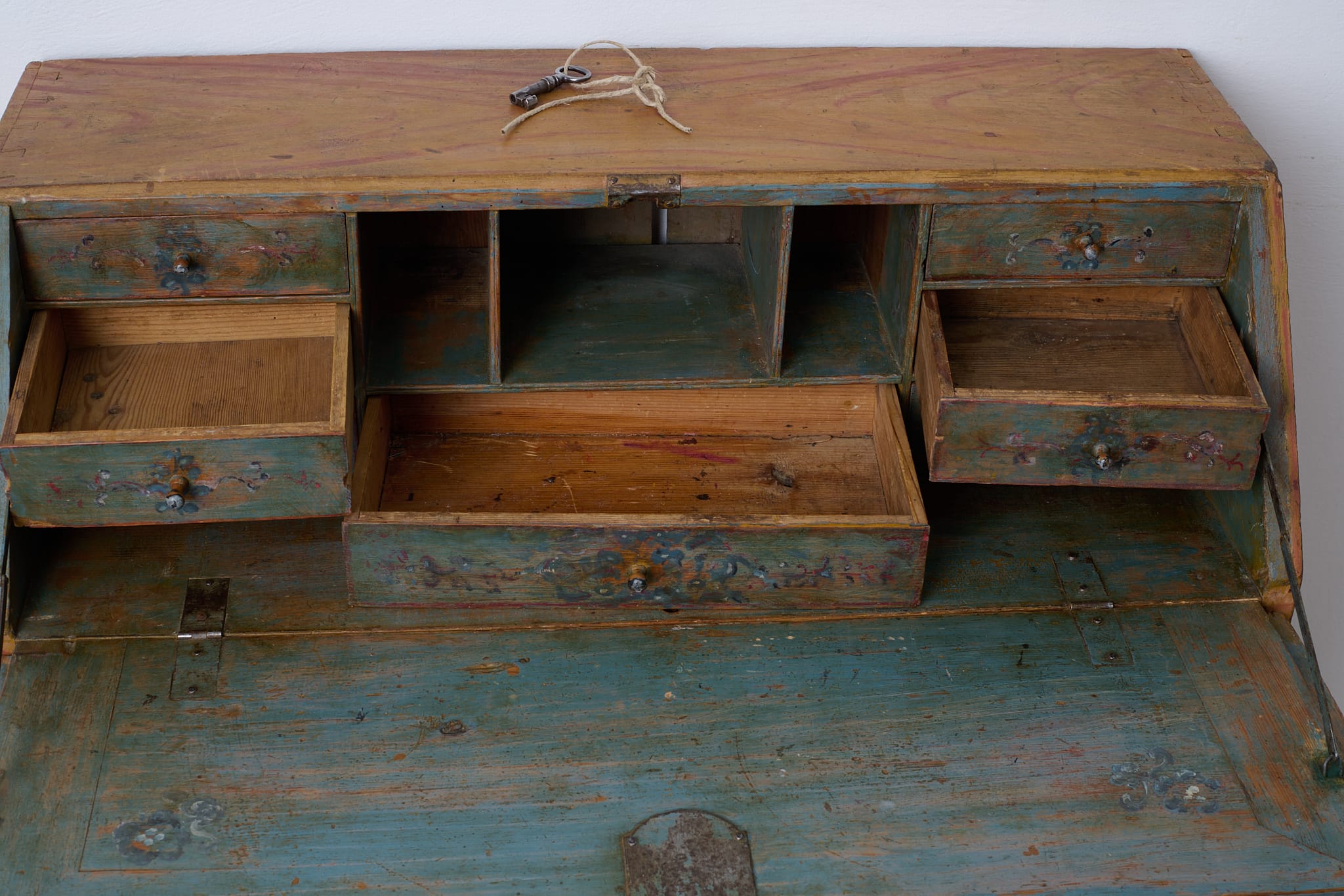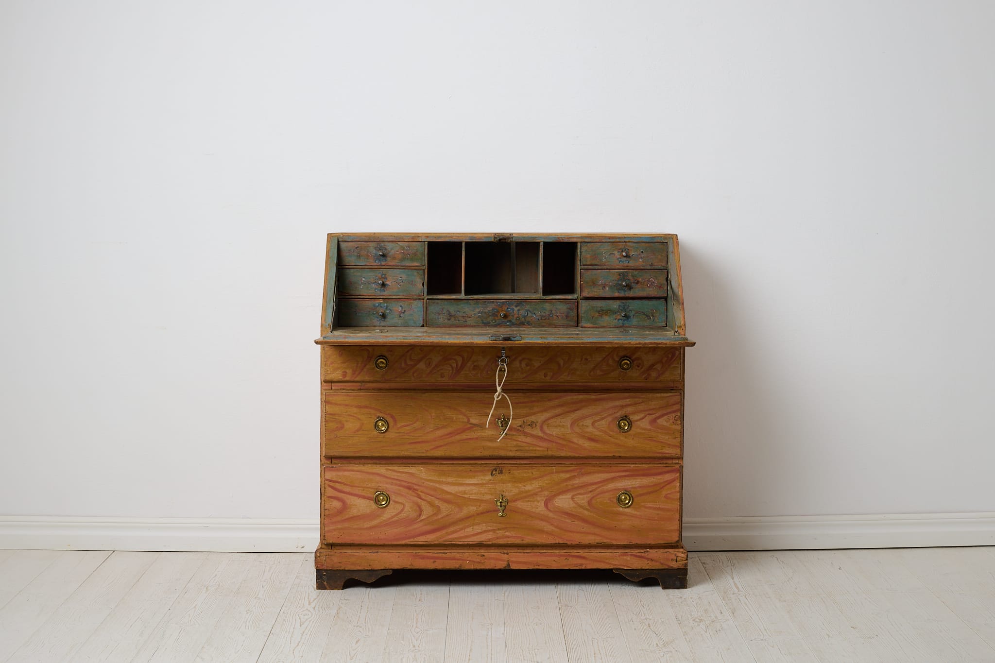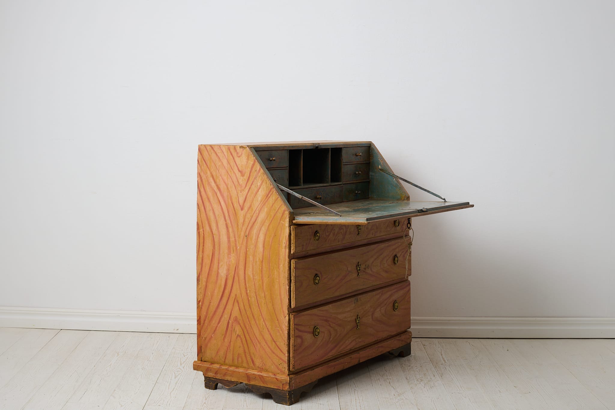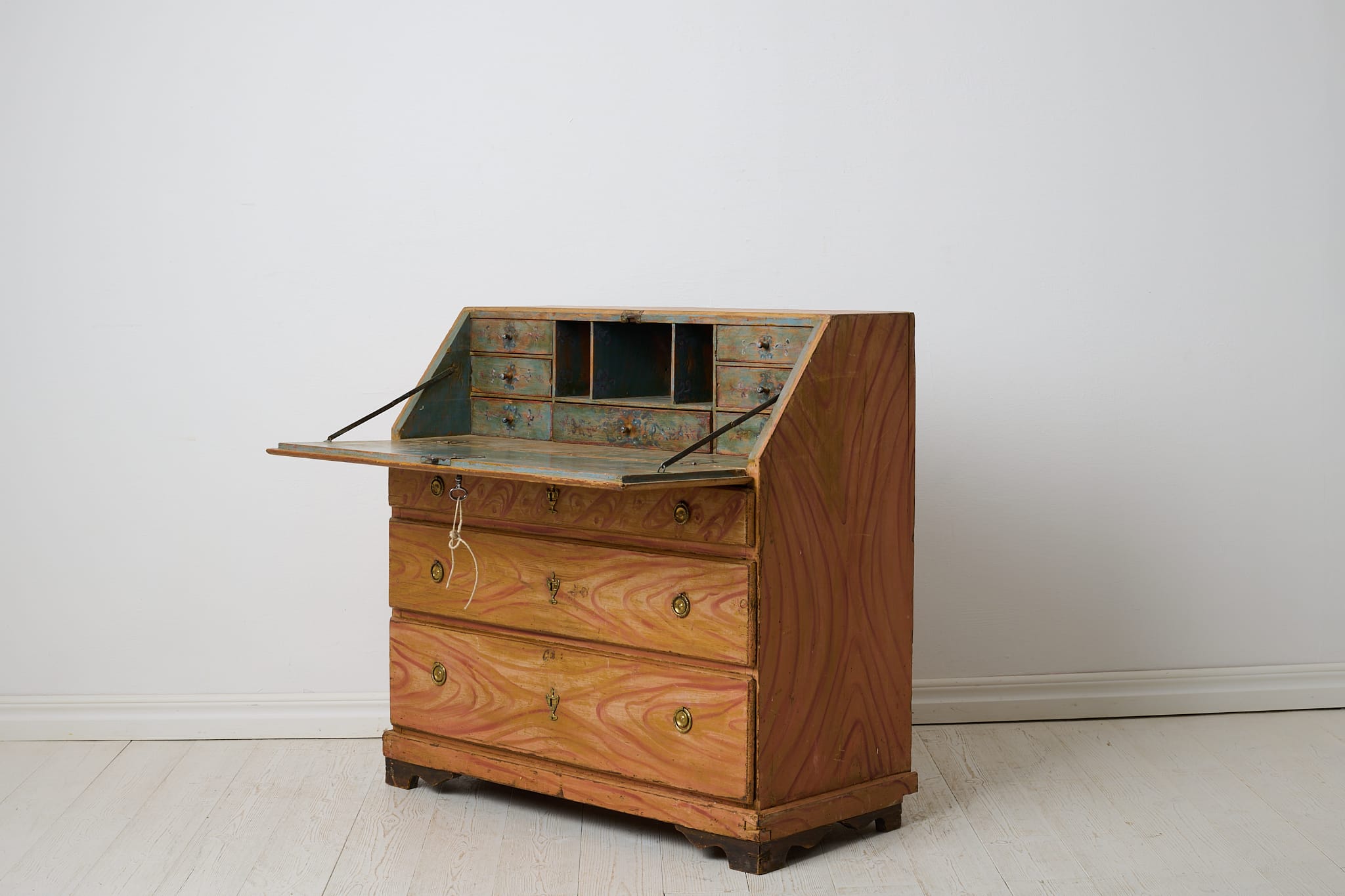 Genuine folk art secretary desk from the early 1800s. Made by hand in solid pine with the original first layer of paint from the 1820s. Interior with small drawers and traces of the original, charming decorative paint. Original hardware and drawer pulls in solid brass. Working lock and key to the secretary desk. The paint shows the history of the furniture with traces of distress and patina after use. Typical stains in the small drawers after spilled ink. Height to the secretary desk when open is 69 cm. Depth is 43 and 22 cm deep respectively.