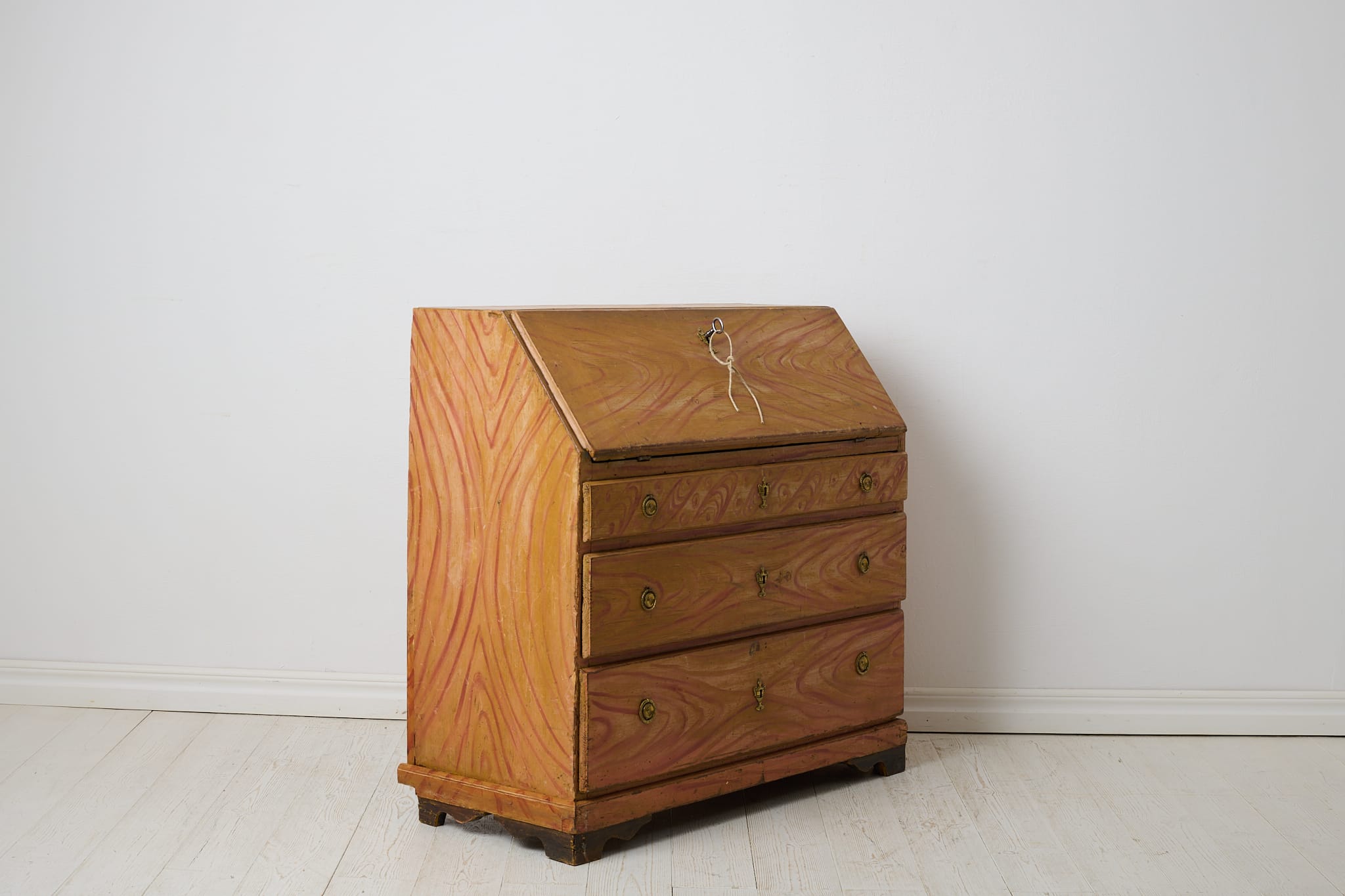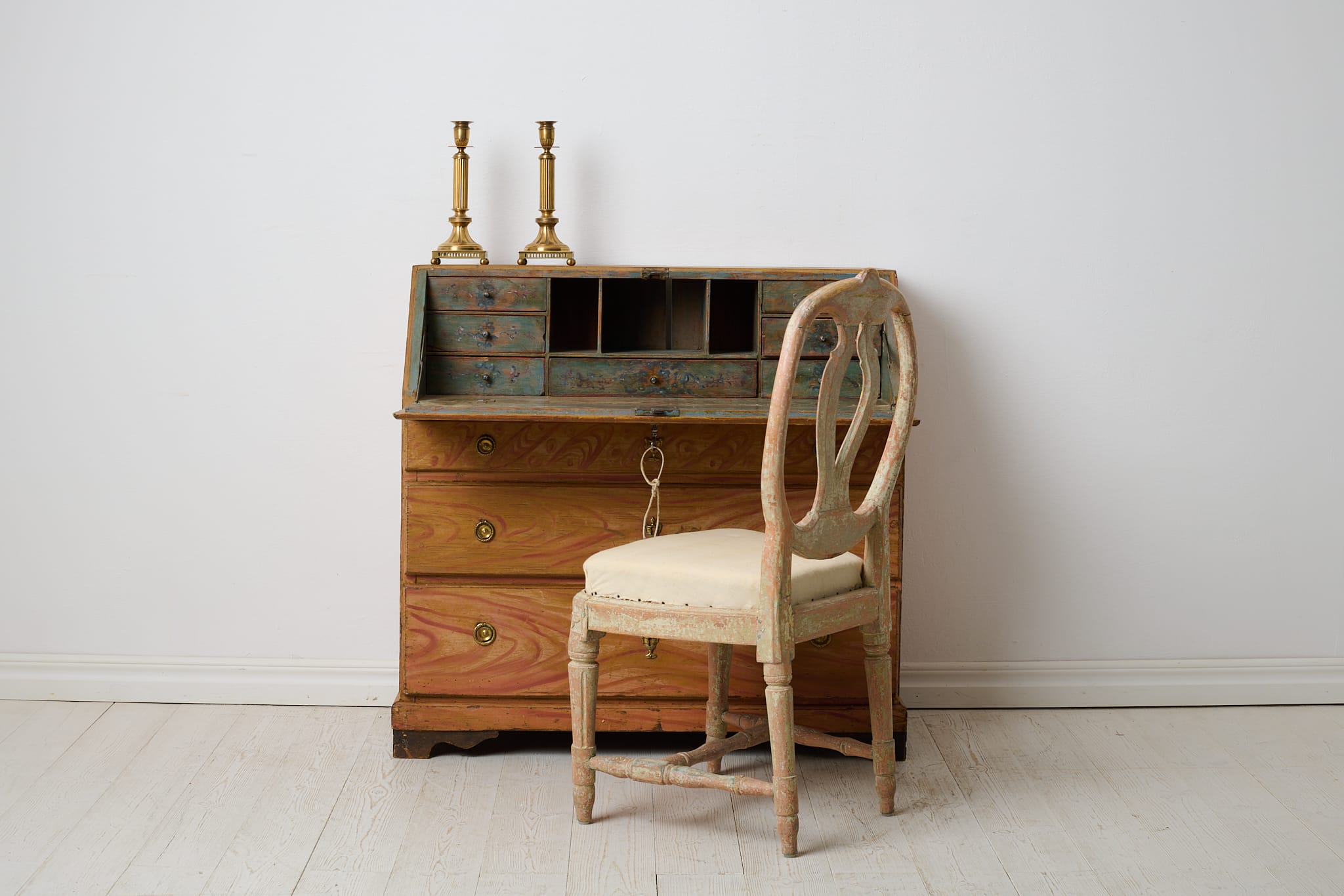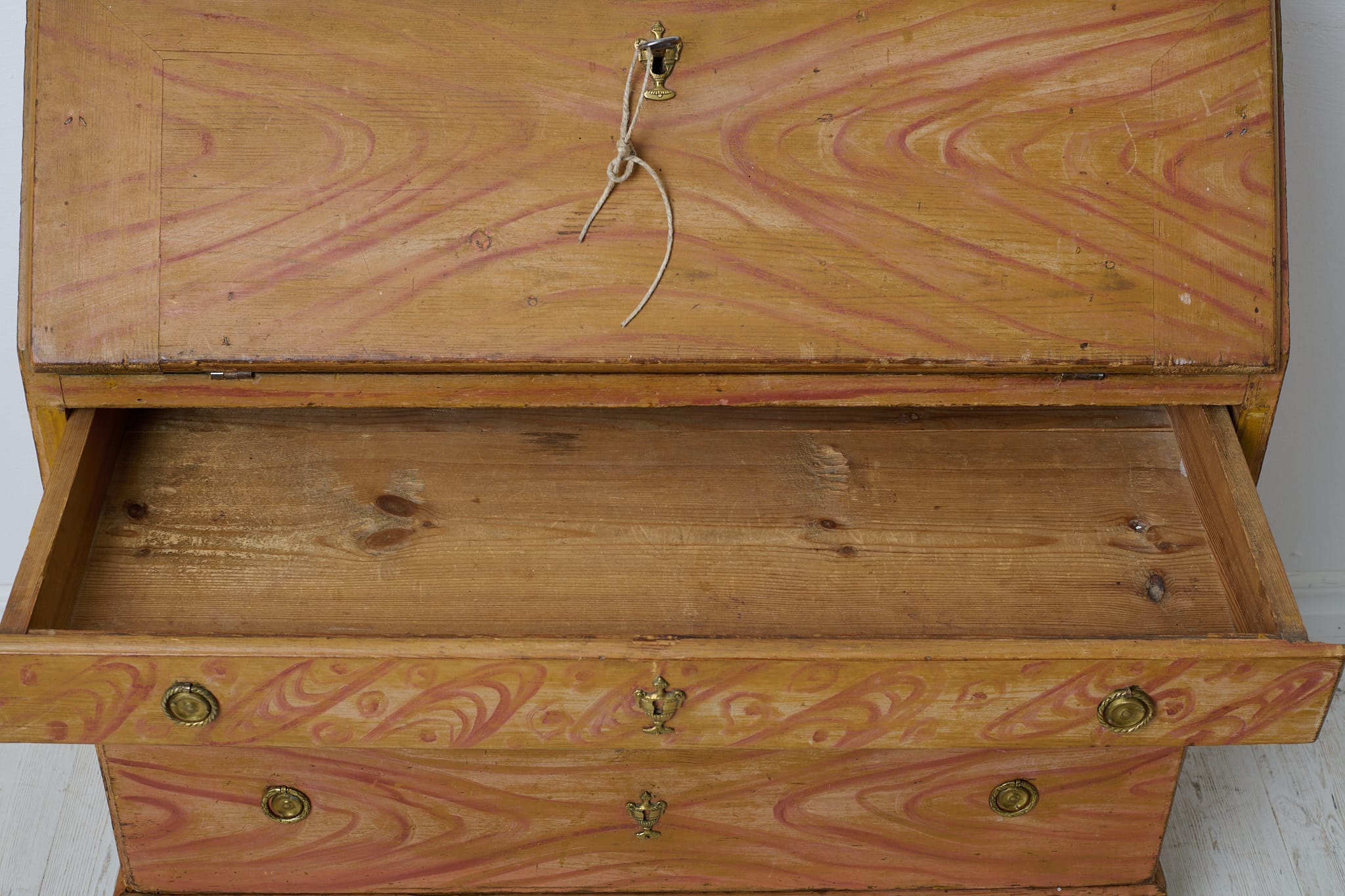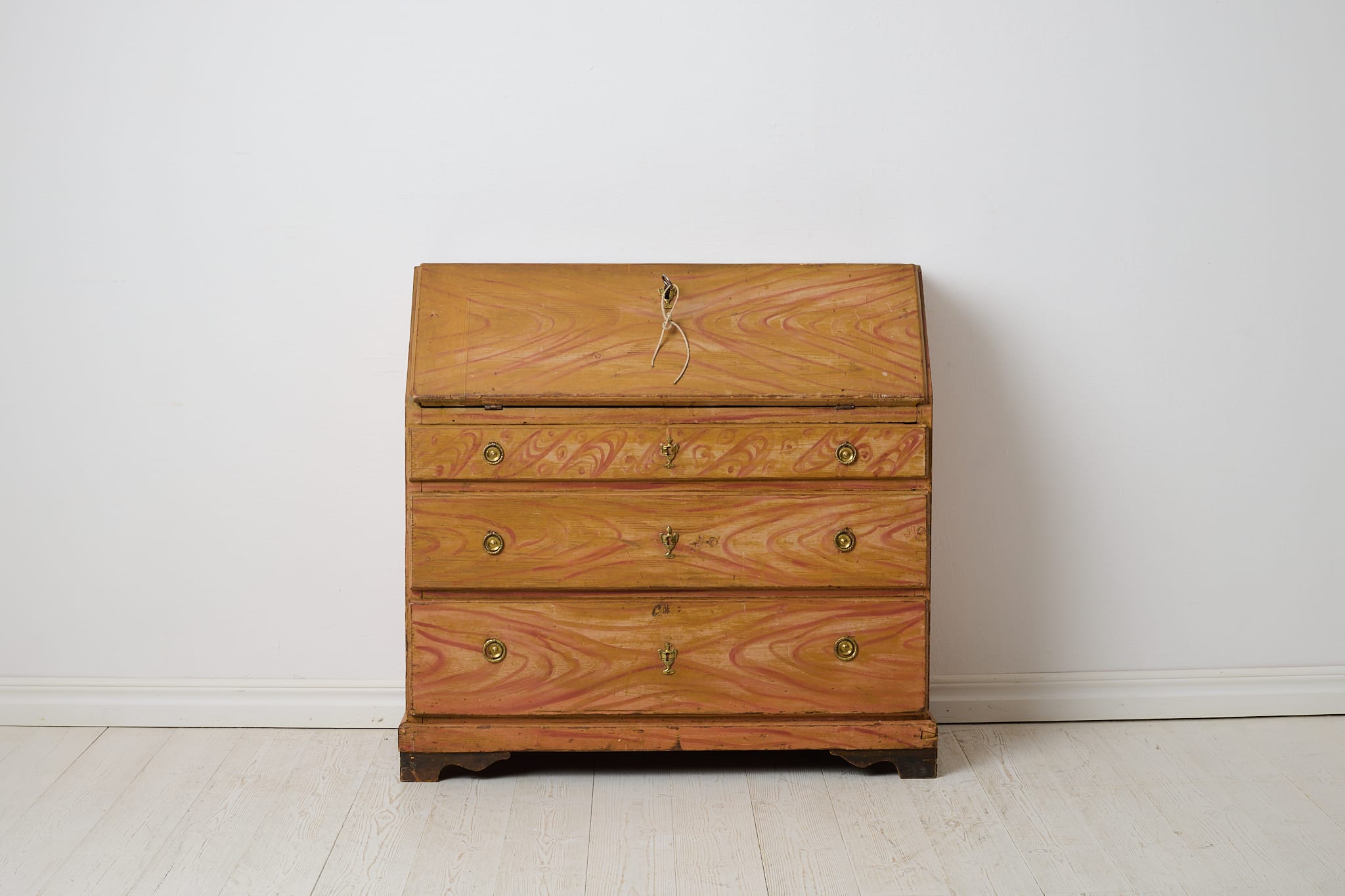 Genuine folk art secretary desk from the early 1800s. Made by hand in solid pine with the original first layer of paint from the 1820s. Interior with small drawers and traces of the original, charming decorative paint. Original hardware and drawer pulls in solid brass. Working lock and key to the secretary desk. The paint shows the history of the furniture with traces of distress and patina after use. Typical stains in the small drawers after spilled ink. Height to the secretary desk when open is 69 cm. Depth is 43 and 22 cm deep respectively.