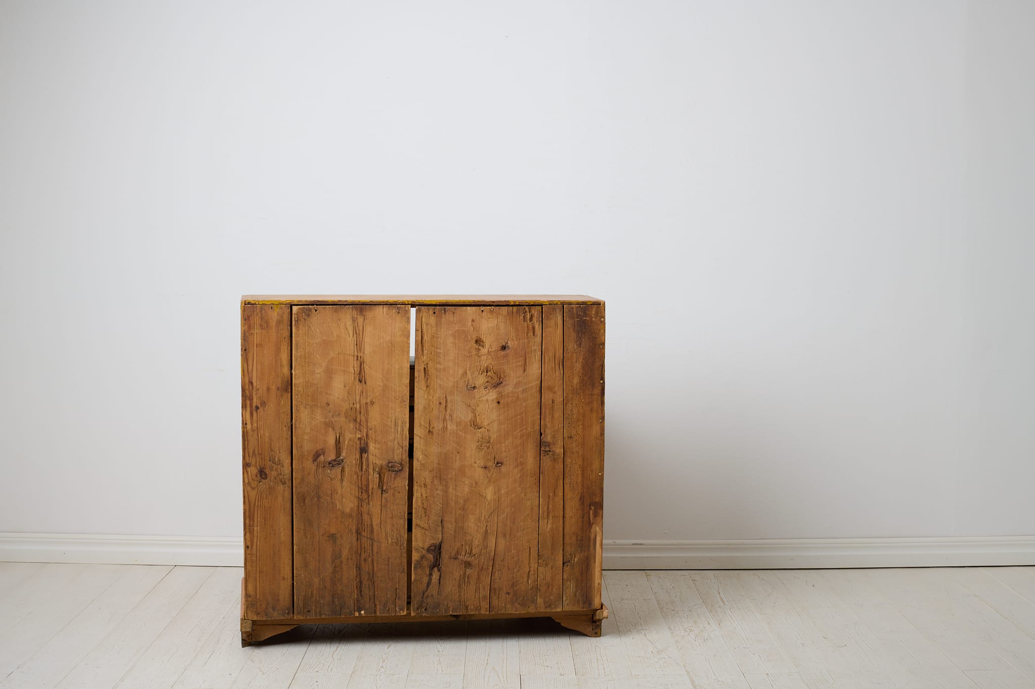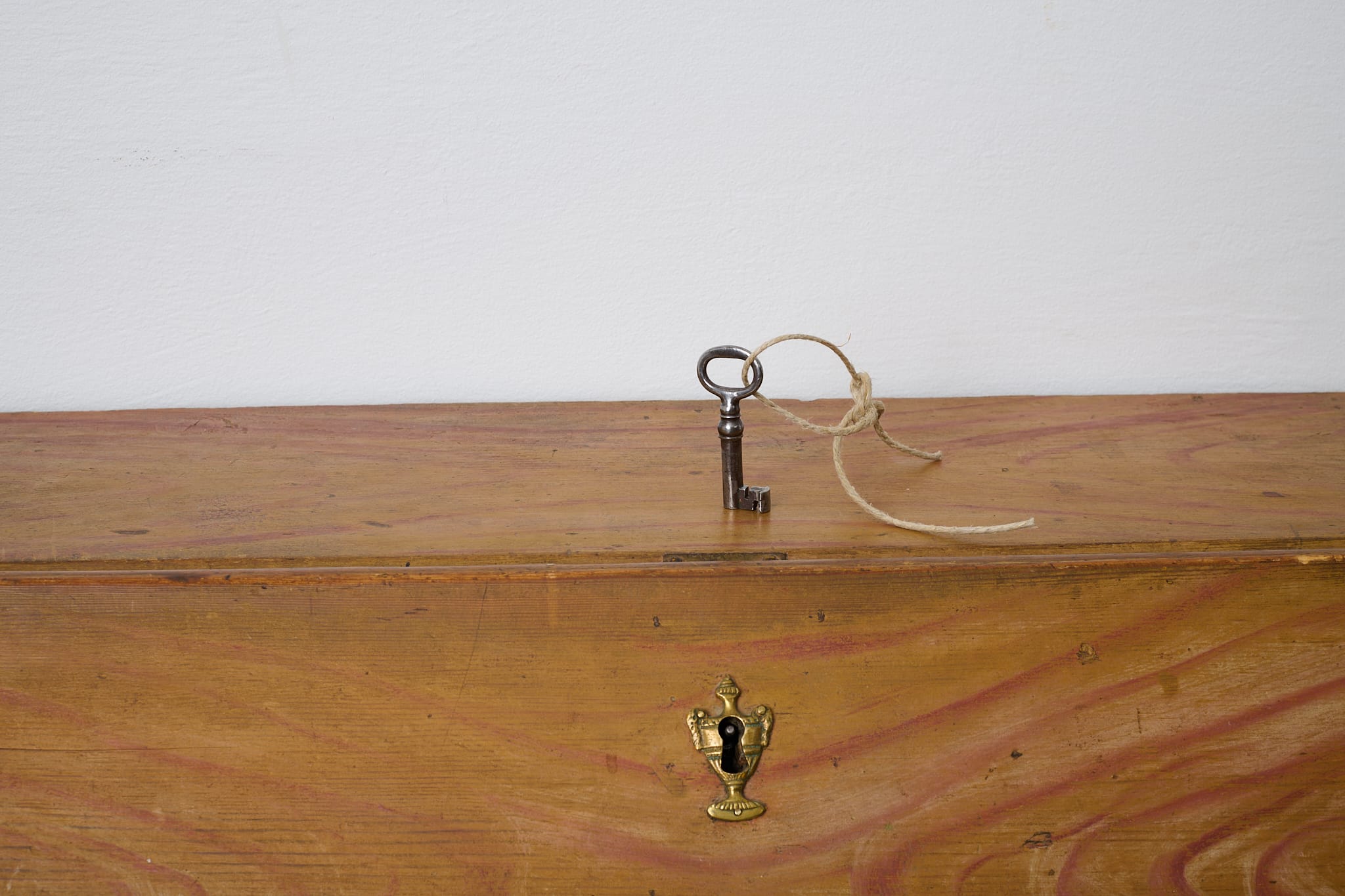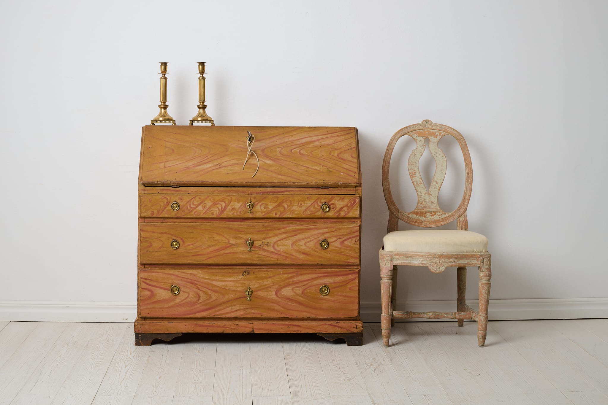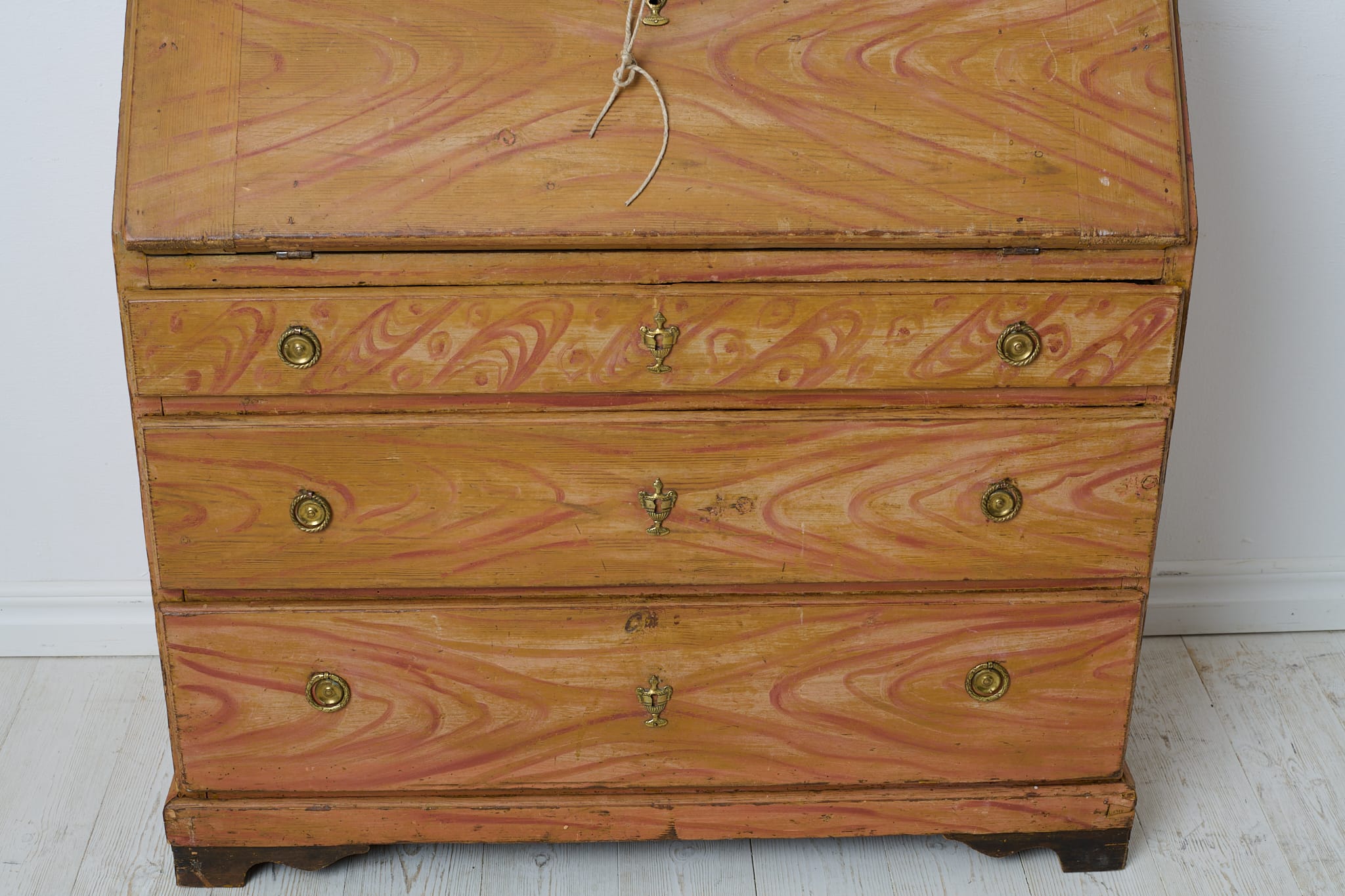 Genuine folk art secretary desk from the early 1800s. Made by hand in solid pine with the original first layer of paint from the 1820s. Interior with small drawers and traces of the original, charming decorative paint. Original hardware and drawer pulls in solid brass. Working lock and key to the secretary desk. The paint shows the history of the furniture with traces of distress and patina after use. Typical stains in the small drawers after spilled ink. Height to the secretary desk when open is 69 cm. Depth is 43 and 22 cm deep respectively.