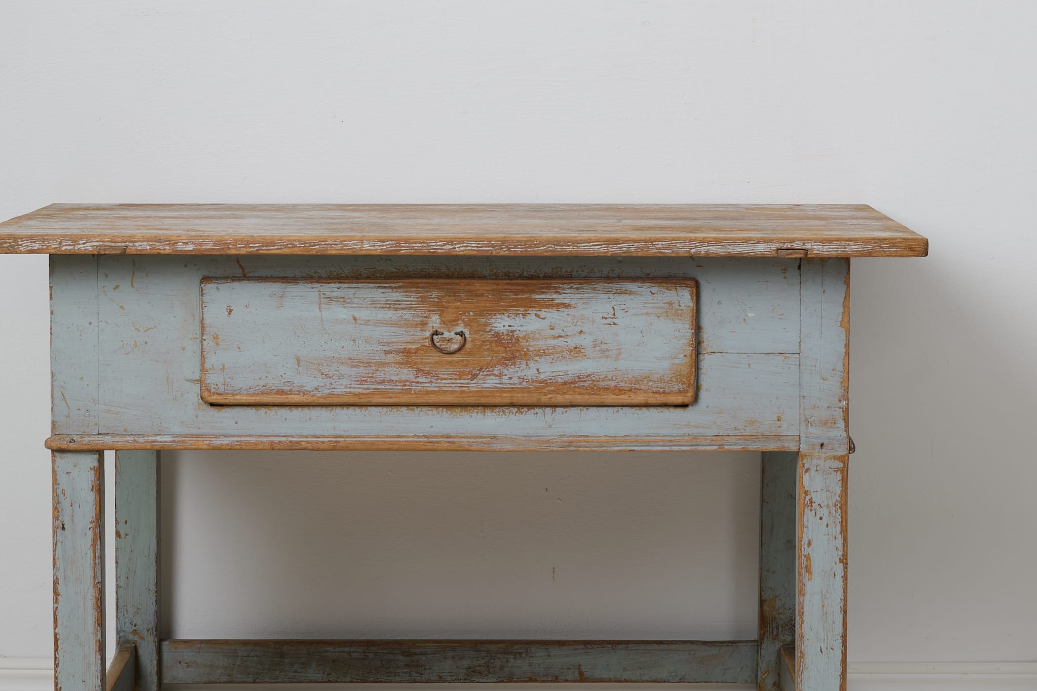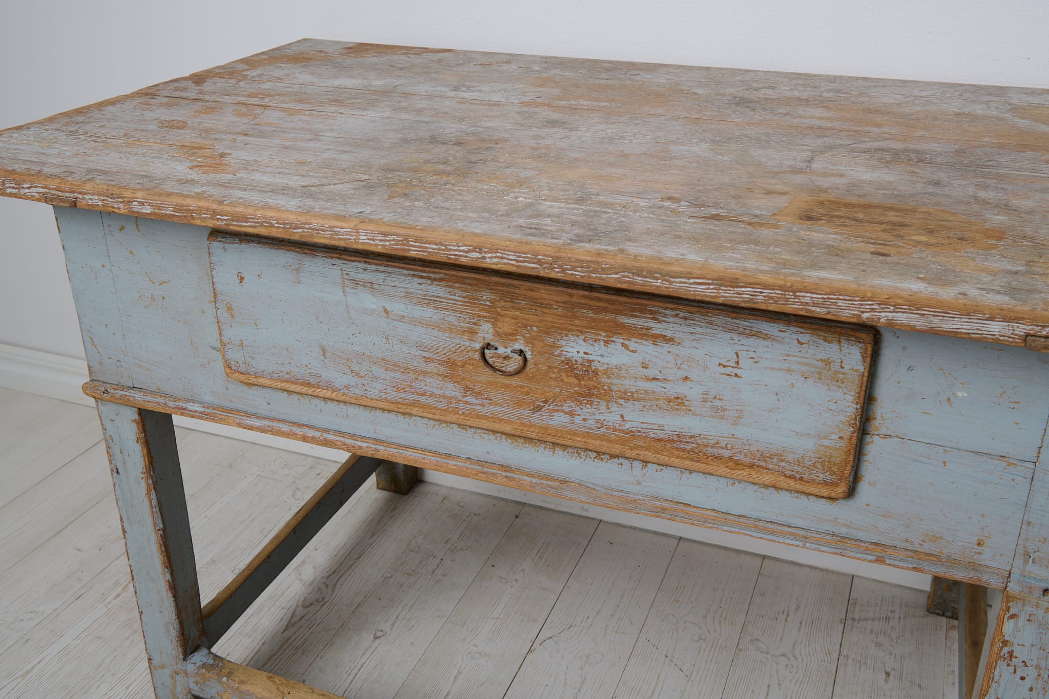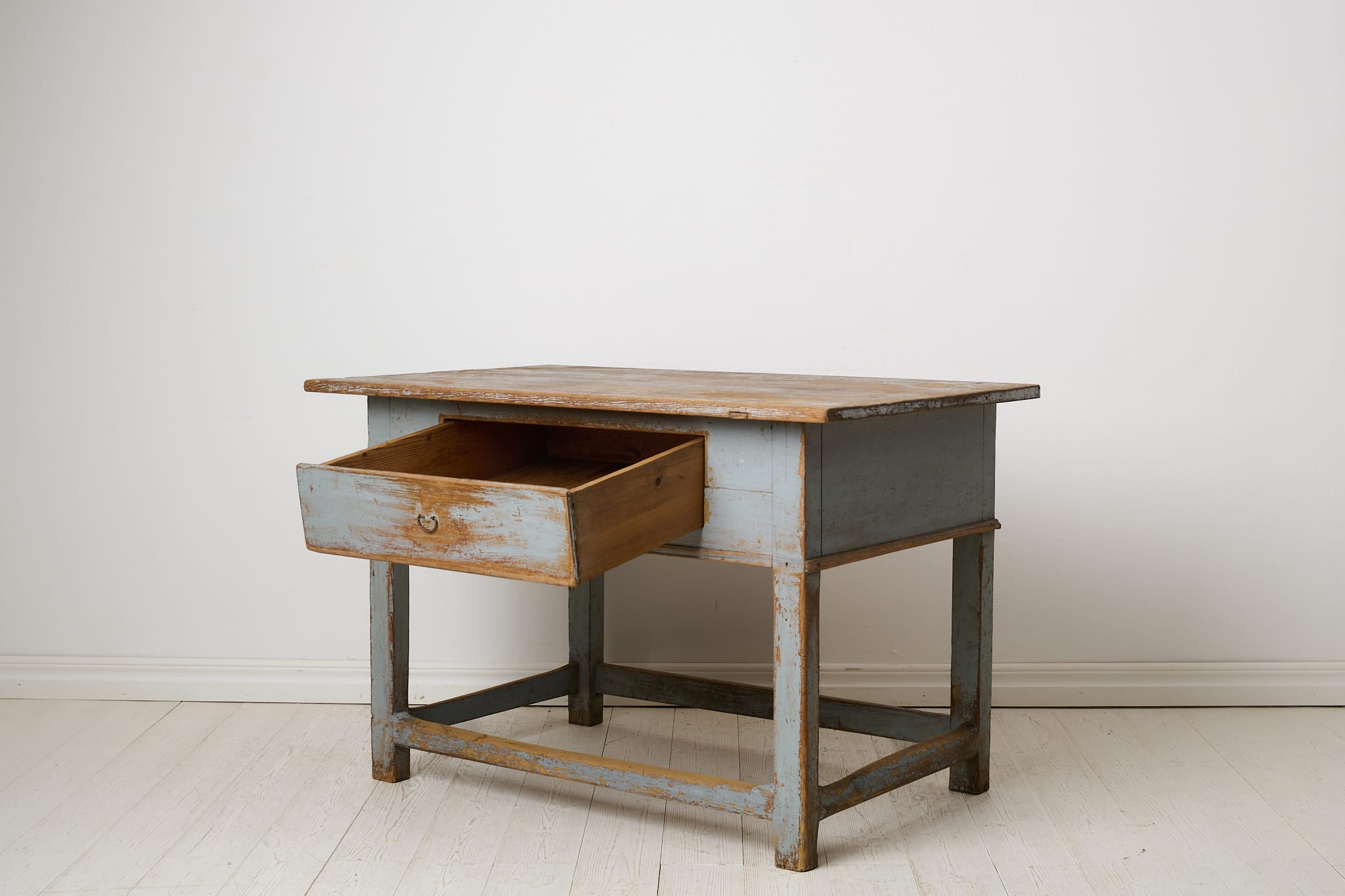 Genuine folk art table in baroque style from northern Sweden. The table is unique and made by hand in solid pine around 1840. Natural untouched condition with the first blue paint that shows its history and almost 200 years of use through distress and patina. One large and fully functional drawer with the original drawer pull in iron. Healthy and stable frame.