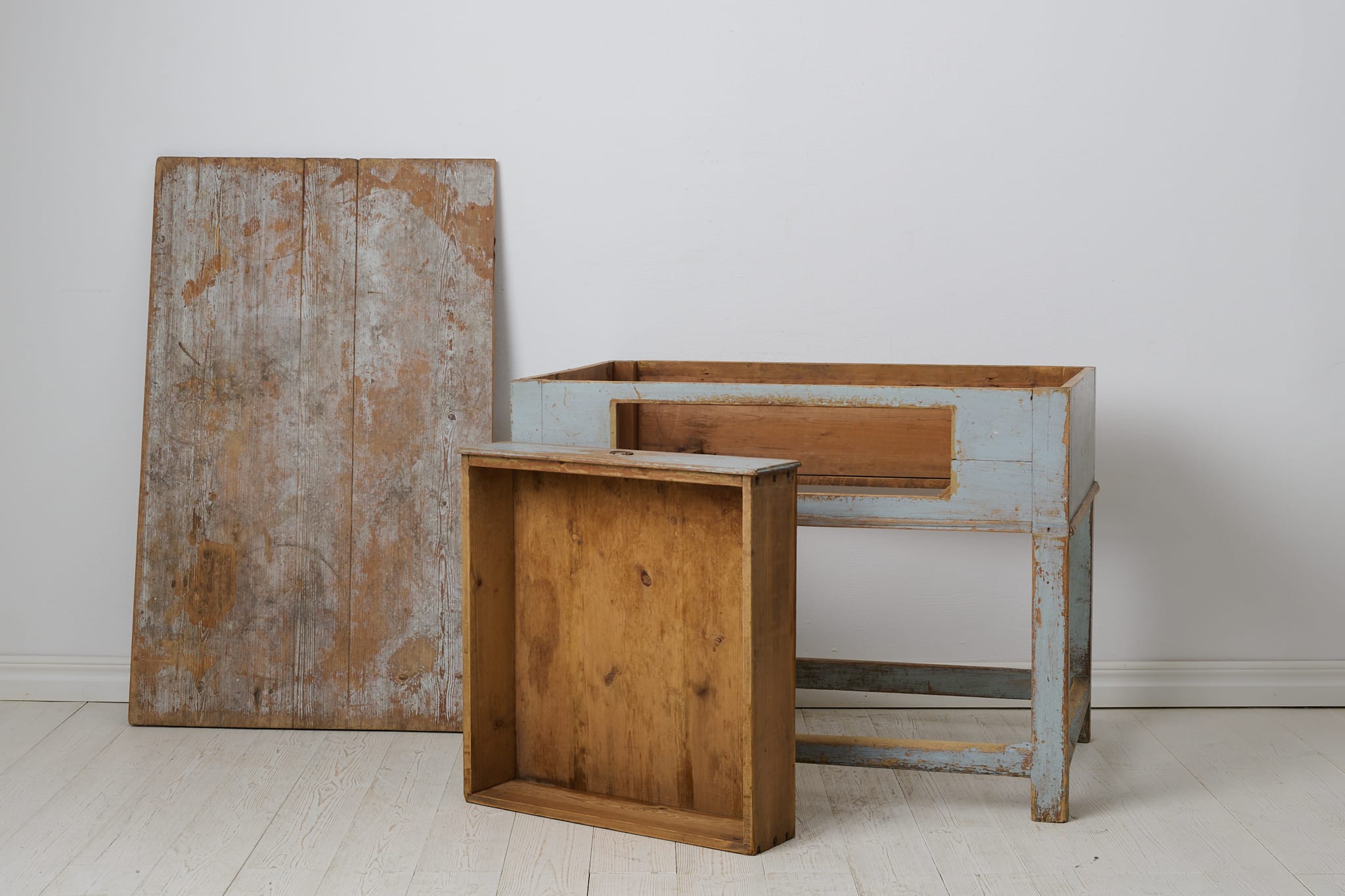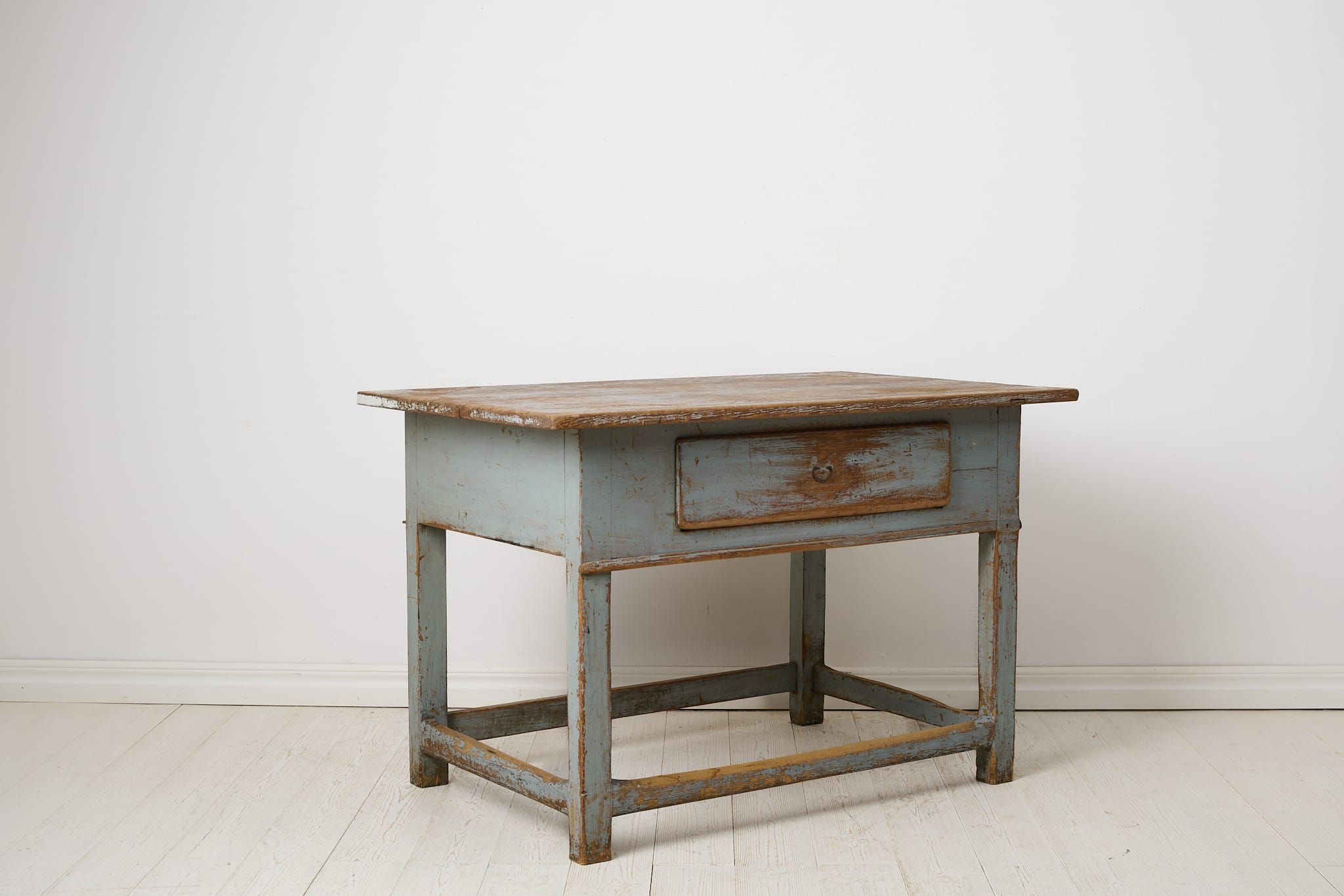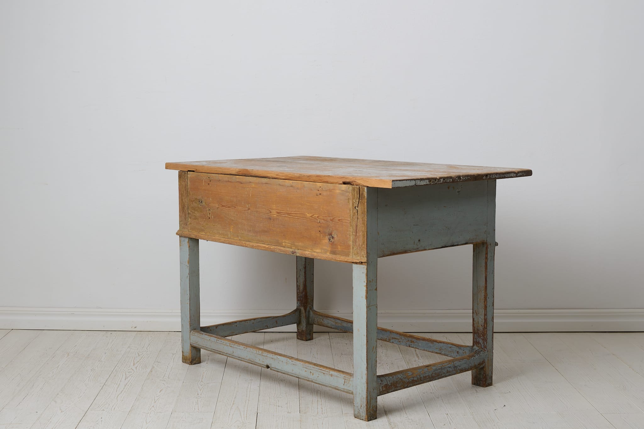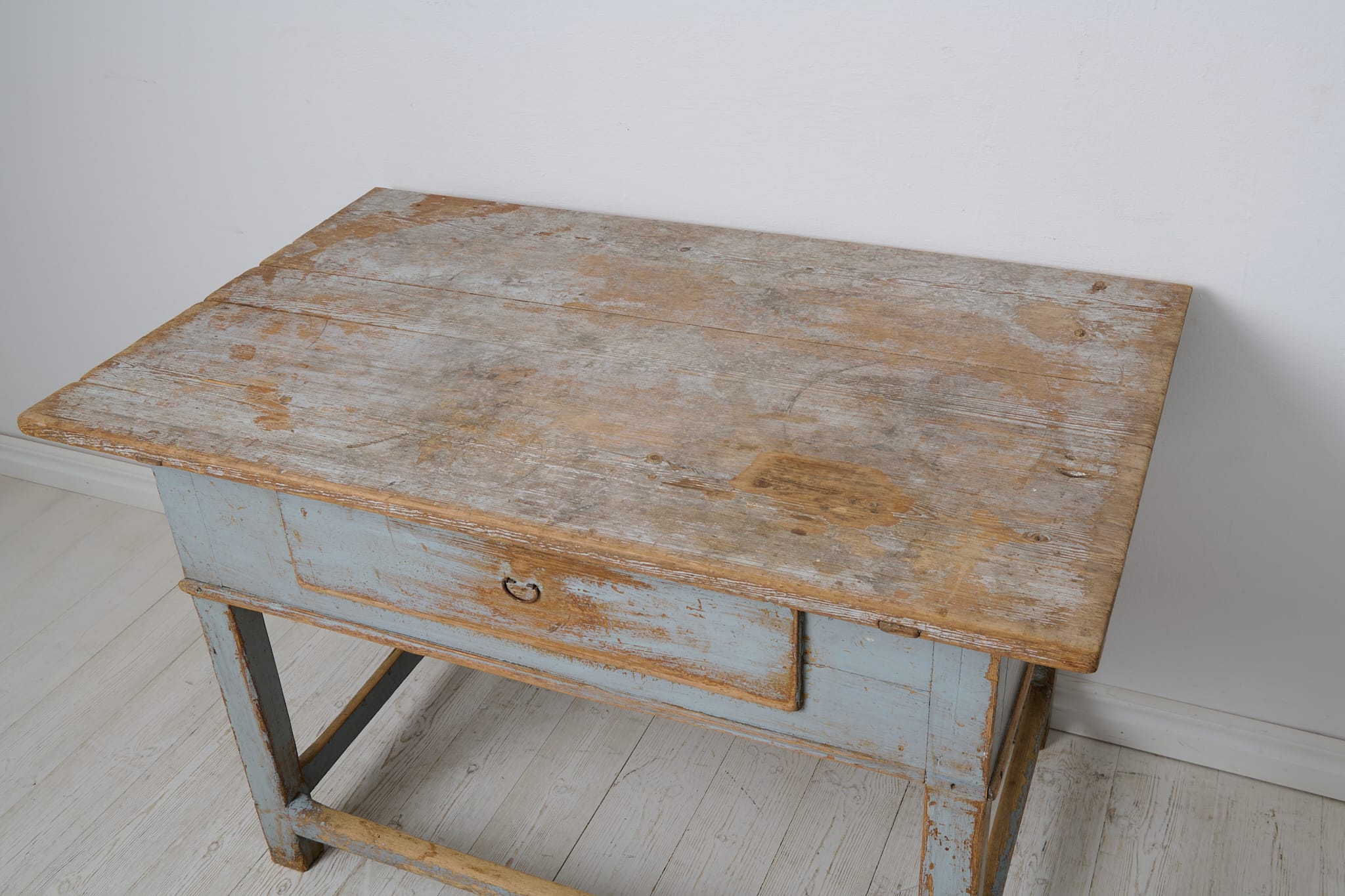 Genuine folk art table in baroque style from northern Sweden. The table is unique and made by hand in solid pine around 1840. Natural untouched condition with the first blue paint that shows its history and almost 200 years of use through distress and patina. One large and fully functional drawer with the original drawer pull in iron. Healthy and stable frame.
