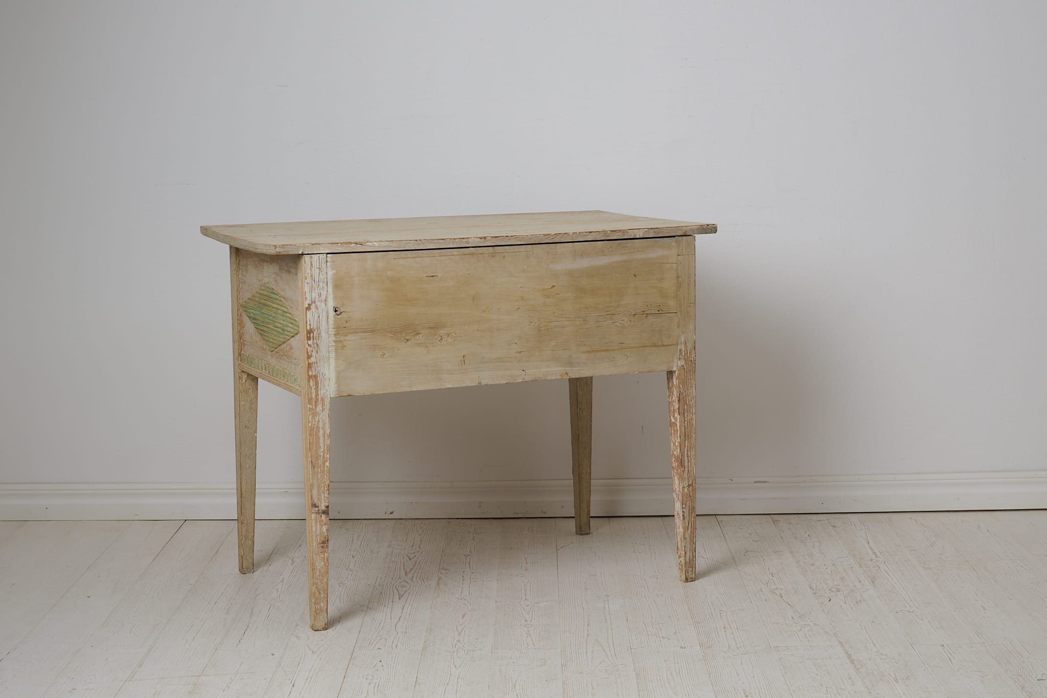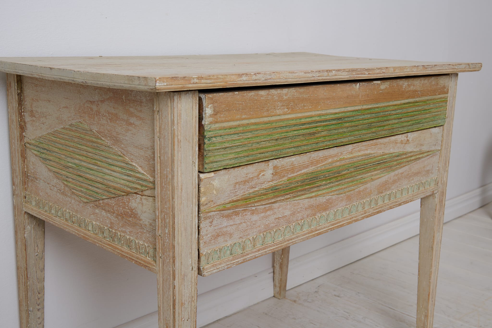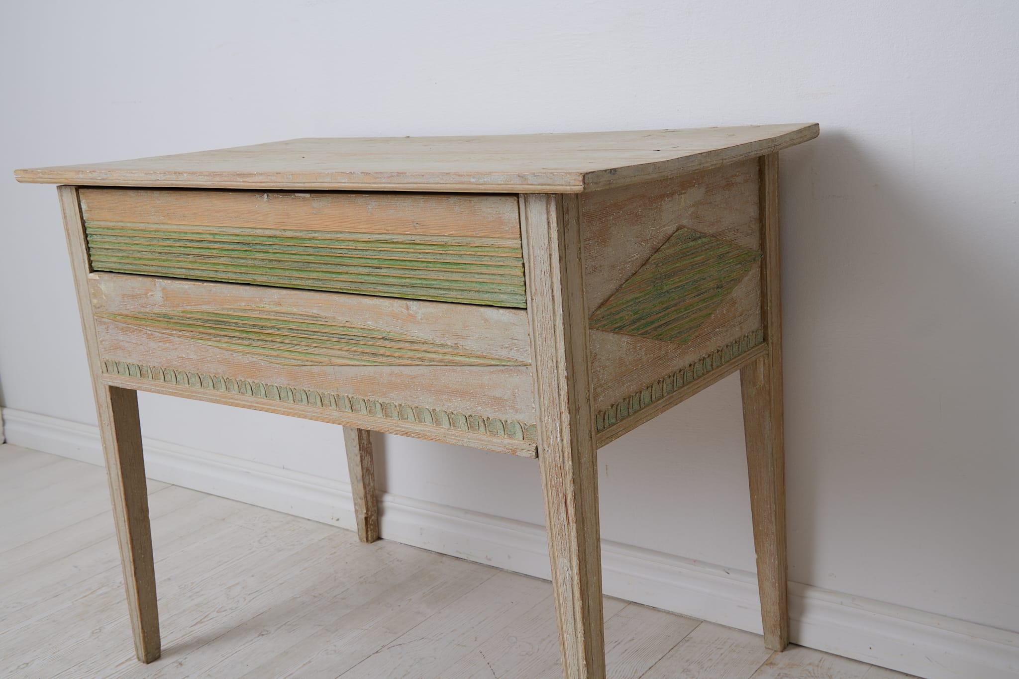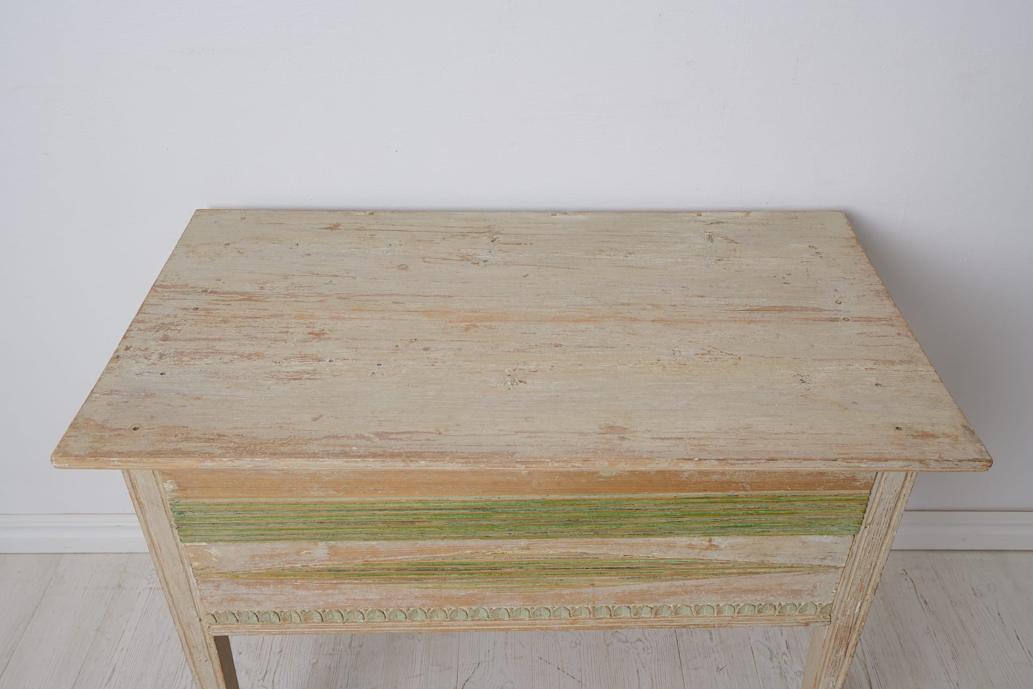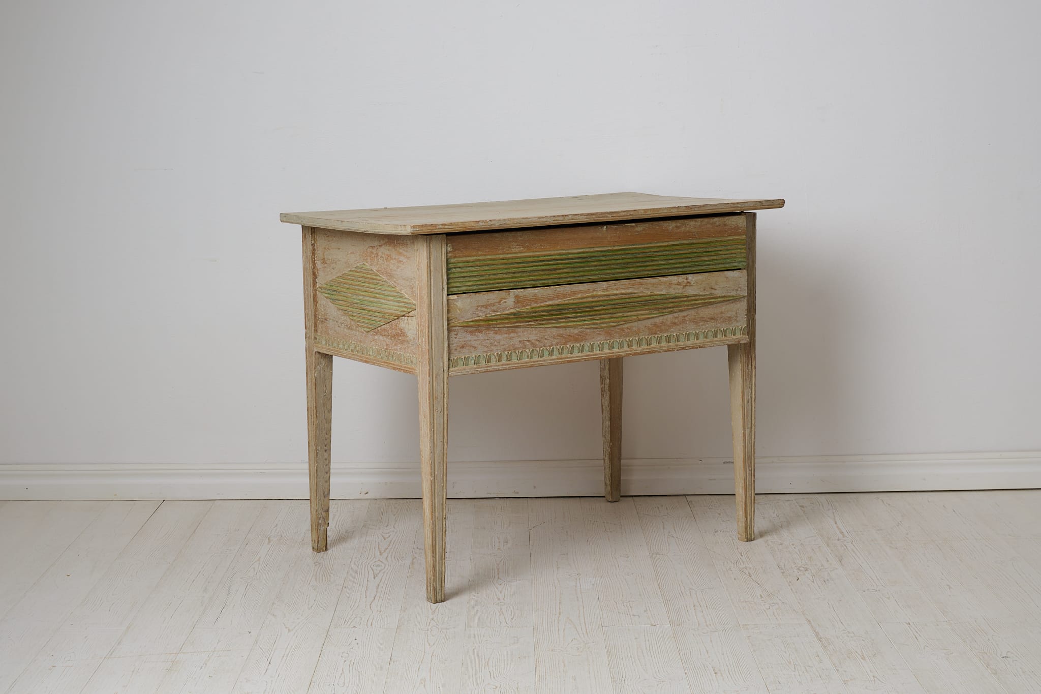 Genuine Swedish country table from the gustavian period made around 1810 in northern Sweden. The table is made by hand with a unique construction in solid pine with carved decor on three sides. Hidden drawers in the apron. Original paint which shows the age and history of the table with authentic distress and patina. Healthy and stable frame. Height to the apron is 48 cm.