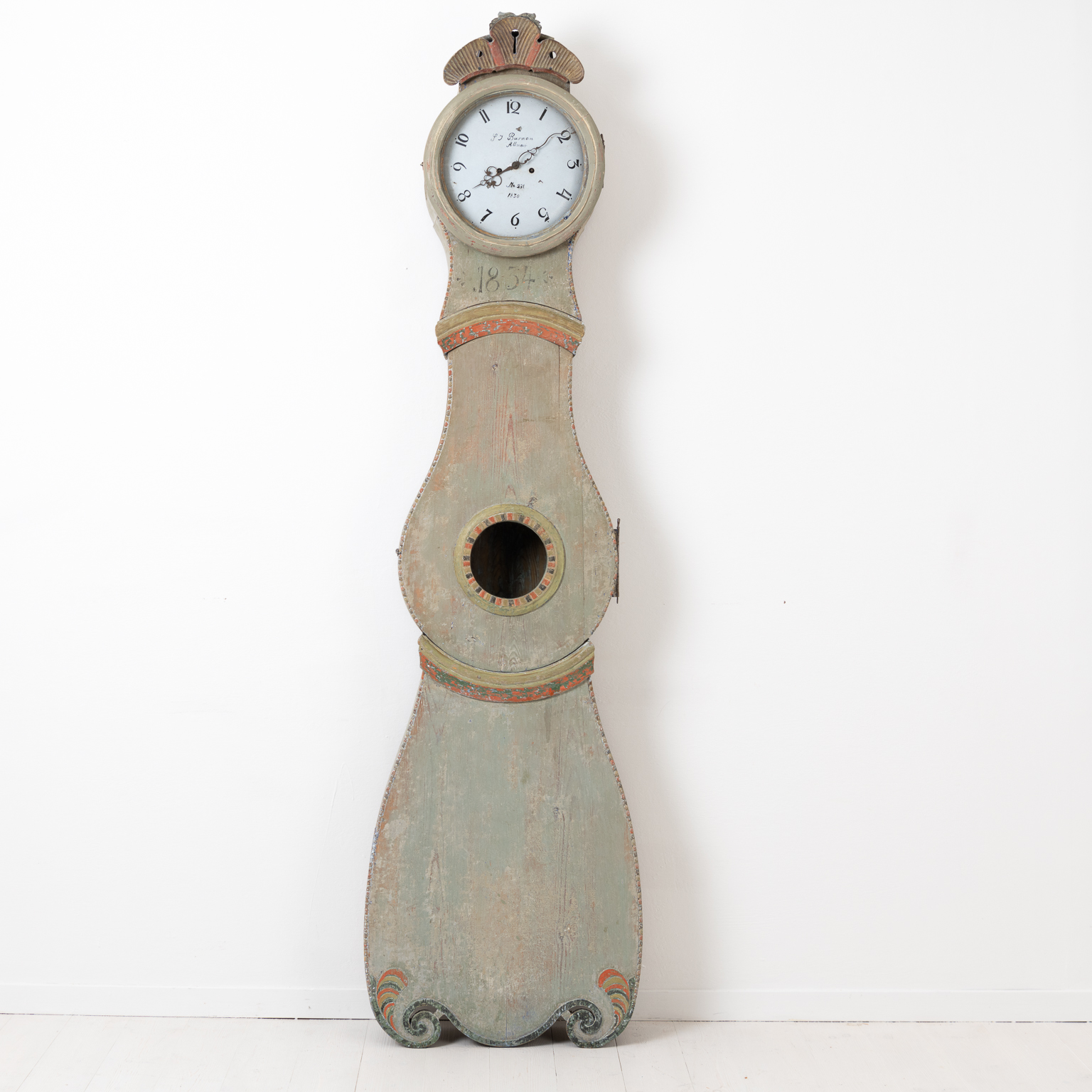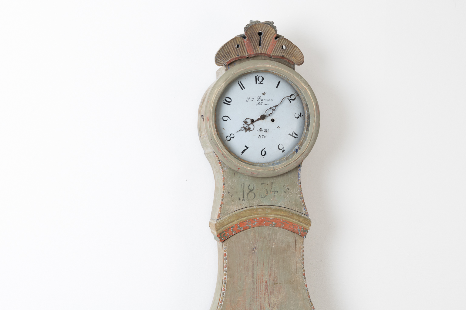 Green long case clock in the classical rococo shape. Scraped to the original first layer of paint of which the colour is a pale green. Made in northern Sweden and dated 1834 with a green toned clock face. The clock has a hand carved wooden shell at the top of the head. Healthy and solid frame in pine with naturally distressed paint and authentic patina. The key hole at the back of the clock is where the clock was attached with a large hook onto the wall behind during the 1800s. Minor dry cracks – see detail pictures. Hand wrought hinges and hardware in iron. This clock has to stand against a wall.