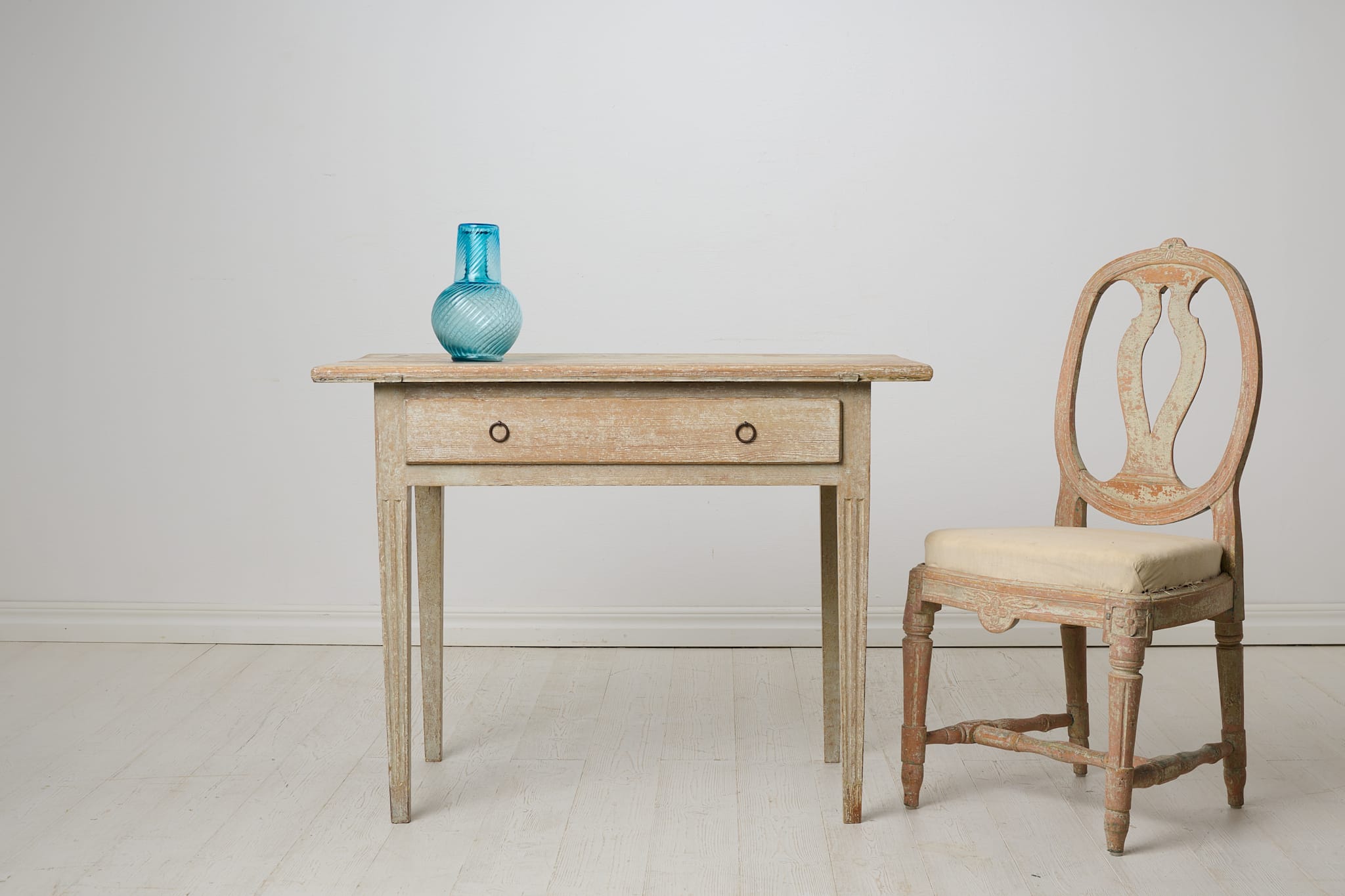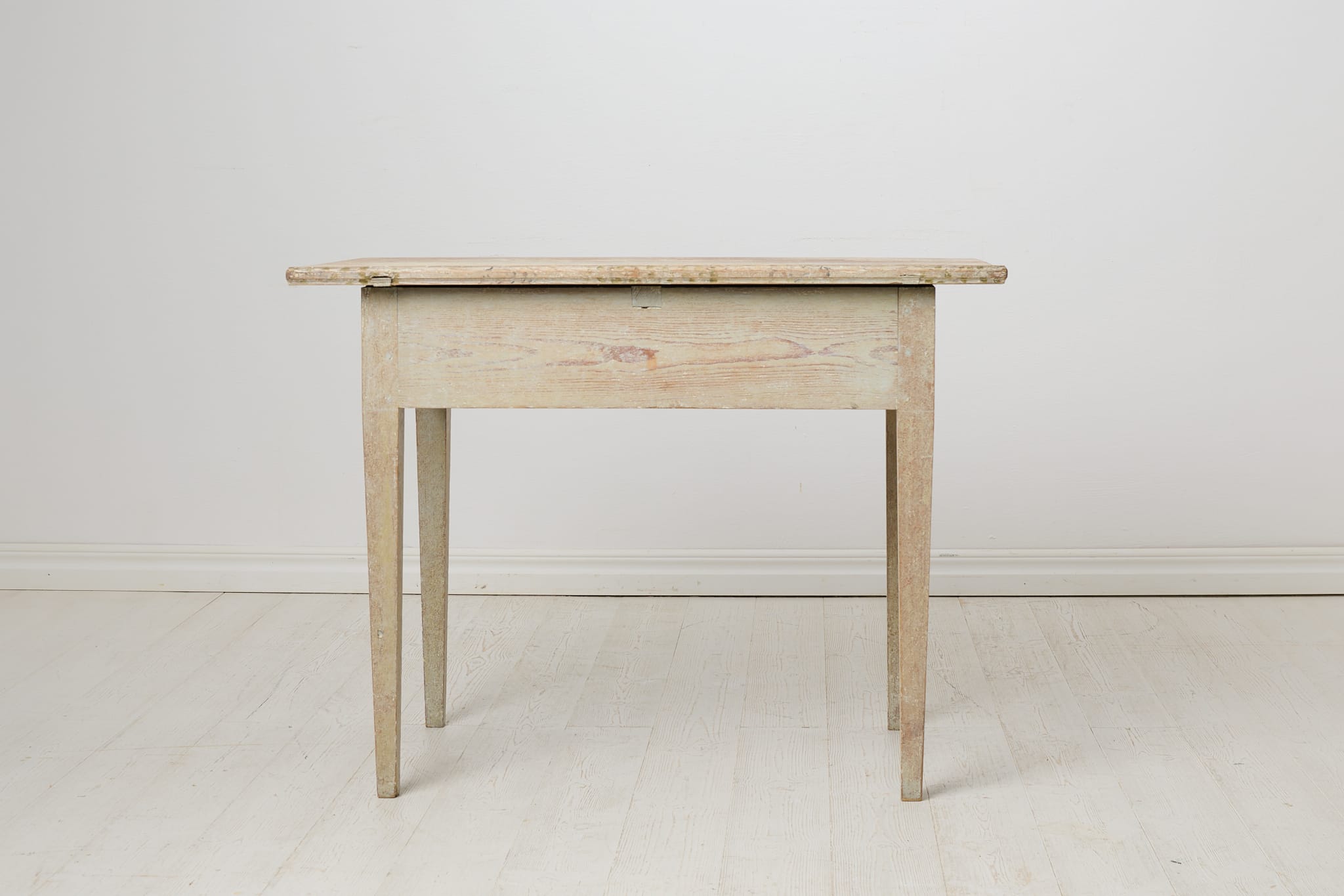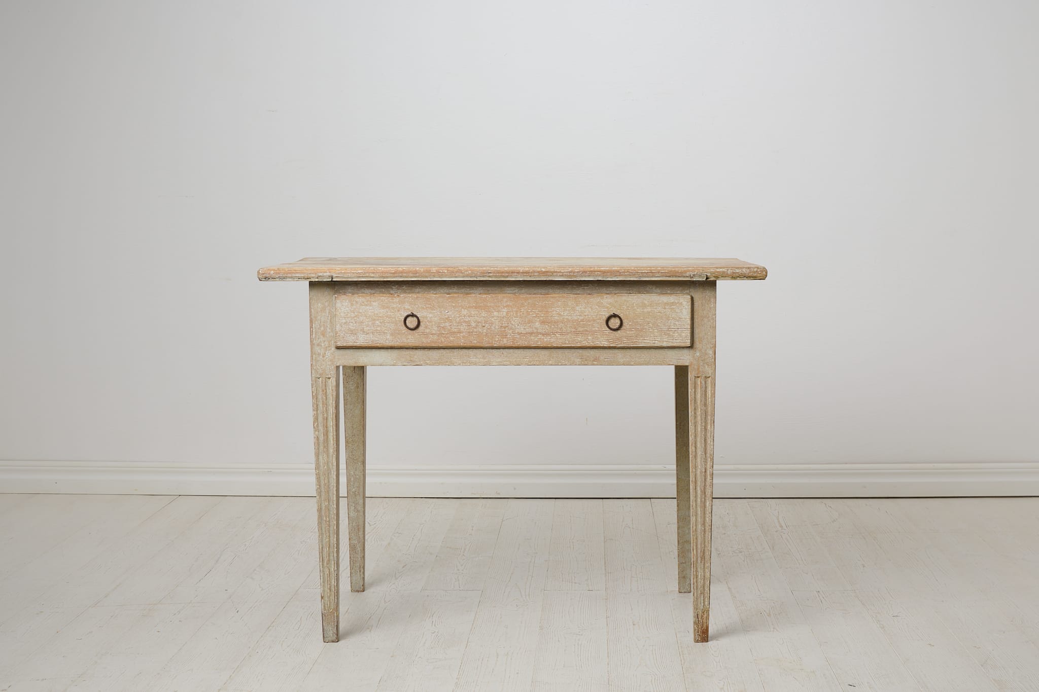 Gustavian antique country table from northern Sweden. The table is made around 1820 in solid pine. Classic straight gustavian shape and straight tapered legs with flutes. One large centre drawer. Original old paint with distress after use. Healthy and stable frame. Height to the apron is 55.5 cm.