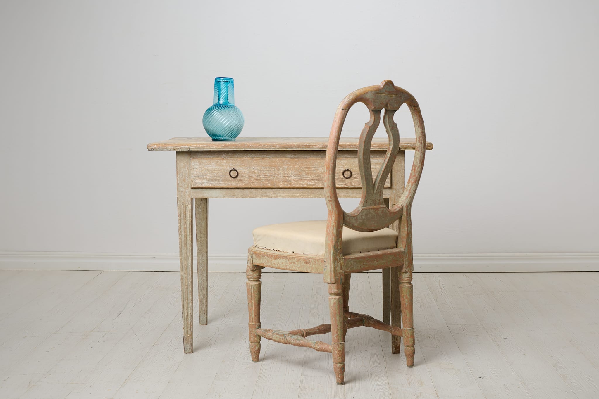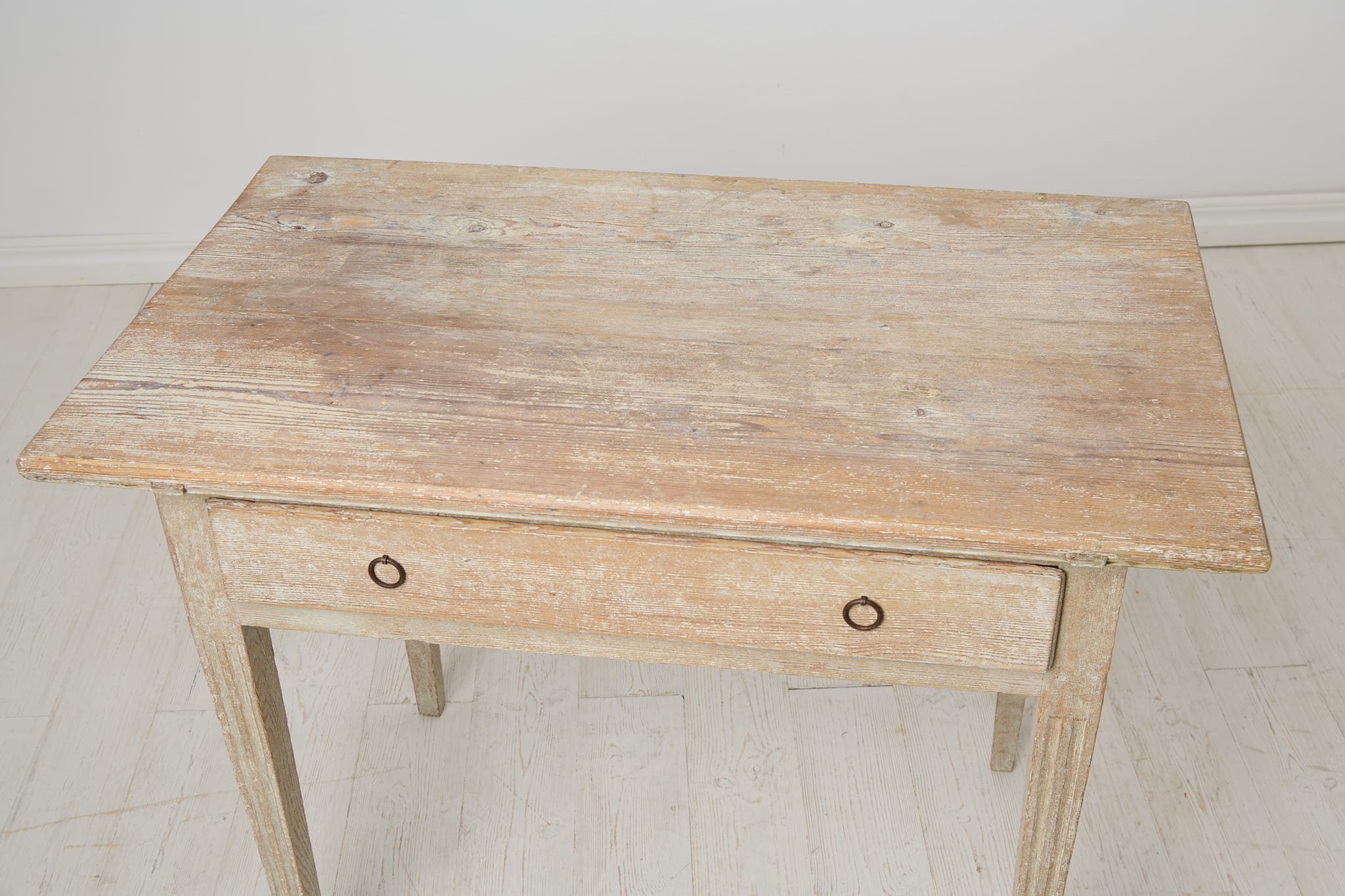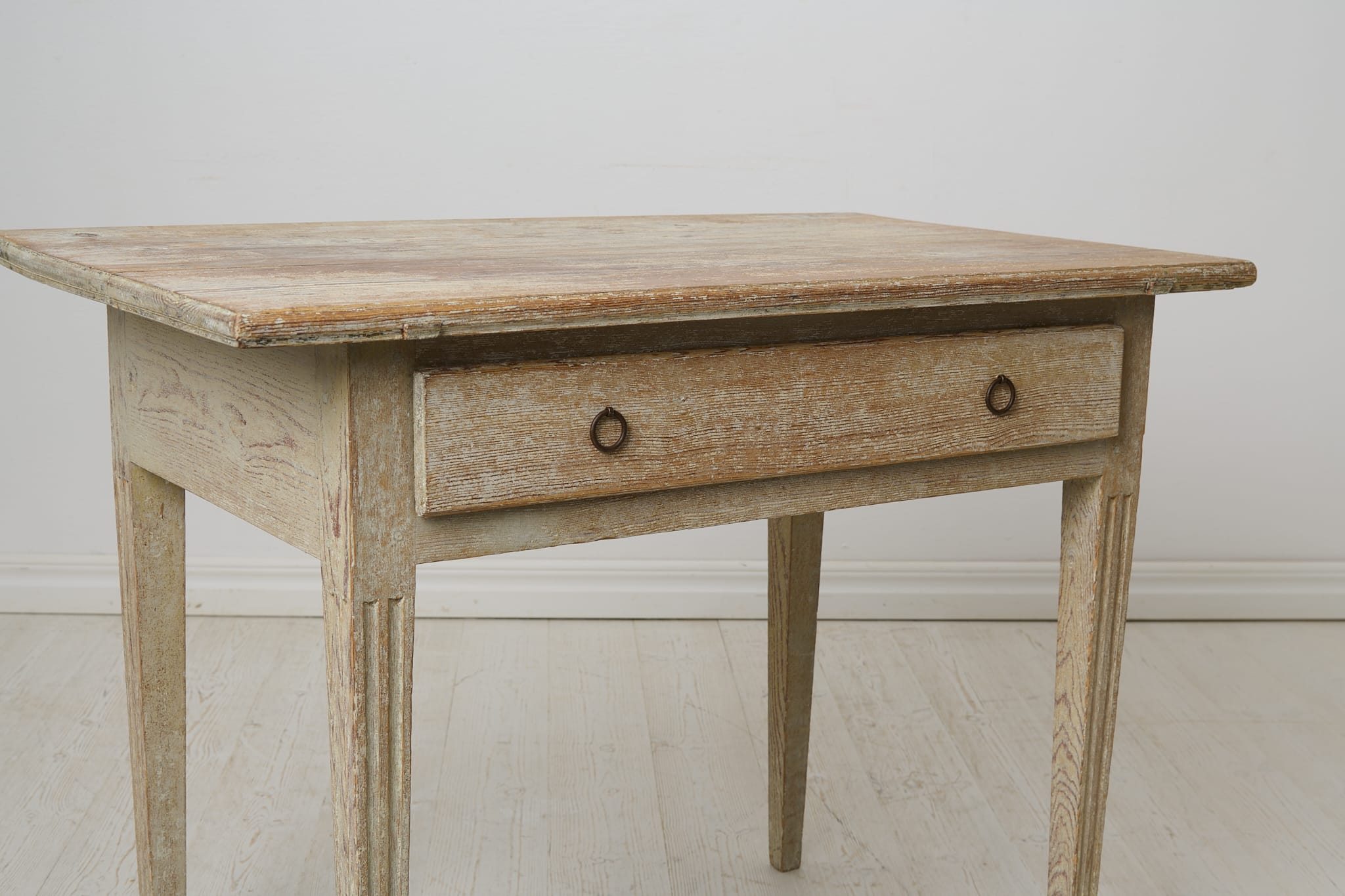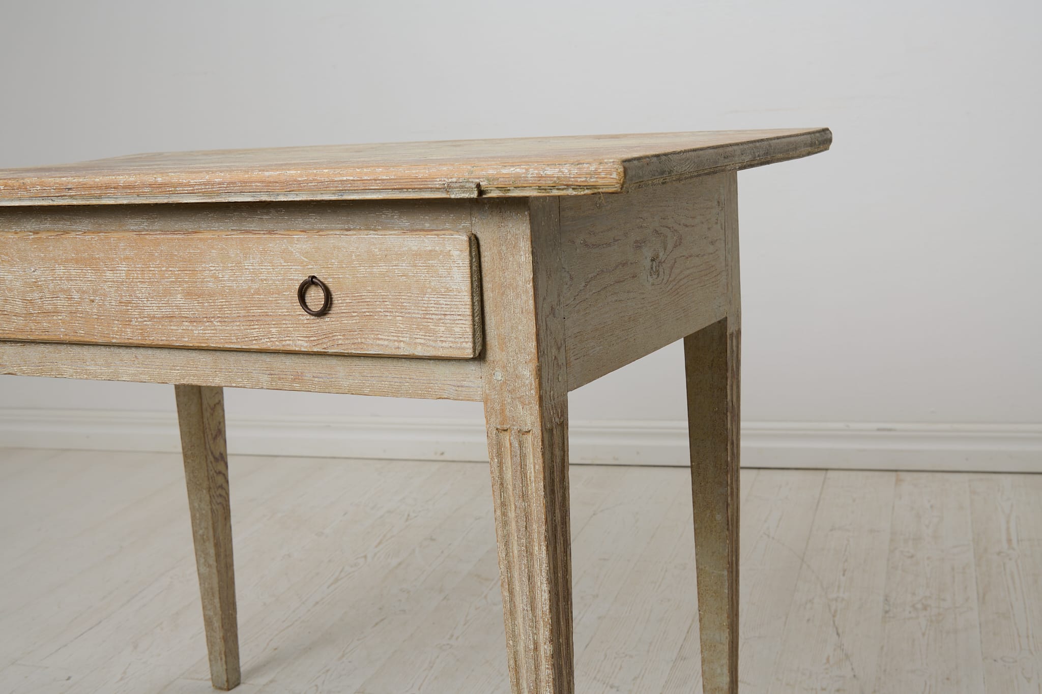 Gustavian antique country table from northern Sweden. The table is made around 1820 in solid pine. Classic straight gustavian shape and straight tapered legs with flutes. One large centre drawer. Original old paint with distress after use. Healthy and stable frame. Height to the apron is 55.5 cm.