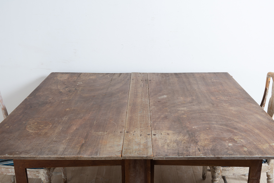 Swedish gustavian drop leaf table. Unusual model, very large with a very narrow middle. Only 14 cm when folded together. Manufactured during the 1790s. Foldable table tops with double gates and hand wrought riveted hinges. In untouched original condition. The folded table tops are 72 cm wide each which makes for a total width 158 cm.