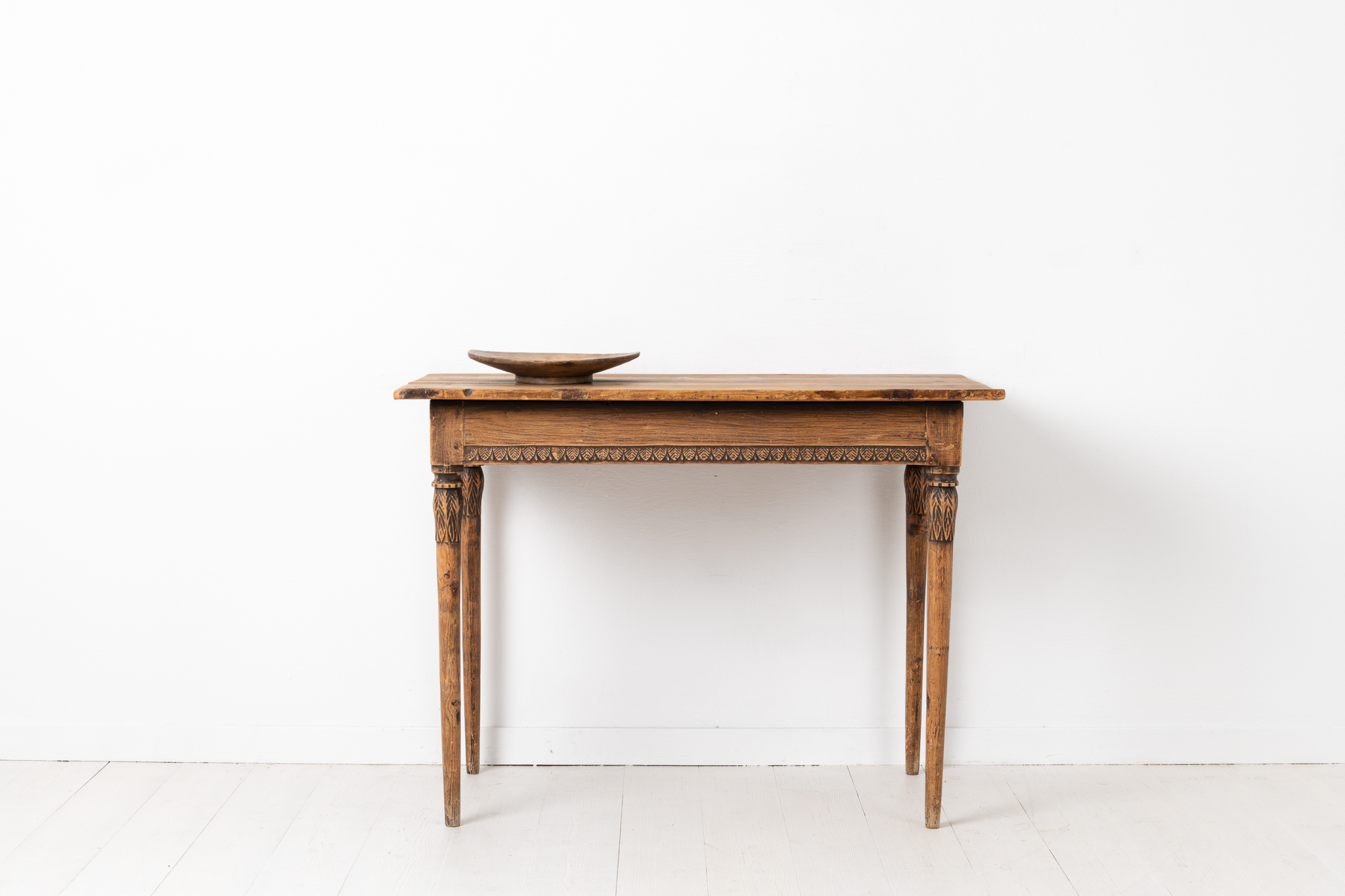 Gustavian side table from the late 18th century made in northern Sweden. The table is from the area Hälsingland and in untouched original condition. Distressed paint with only the traces left of the original painting. The table has an original authentic patina which can only be made by 250 years of time and use. Hand carved wooden decor around the rim and legs in the shape of leafs. The table top has some minor dry cracks. Healthy and solid frame. Height to rim is 62 cm.