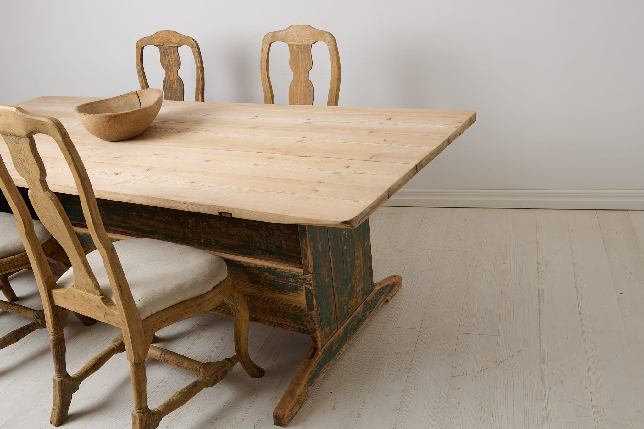 Large antique dining table from northern Sweden. The table is a genuine antique, country house furniture made by hand around 1850 in solid pine. It has a substantial table top in pine that has never been painted which has faded and resulted in authentic patina after 200 years of use.
