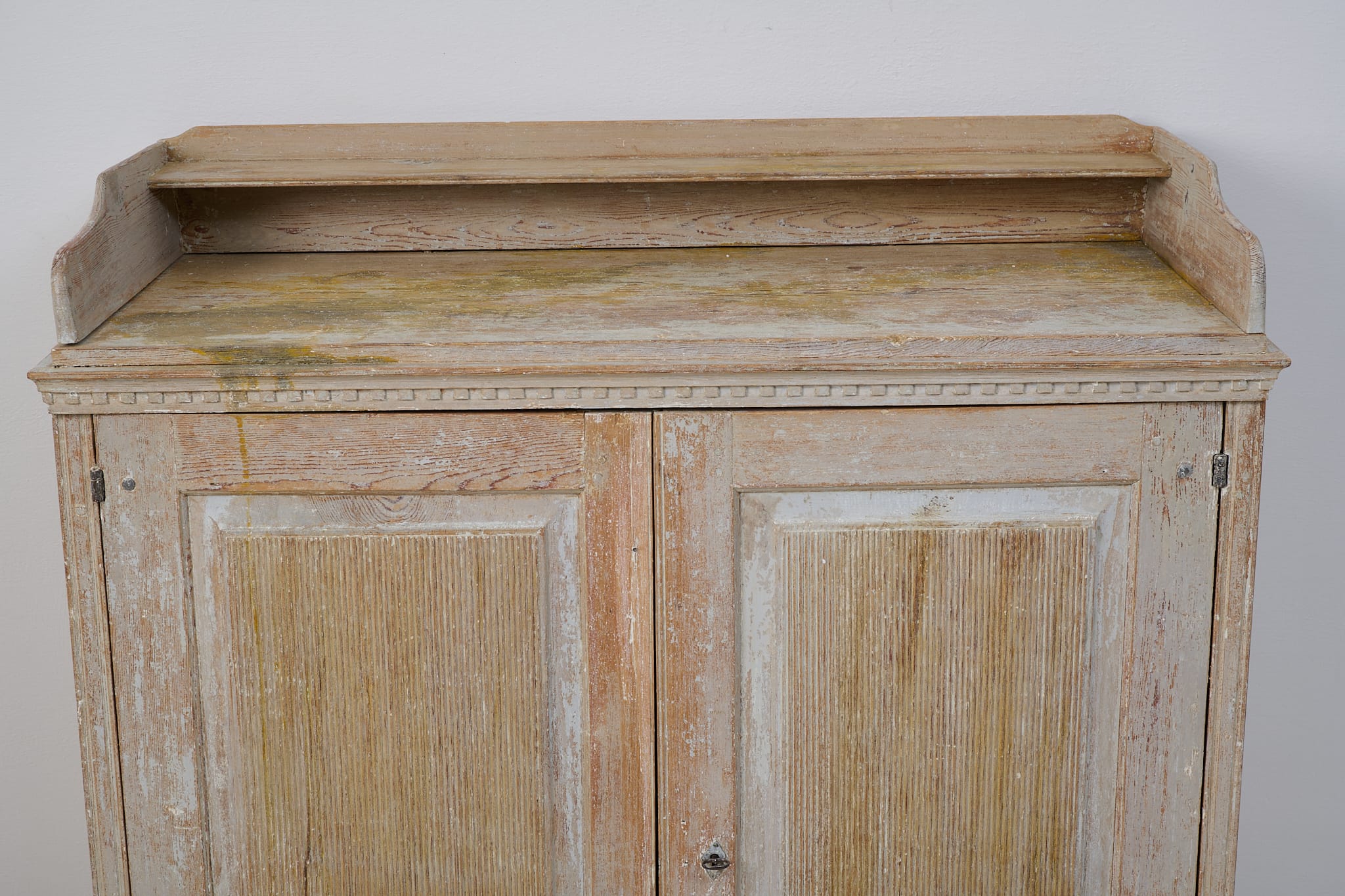 Large genuine Gustavian sideboard from Northern Sweden, made around 1810. The sideboard is crafted from solid pine and scraped by hand down to the original paint. It is adorned with carved wooden decor, and an unusual detail is that the short ends also feature a completely fluted design. Original lock and key in working condition. The interior has two drawers at the top and shelving below. One shelf has some discolouration, about 200 years ago someone spilled writing ink inside. The measurements include the trim. The height to the table top is 117 cm, and with the back shelf and trim adding another 14 cm, the total height is 131 cm.