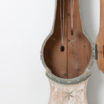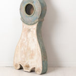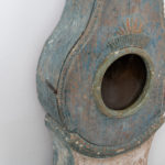 Northern Swedish Mora clock in rococo style with painted pine case made around 1820 to 1830. The blue paint is original from the early 1800s. The clock has natural wear and an authentic patina after 200 years of use. Decorated with wooden details carved by hand. The clock is unusually thin and originally around the early 1800s it was common to attach the clocks to the wall by a big hook. Hence the keyhole shaped hole at the top of the back. The mechanism along with the weights and pendulum are serviced but we don’t leave any guarantees on the future function. Healthy and solid frame with a minor dry crack along the door – see detail picture, the crack does not affect the function of the door.