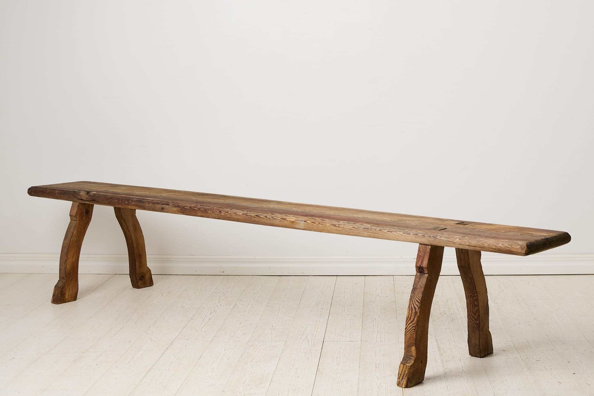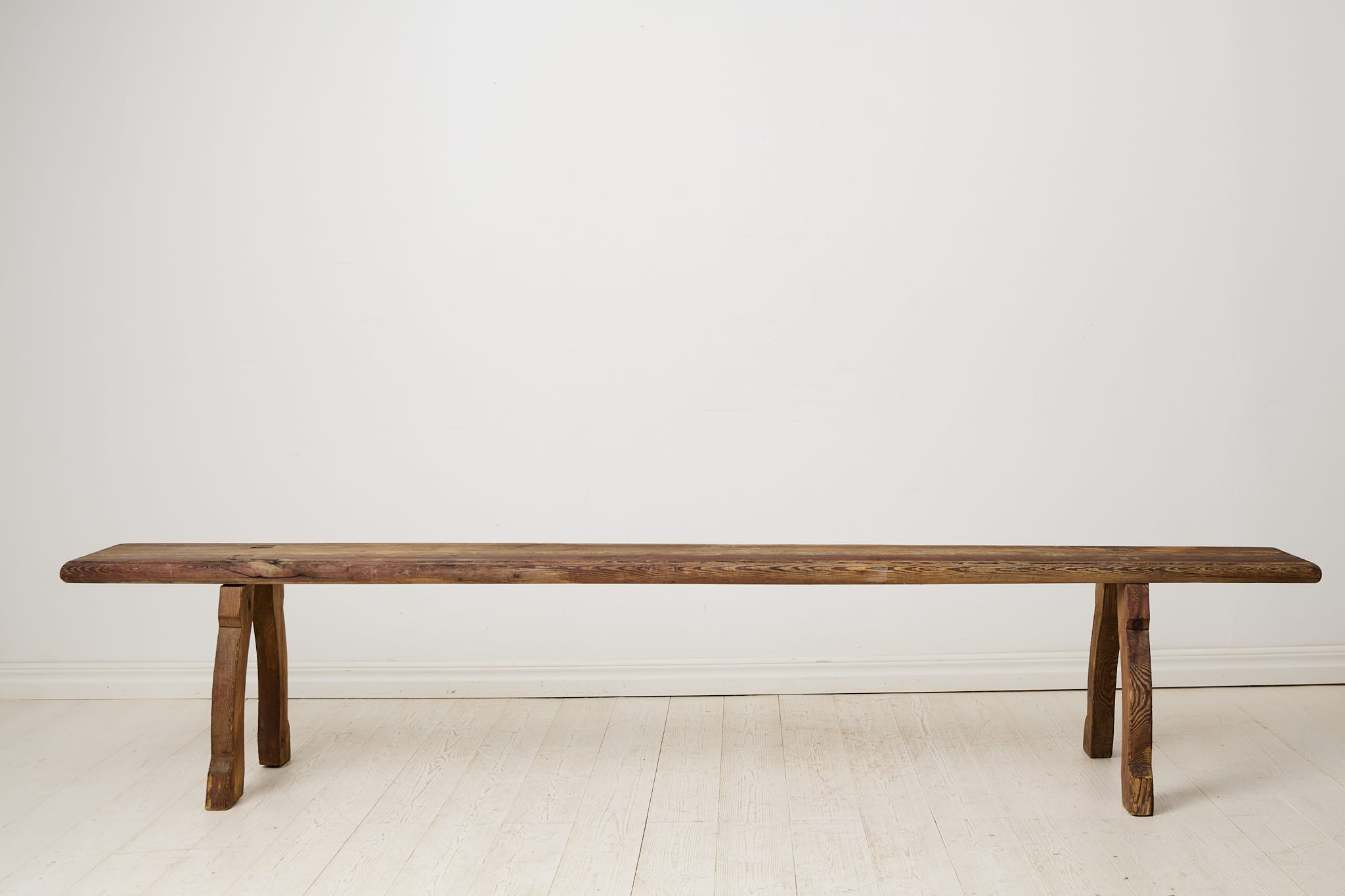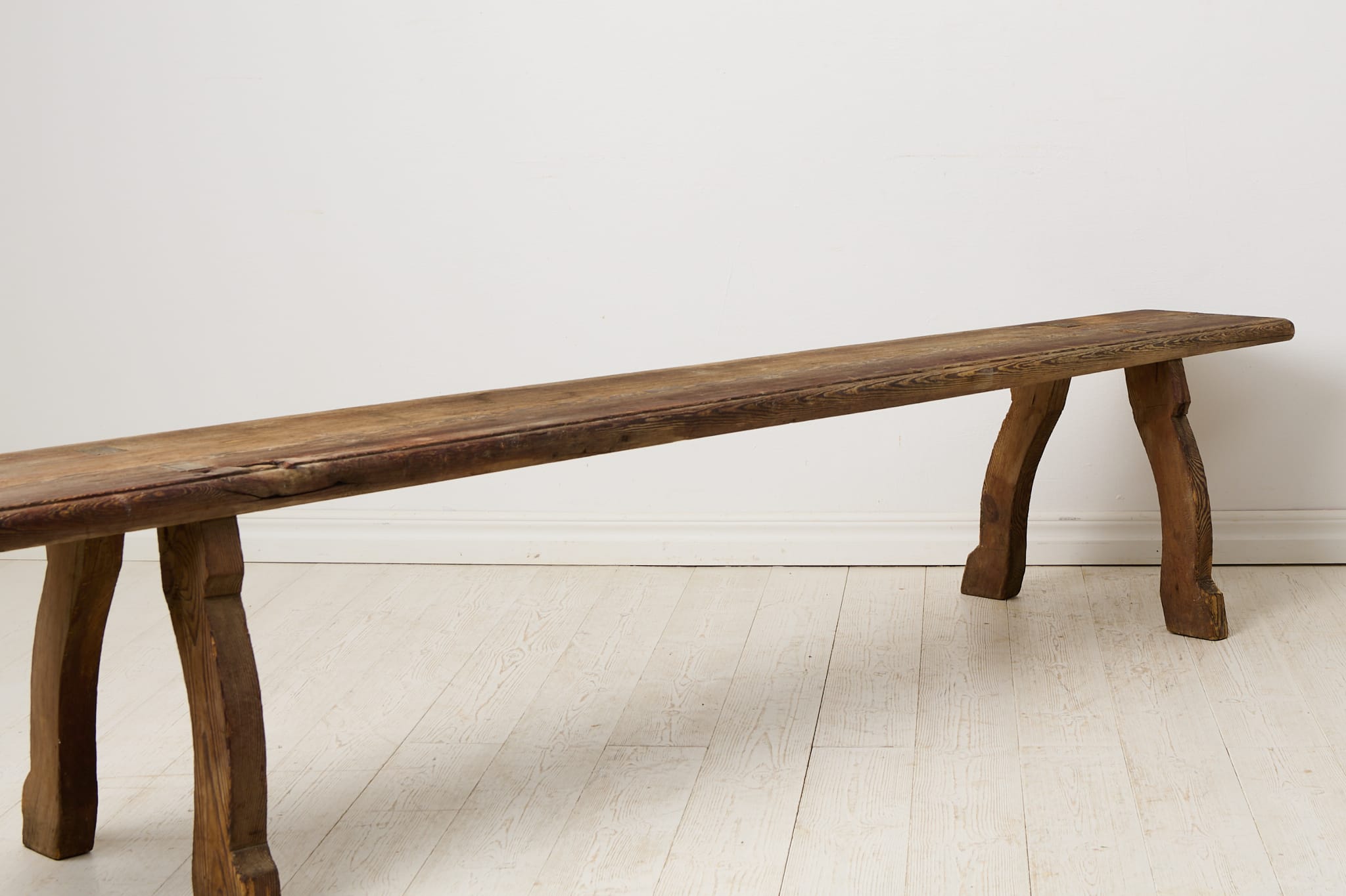 Primitive rustic Swedish bench from the early 1800s. Made in northern Sweden from pine, the bench has never been painted and the patina has naturally darkened after 200 years of use. Frame in solid pine. Healthy and stable. Some smaller loss of material by one of the legs – see picture. Nothing that affects function or stability.