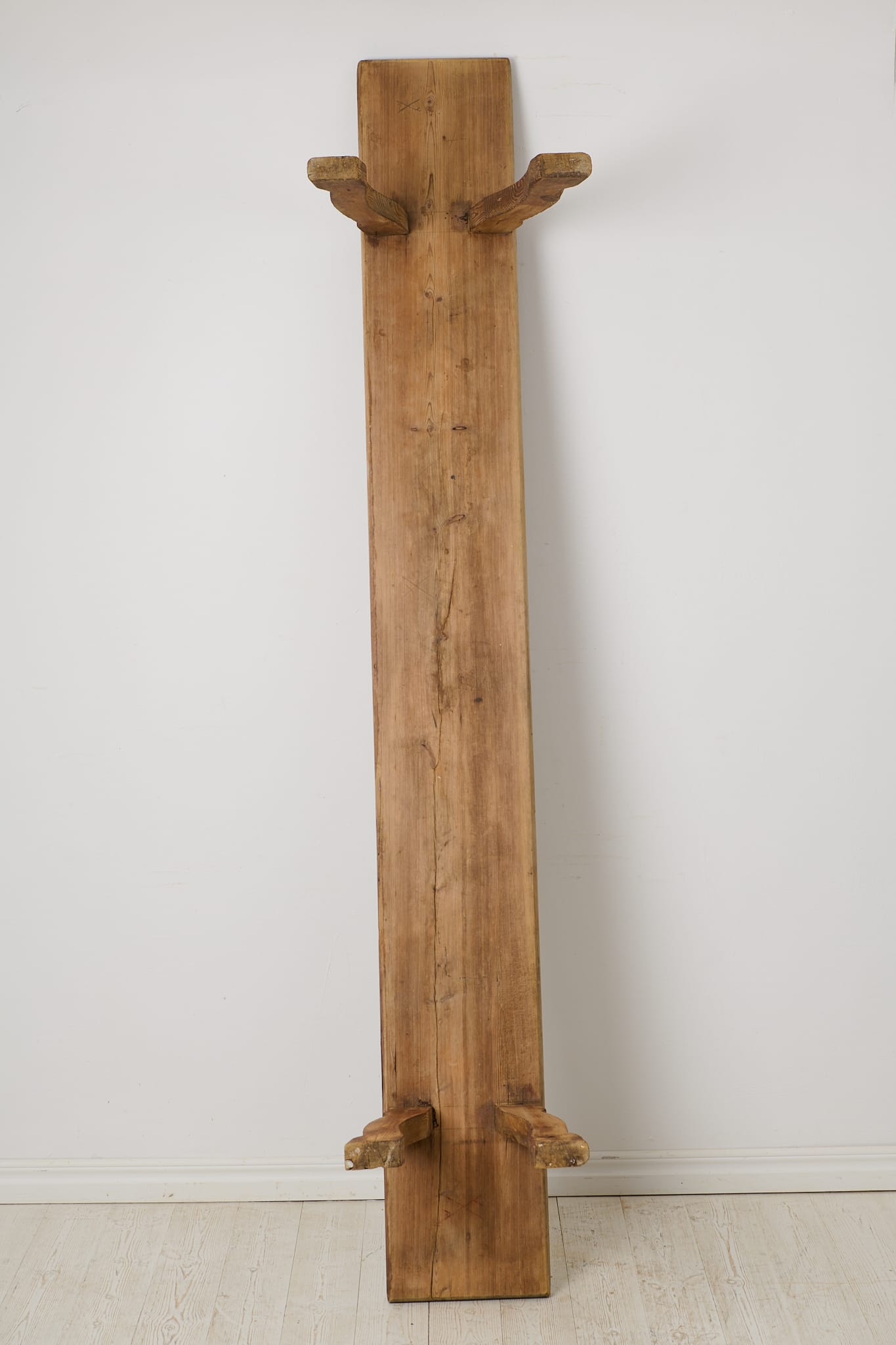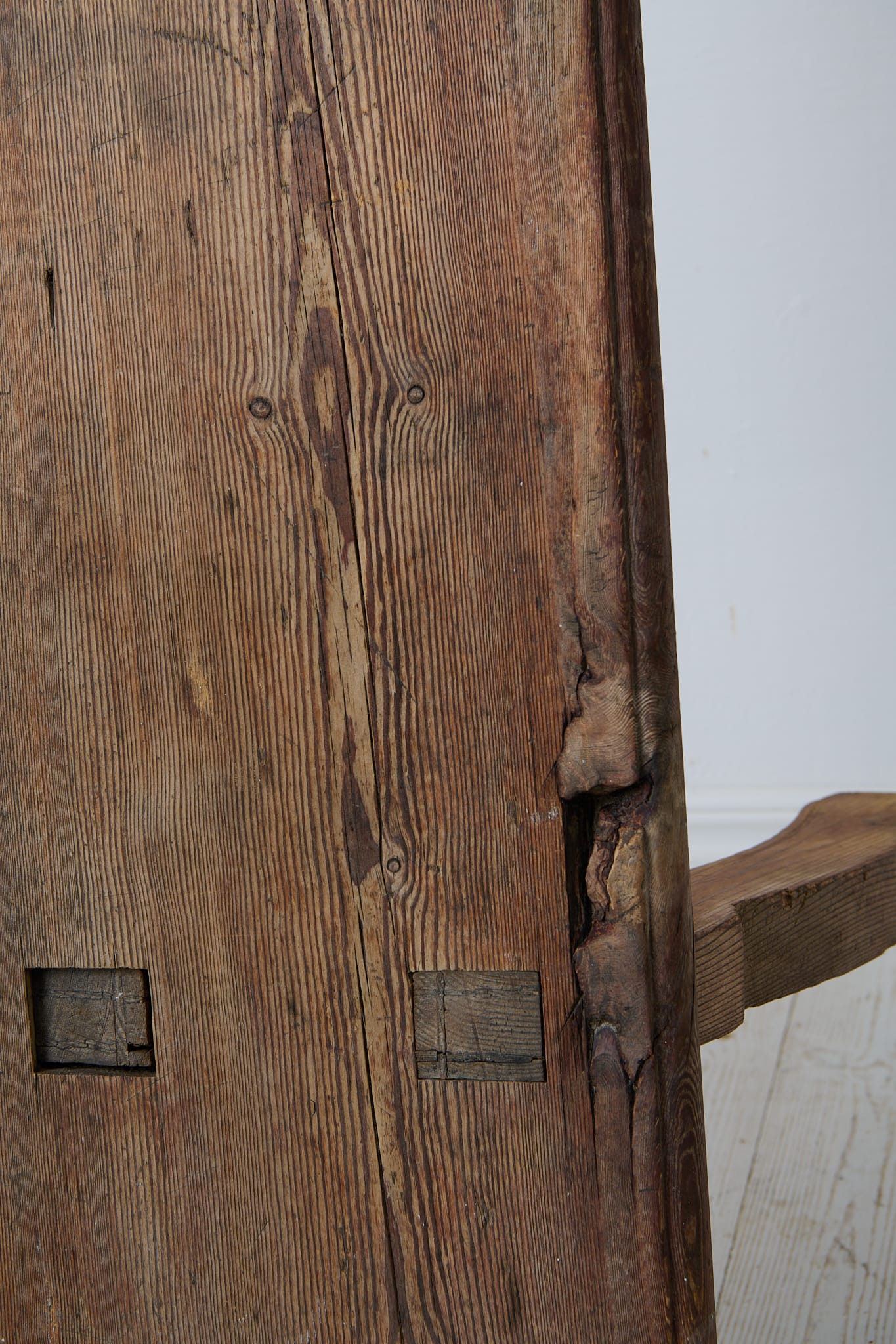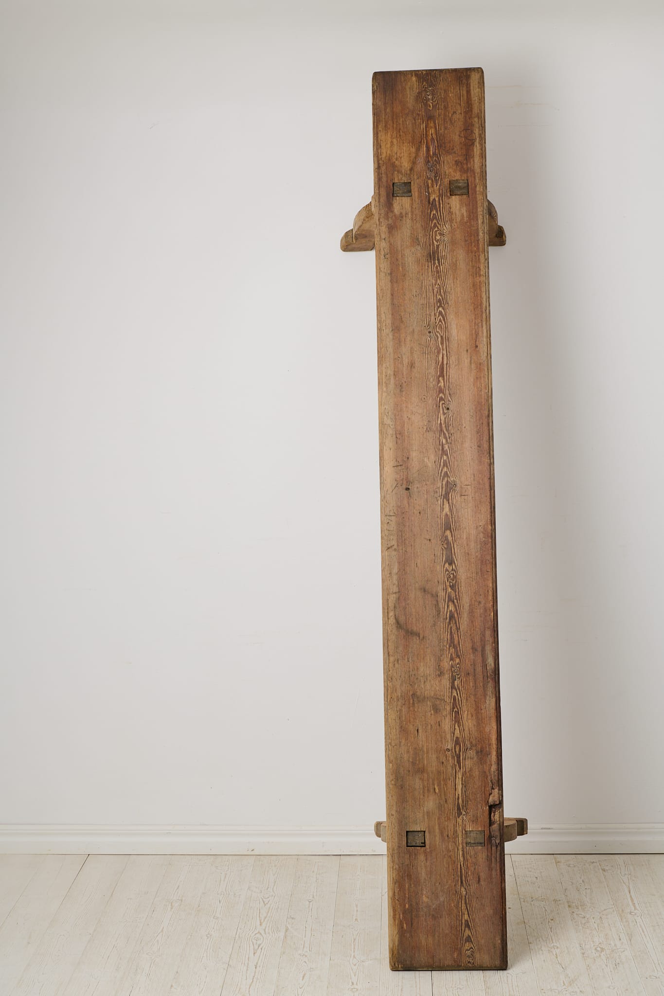 Primitive rustic Swedish bench from the early 1800s. Made in northern Sweden from pine, the bench has never been painted and the patina has naturally darkened after 200 years of use. Frame in solid pine. Healthy and stable. Some smaller loss of material by one of the legs – see picture. Nothing that affects function or stability.